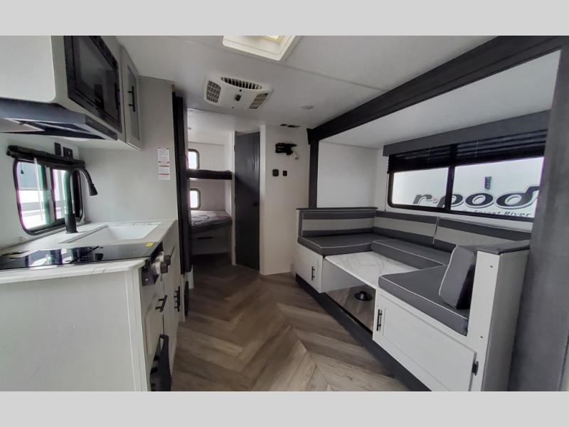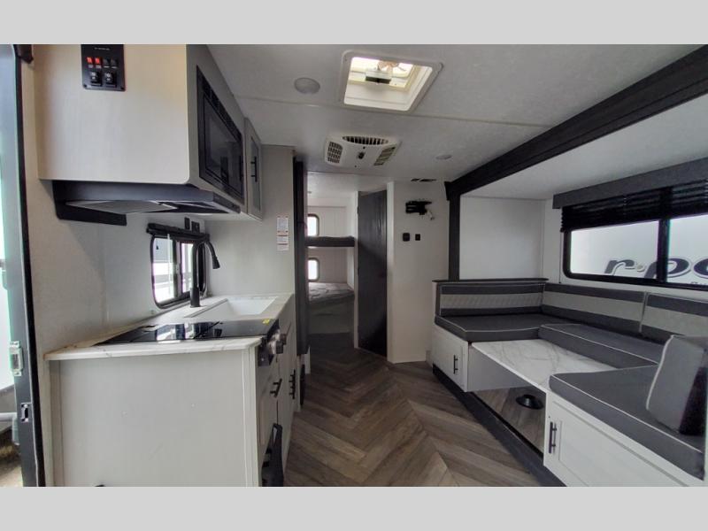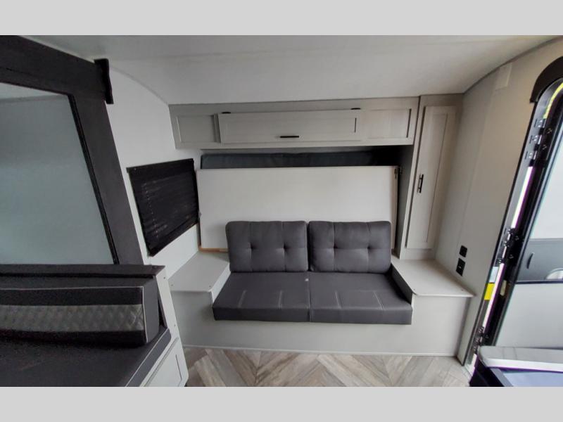 Let all of your adventures be wild with this Salem FSX travel trailer! The U-shaped dinette rests upon a single slide so that it can move out of the way and allow you to cook freely in the kitchen. You'll appreciate having an additional lounge spot on the sofa when the Murphy bed is folded away during the day, and for fun meal prep in the great outdoors, simply walk outside to the outdoor kitchen where you can grill up some chicken and veggies for dinner. You can also travel confidently knowing that everyone will have a comfortable place to sleep because of the double-size bunks that have been included.