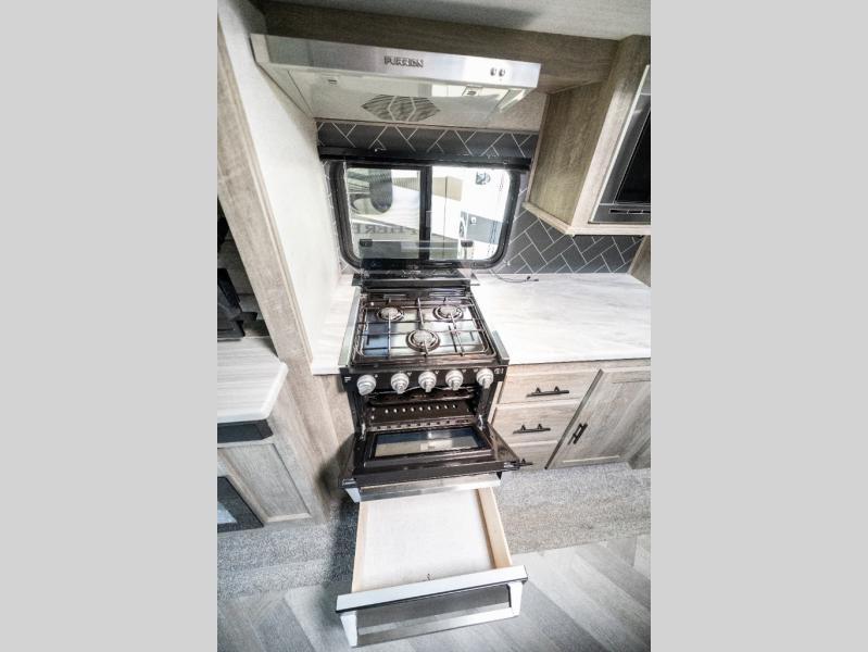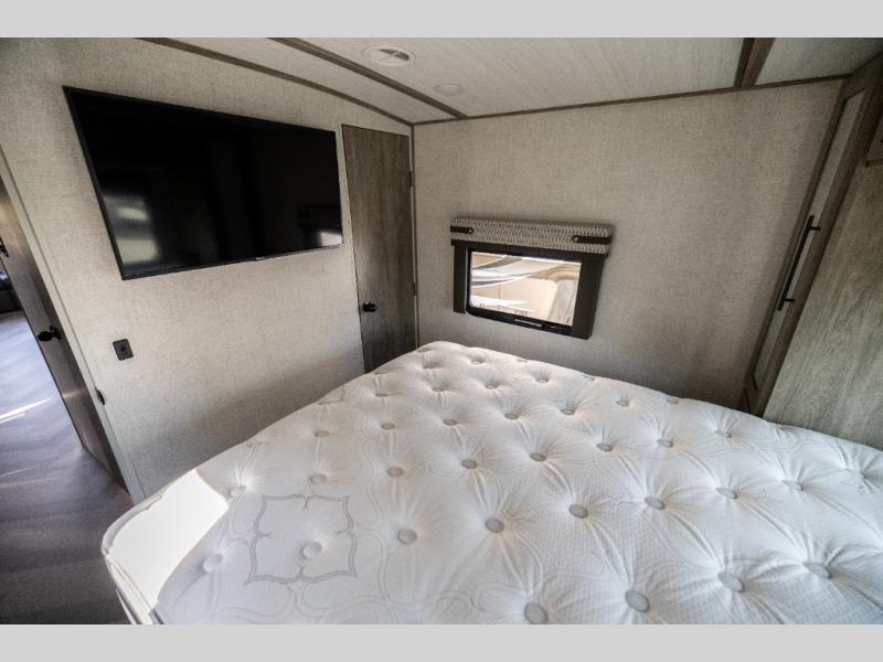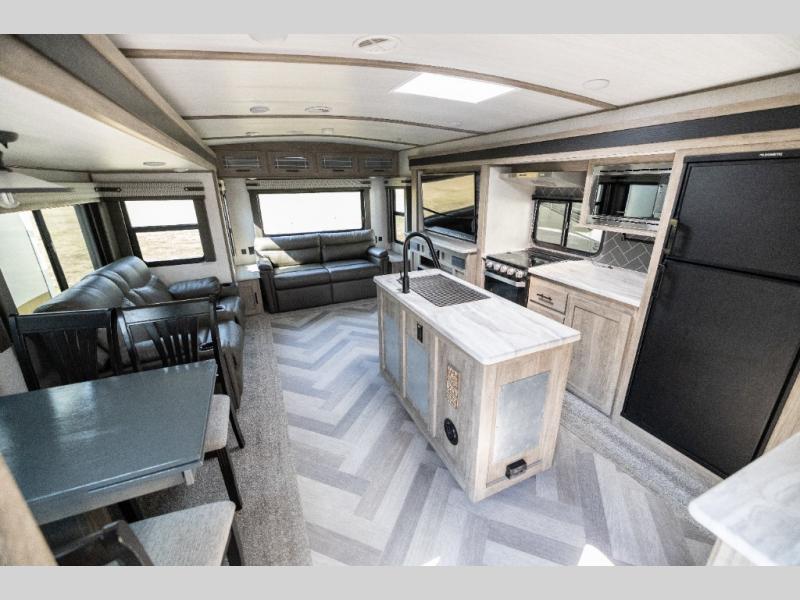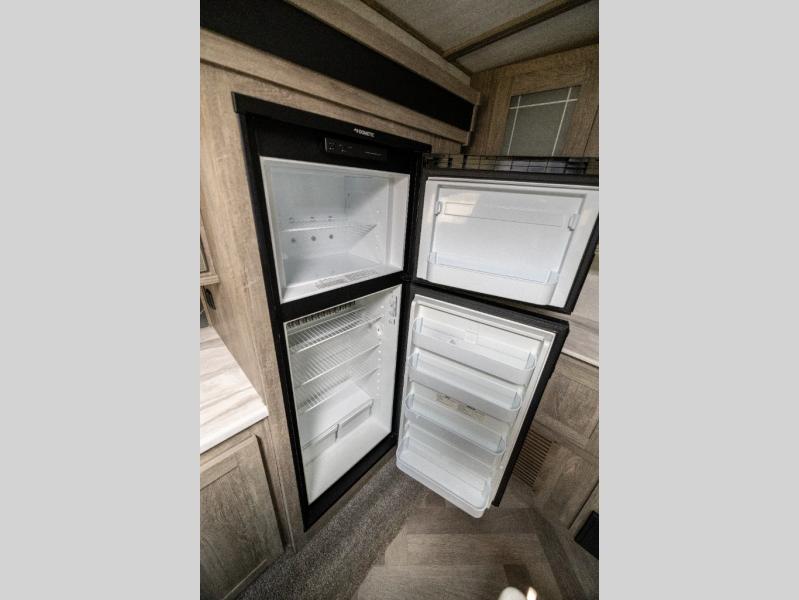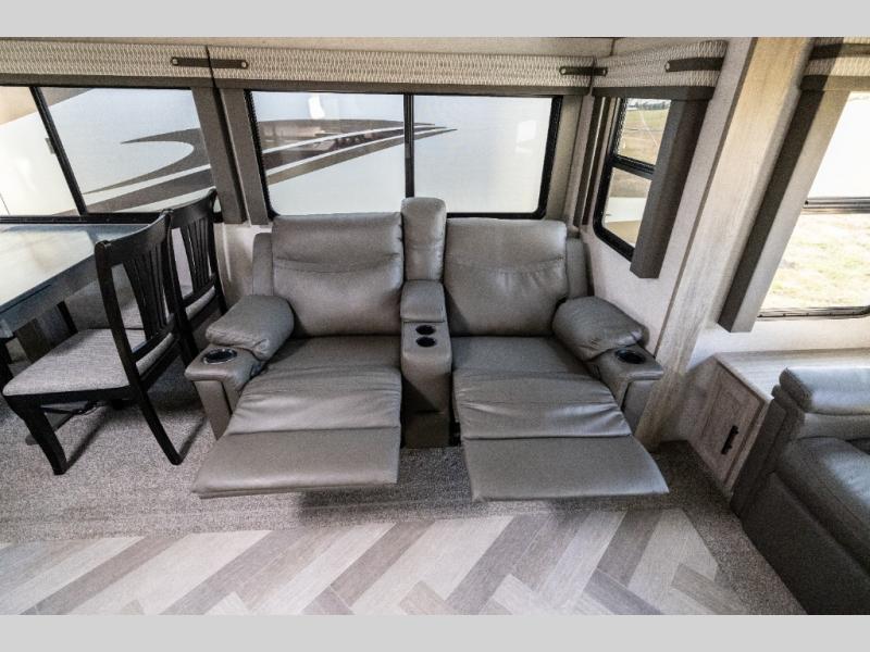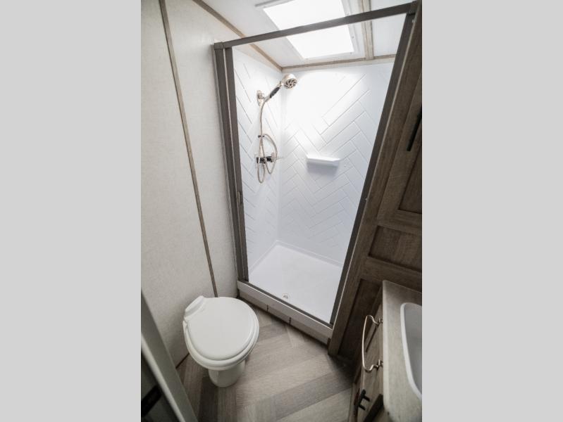 Step inside this luxurious travel trailer and see all that it has to offer! You will enjoy a good night's rest each night on the queen bed with wardrobes on either side to keep your hanging clothes wrinkle free, and if you have a couple of guests then you can convert the rear tri-fold sofa or the booth dinette into a sleeping space. The 30" x 36" walk-in shower with a skylight above invites you to take a hot, steamy shower after a fun-filled day outdoors. Once you're cleaned up, you can grab some leftovers from the 10.7 cu. ft. residential refrigerator and warm it up in the microwave then head to the theatre seating and watch your favorite movie on the 50" LED TV with a 32" glass front electric fireplace below!