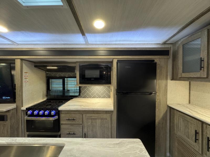 Step inside this luxurious travel trailer and see all that it has to offer! You will enjoy a good night's rest each night on the queen bed with wardrobes on either side to keep your hanging clothes wrinkle free, and if you have a couple of guests then you can convert the rear tri-fold sofa or the booth dinette into a sleeping space. The 30" x 36" walk-in shower with a skylight above invites you to take a hot, steamy shower after a fun-filled day outdoors. Once you're cleaned up, you can grab some leftovers from the 10.7 cu. ft. residential refrigerator and warm it up in the microwave then head to the theatre seating and watch your favorite movie on the 50" LED TV with a 32" glass front electric fireplace below!