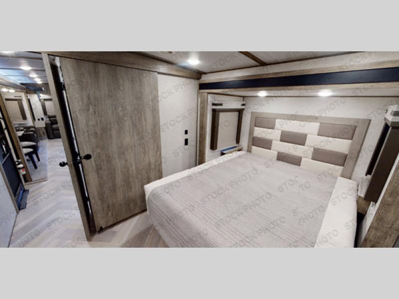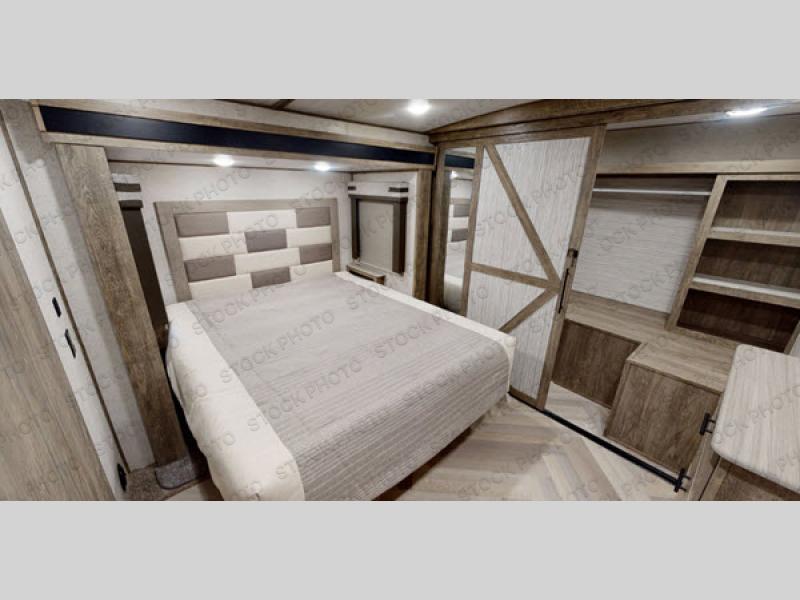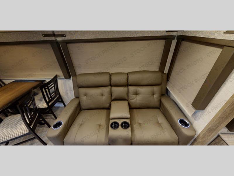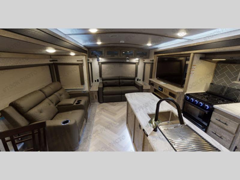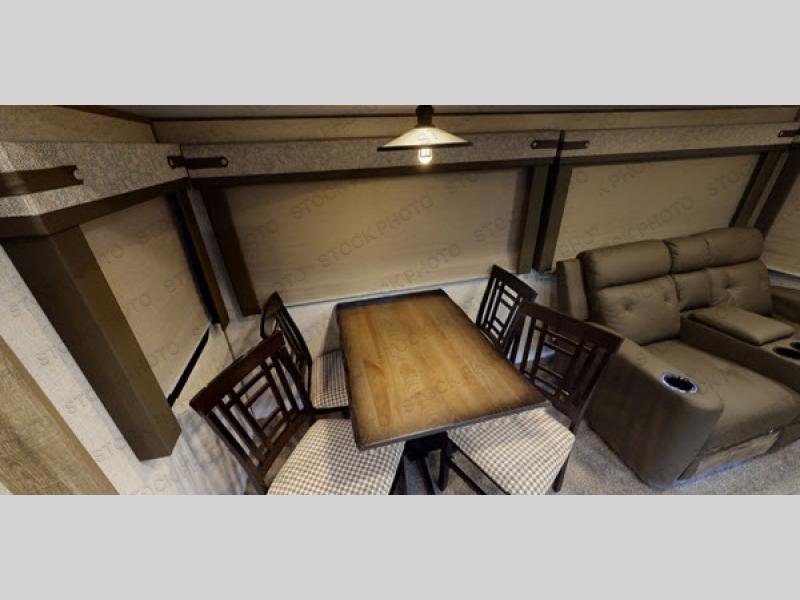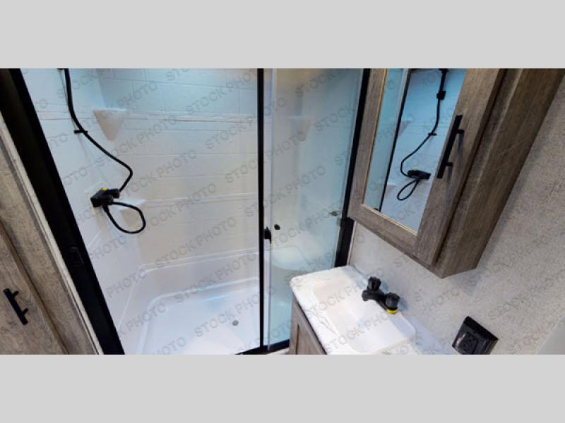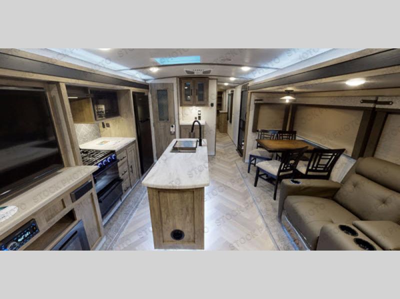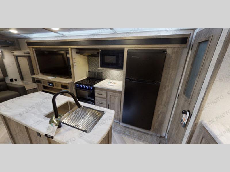 This travel trailer is decked out in features you will love like the front full wall wardrobe with a space prepped for the optional washer and dryer inside the front private bedroom! The full bathroom has everything you will need to get squeaky clean each morning including a residential walk-in shower with a skylight to let in some natural lighting. There is a hutch for you to store your dishes and a kitchen island to make meal prepping even easier. Once you have created a delicious meal, you can head to the booth dinette and enjoy eating it there comfortably while enjoying your view out of the panoramic window!