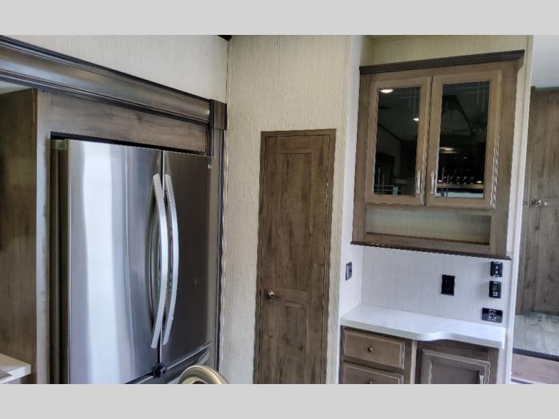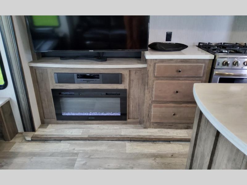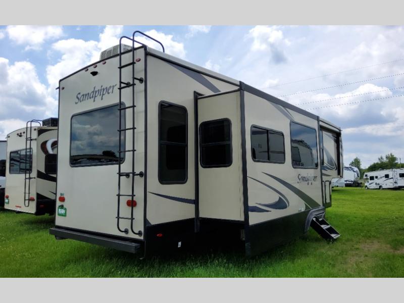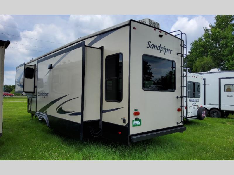 You won't want to pass up your chance to camp in this luxurious Sandpiper fifth wheel! With a rear living area featuring a tri-fold hide-a-bed sofa with end tables, theater seating with cupholders, and an entertainment center with a fireplace, you can enjoy relaxing in true comfort each evening. Inside the full bathroom there is a walk-in shower with a seat, a vanity sink, and a linen closet so that you can start each morning off clean and fresh. Once you're ready for the day, head to the coffee bar area to brew up your favorite cup of coffee then head outdoors and enjoy a relaxing morning while you sit under the 16' electric awning with LED lights!