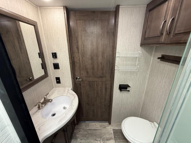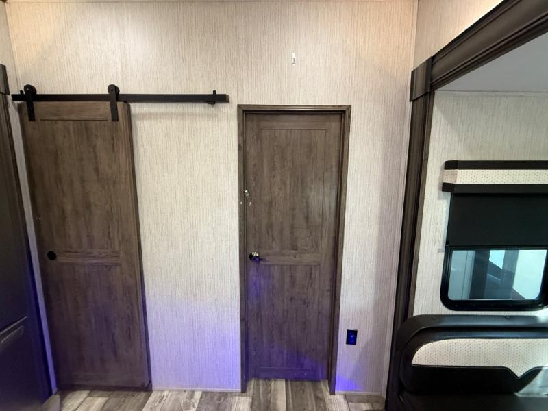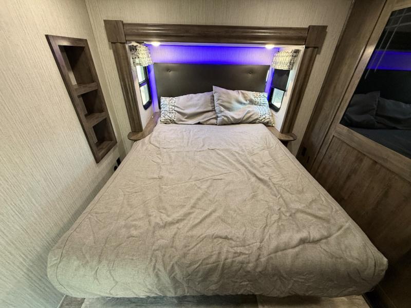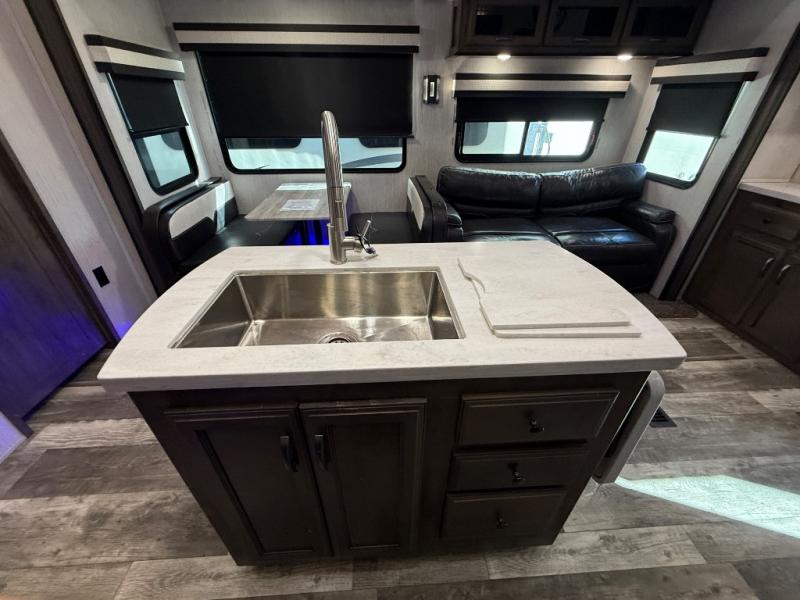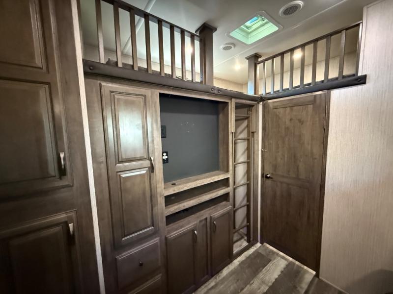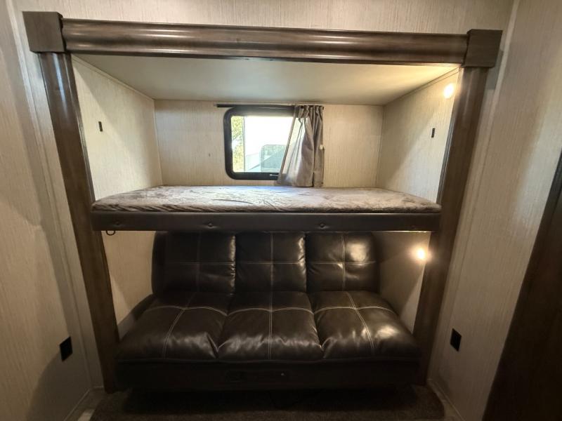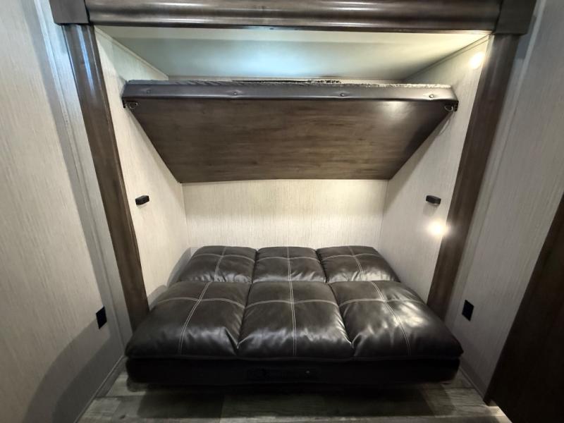 For the ultimate family-friendly fifth wheel, you will want this four-slide Sandpiper fifth wheel. With two entry doors, you can easily access the inside of this model from the rear or the front. Your kids will enjoy their own space with the bunkhouse suite that has its very own full bathroom, as well as a loft above. Outside you can enjoy the shade from the 15' electric awning with LED lights and the convenience of the exterior kitchen with a bumper-mount swivel gas grill.