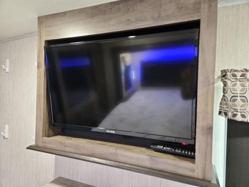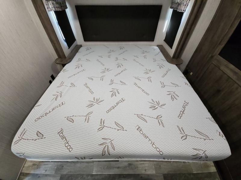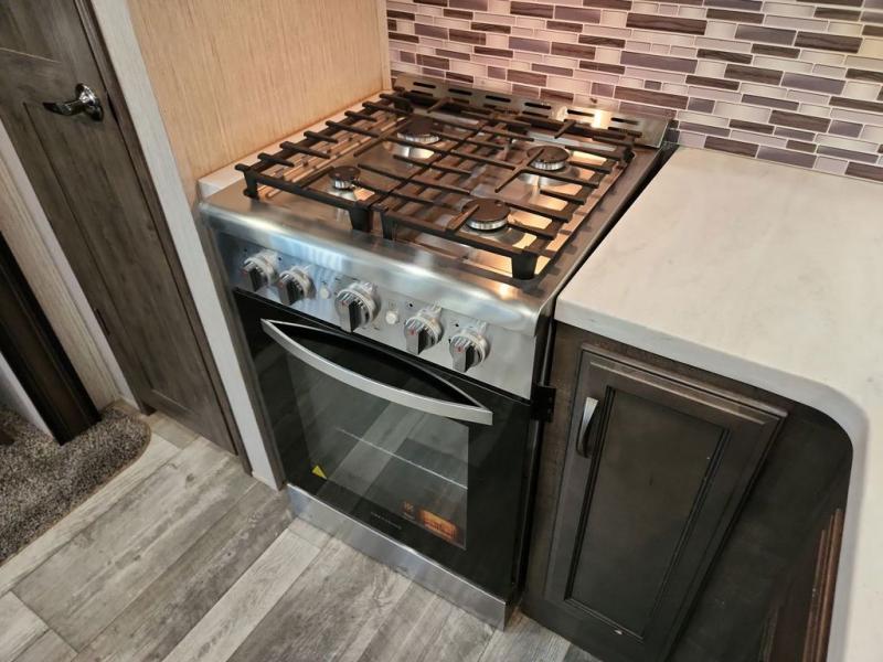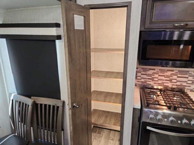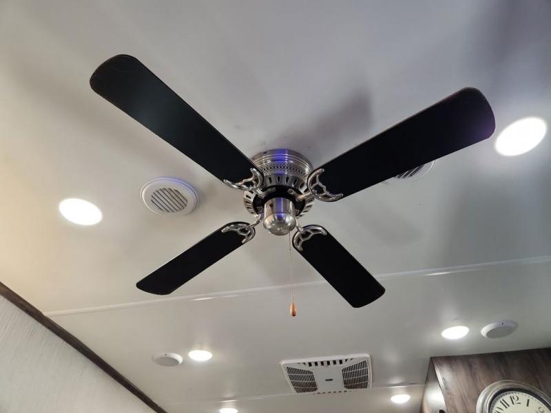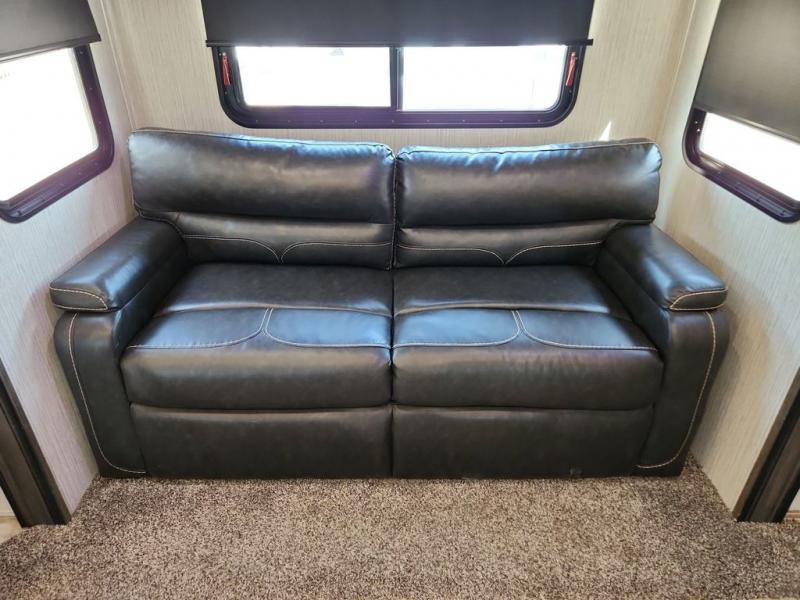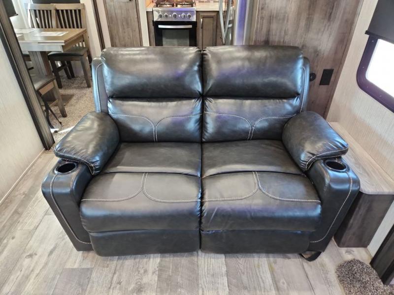 You're going to love camping with this rear kitchen Sandpiper fifth wheel! There is lots interior space and counter space for you to create your best meals, and the free-standing dinette is the perfect place for you to enjoy eating them or playing some card games. The middle living area features plenty of seating for everyone and even some sleeping areas between the two tri-fold hide-a-bed sofas and the theater seating across from the entertainment center with a fireplace and a ceiling fan above it all. The full bathroom is equipped with everything you will need to get squeaky clean each morning including a double sink vanity so that two can get ready at once!