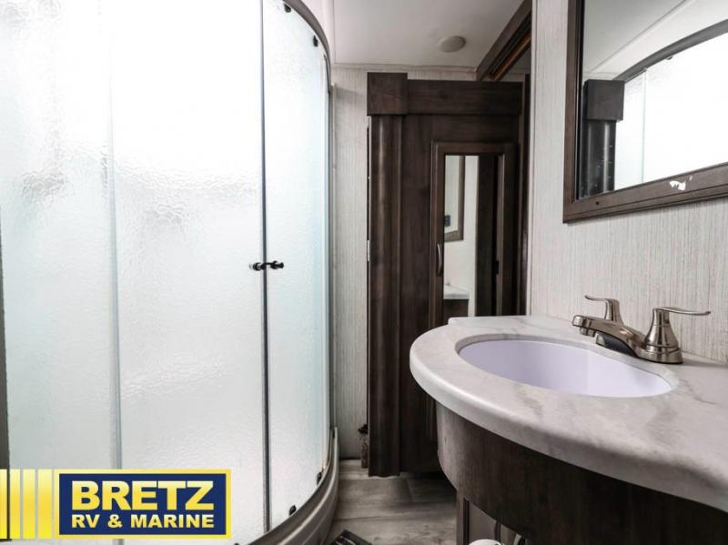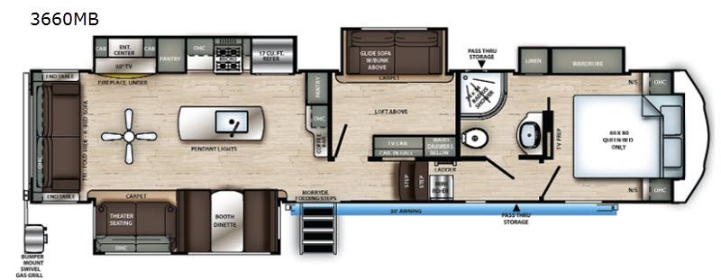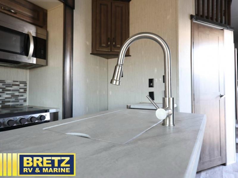 Perfect for a couple or family, this fifth wheel offers a private bunkhouse that is centrally located and full of features allowing you to utilize this room as you wish. From the glider sofa with bunk above, plus the wardrobe and cabinets, you can relax on the furniture and offer extra sleeping to your guests. The loft area gives you even more space for storage or sleeping. This kitchen provides everything you will need to feed everyone including an oversized island with pendant lights, a 17 cu. ft. refrigerator, two pantries, and a coffee bar. There is plenty of seating on the furniture including a booth dinette, plus there is a 50" flat screen TV to watch and a fireplace as well as ceiling fan for whichever temperature you are wanting inside. Next, place your larger items in the pass-through compartment, relax under the "One Touch" electric awning, and make a meal using the bumper mount swivel gas grill.