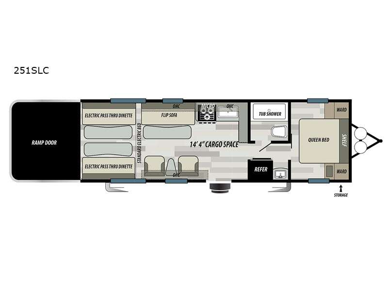 Step inside this Sandstorm toy hauler with fiberglass exterior and experience a camping trip like none other! With 14' 4" of cargo space and 1,200 lb. tie-downs mounted to steel, you can be sure your off-road toys will make it to your destination safely. There is plenty of room for everyone with the rear electric bunk, an electric pass-through dinette below the bunk, a flip sofa with a table beside it, and a front private bedroom with a queen-size bed. Plus, there are two lounge chairs with a table in between for you to set your coffee on while you read a good book. The separated bath makes it easy for one person to clean the mud out of their ears while another washes up for dinner!