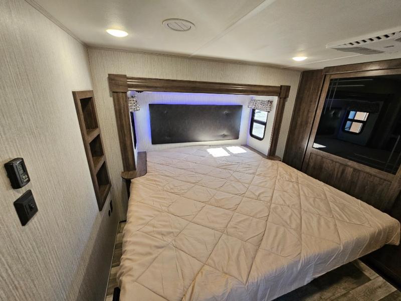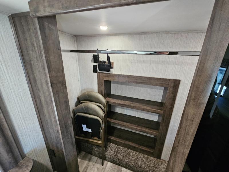 It won't be long before this Sierra fifth wheel has you absolutely hooked! This modern unit has just about everything you could think of: a private bedroom with a king-size bed, a bunkhouse suite with its own half bathroom, a comfortable living area with opposing slides for extra space, and an outdoor kitchen for summertime grilling. Plus, the kitchen is simply wonderful because it comes with many amenities to take the stress out of camp cooking, like a coffee bar, a pantry, an island with pendant lights above, a residential range with four burners, and a residential refrigerator.