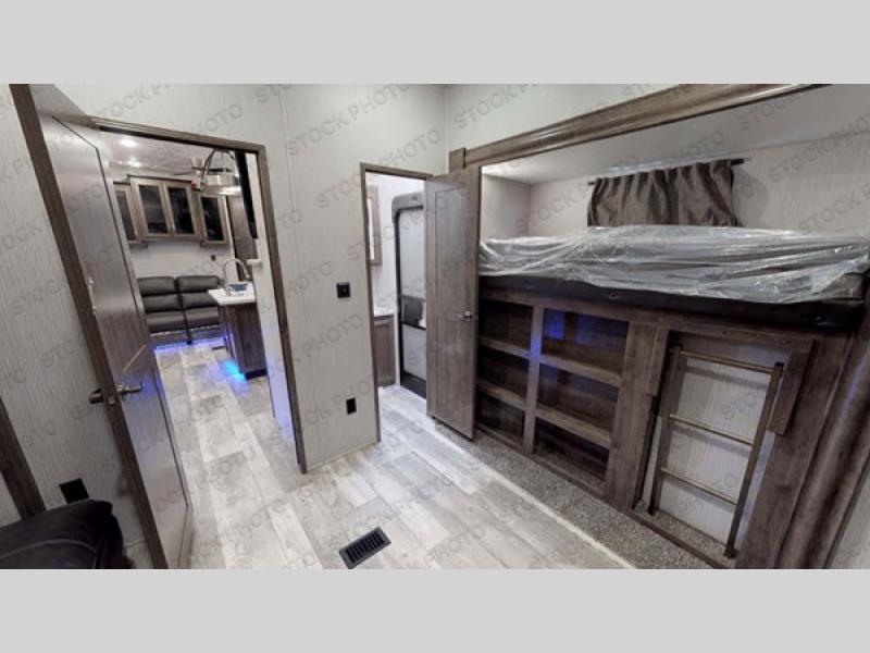 A spacious living and kitchen area allows the whole family to gather for meals at the booth dinette, the tri-fold hide-a-bed sofa and theater seating as well as at the kitchen island to enjoy dining together. Everyone can also find their camping chairs from the drop frame pass-through compartment and place them under the 15' electric awning to dine outdoors. The cook may make several meals using the exterior kitchen and the full amenities inside from the four-burner cooktop to the 20 cu. ft. refrigerator. The half bathroom offers an interior and exterior entry for maximum convenience, and is within the private bunkhouse which includes two bunks, a glide sofa and two floor to ceiling wardrobes. And the master bedroom gives you your own queen bed, a large front wall wardrobe and the full bathroom is only a few steps down the hallway.