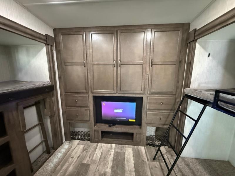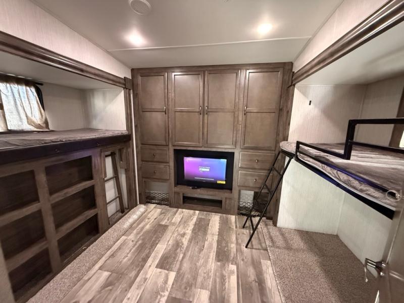 FREE DELIVERY & SETUP!! THIS BEAUTIFUL LIKE NEW 2021 FOREST RIVER SIERRA LUXURY 384QBOK IS A 5th WHEEL RV LOADED WITH LUXURY!! 41 LONG. 2 BEDROOMS, 2 BATHROOMS, 2 A/C, PLUS 5 SLIDES, MASTER SUITE. BEAUTIFUL BATHROOM & CLOSET WITH WASHER/DRYER PREP. 4 REAR BEDS. LARGE LIVING AREA WITH THEATER SEATING & UPGRADED RECLINERS. ELECTRIC FIREPLACE & BIG FLAT SCREEN TV. BEAUTIFUL ISLAND KITCHEN with residential refrigerator, STAINLESS STEEL APPLIANCES, and LOTS OF CABINET STORAGE & A BIG PANTRY. FULLY ENCLOSED & HEATED UNDERBELLY. 4 SEASO