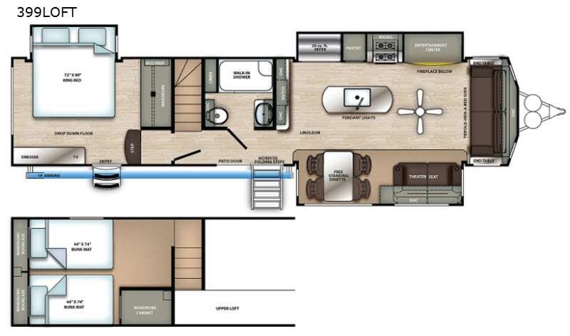 A loft makes any trip fun for the grandkids! They will have two bunk mats with a wardrobe/bookcase above each bed for their books or toys, plus a wardrobe/cabinet for clothes and shoes. Everyone can gather in the main living area that includes dual opposing slides for added space, a 50" LED HDTV and a fireplace, plus theater seats for all-around comfort. The chef of the family will have plenty of counter space to prep meals at the kitchen island, plus there is a hutch with cabinets to store dishes. Step down into the rear private bedroom where you can relax on the slide out king bed, and easily store your clothes in the large wardrobe or dresser!