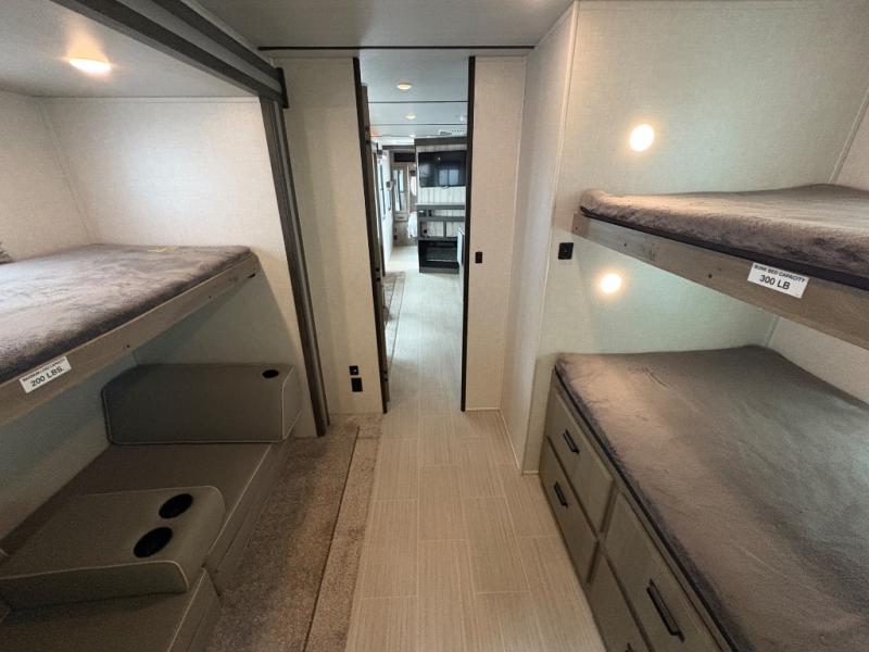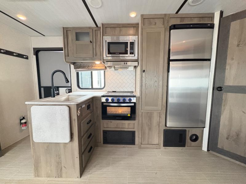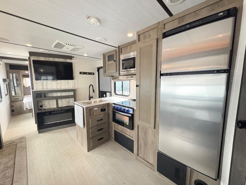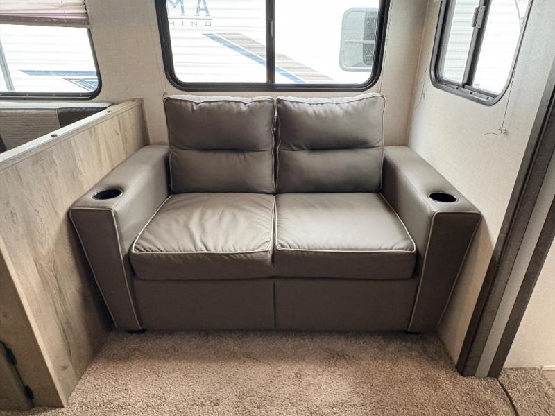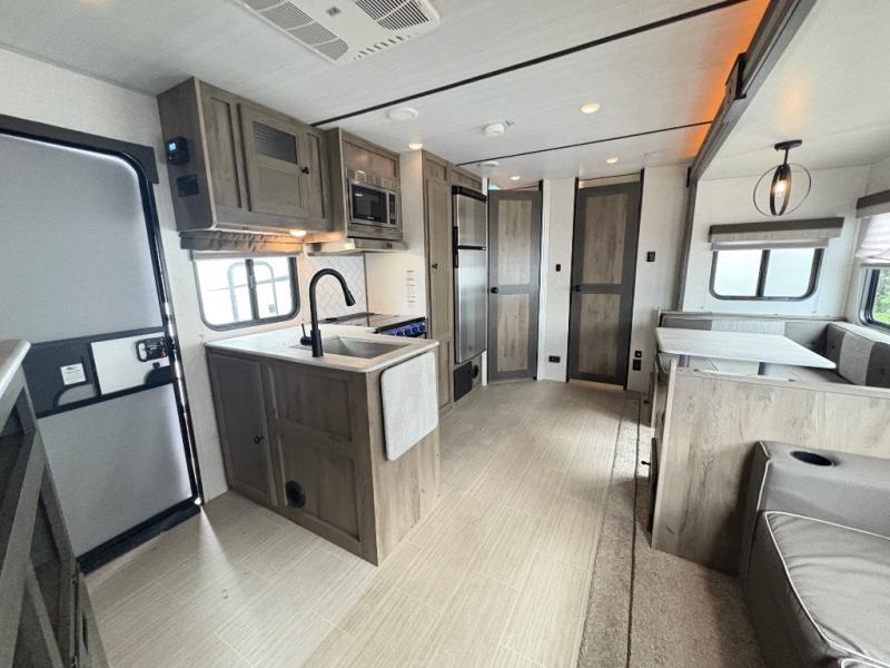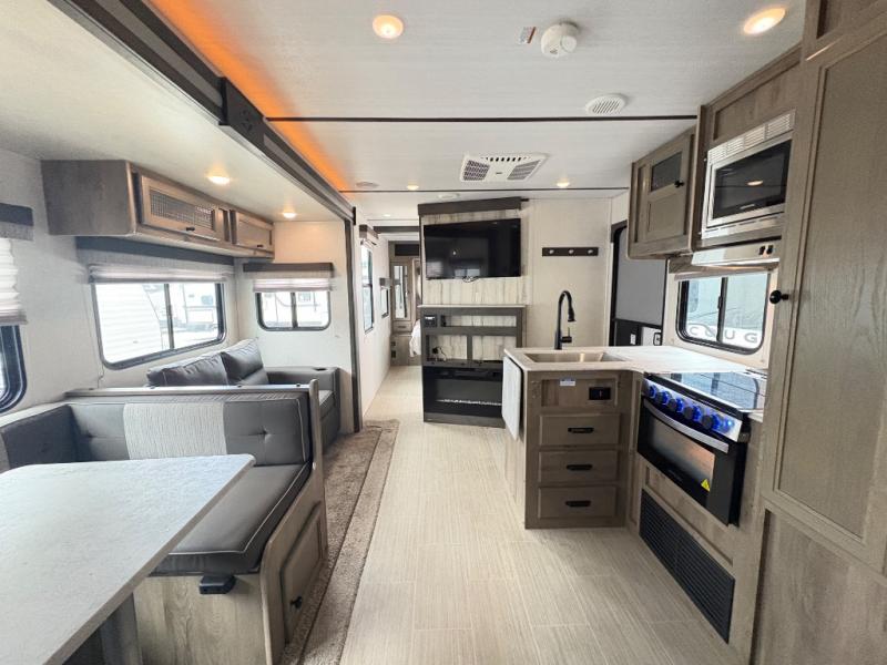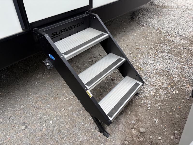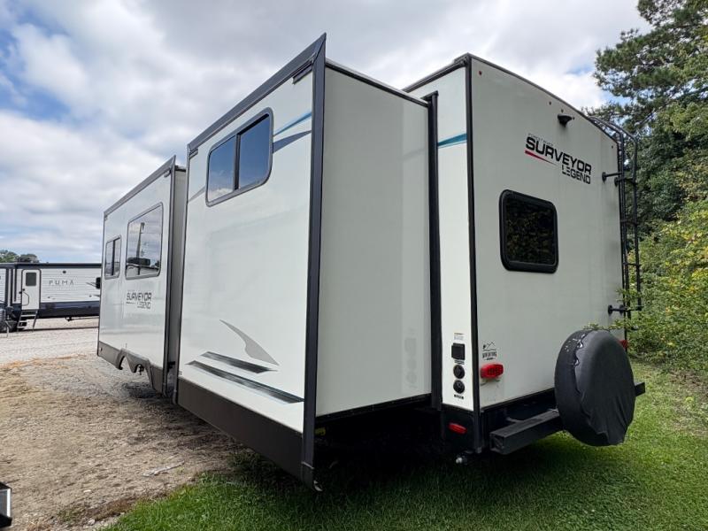 The Surveyor Legend 320BHLE combines comfort, convenience, and versatility for memorable camping trips. With a private front bedroom, rear bunkhouse, full and half bath, and a spacious living area with U-shaped dinette and sofa, this trailer sleeps your whole family comfortably. Exterior features like the outdoor kitchen, panoramic windows, and pass-through storage make it perfect for on-the-go adventures.