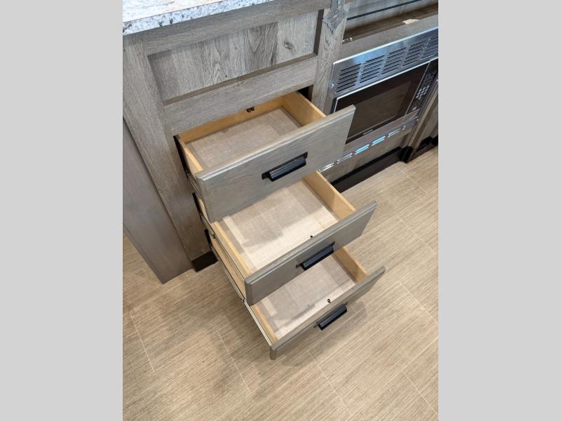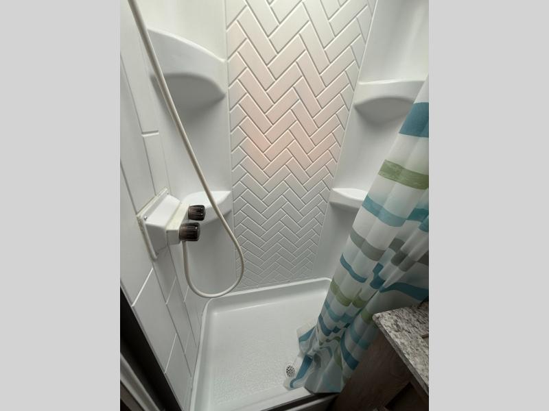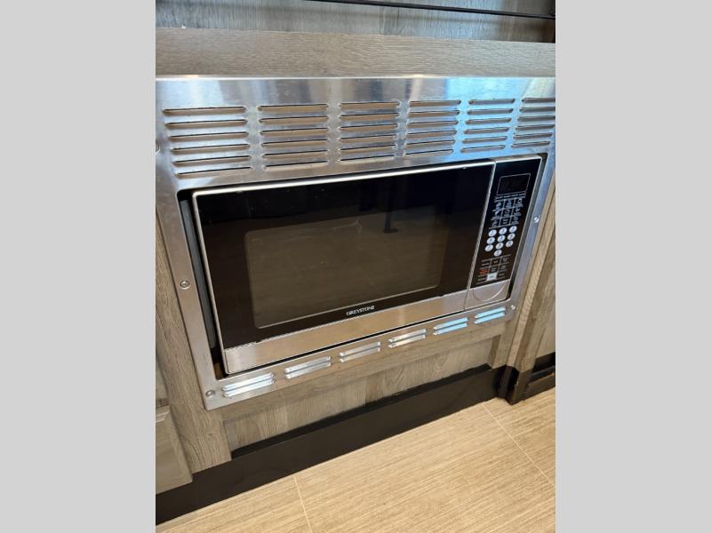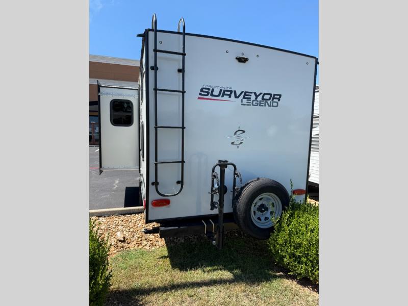 Only the Forest River Surveyor Legend travel trailer can inspire legendary adventures! The gel-coated fiberglass exterior is outfitted with front diamond plate protection, an integrated front windshield, preparations for rooftop solar power and a rear camera, and an adjustable platform step on the main entry. You'll be able to use the exterior LED speakers whenever you want to play music or a podcast, and the designer Shaw linoleum flooring is a quality base that will clean up easily if you track mud indoors. There are vented side windows in the slide outs so that you can bring in some fresh air, and each model is ready for cable/satellite.