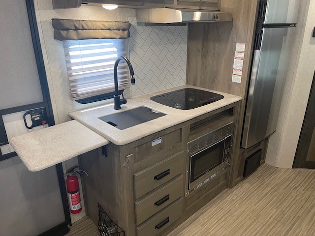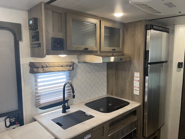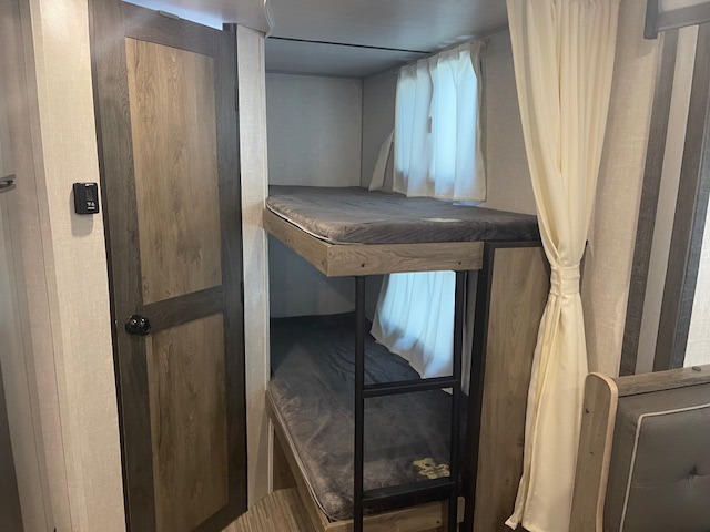 For a truly fun and relaxing camping trip, choose this Surveyor Legend Sub-4,000LB travel trailer that includes bunk beds for the kids. The queen bed at the front of the trailer is just the right size for a good night's rest. Everyone can gather at the booth dinette within the slide out for a meal together, and the dinette can also transform into an extra sleeping space at night. This trailer includes multiple overhead compartments and an exterior pass-through storage for your larger camping gear. After a long day of exploring, clean up in the full bath before heading outside to sit under the 15' electric awning with family or use the outdoor kitchen to create something delicious.