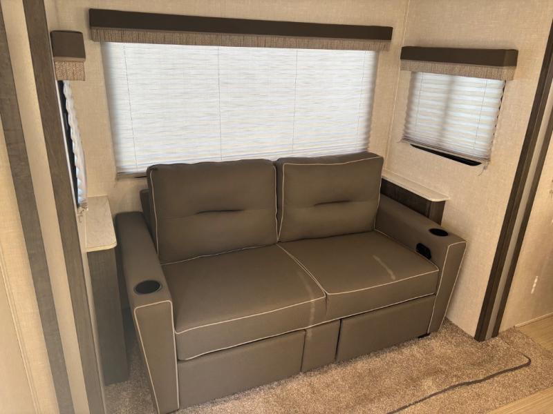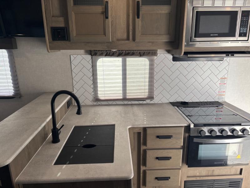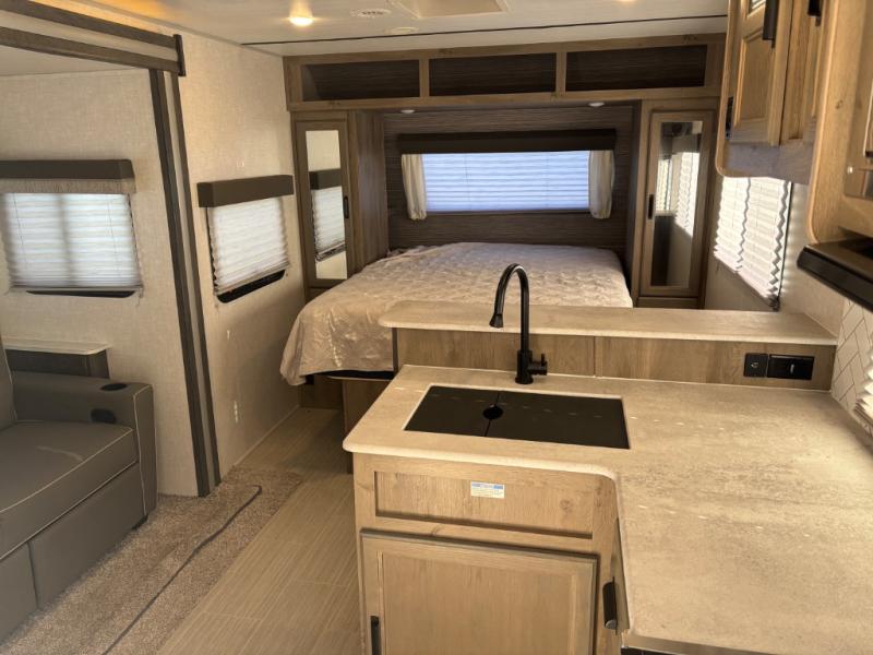 This Surveyor Legend travel trailer is perfect for the adventurous couple that likes loads of storage! The kitchen features a cozy L-shaped countertop with ample overhead storage so that you can easily make your favorite campsite meals and snacks. A bar top with two stools is perfect for breakfast or coffee, and you can keep the cook in the family company while they are at the sink or the three-burner range with gas oven. The 75" x 42" booth dinette slides out to offer added walking space, and it can easily convert to added sleeping space for an overnight guest. Up front, you will find a queen bed for nighttime comfort, wardrobe space along each side, and an overhead shelf. Outside beneath the queen bed, you have space to store your outdoor games and camping gear in the pass-through storage, so leave nothing you want or need at home!