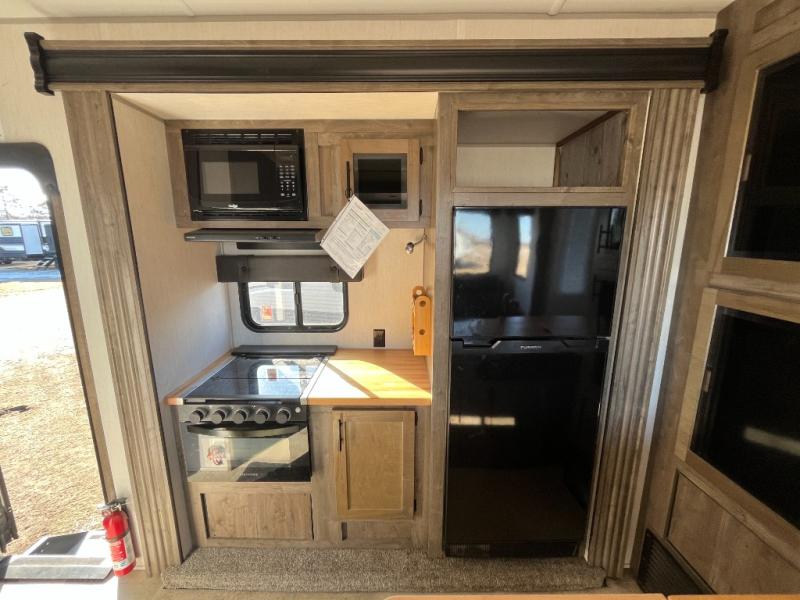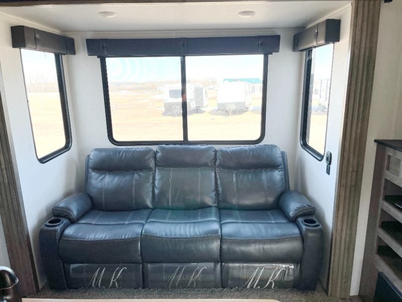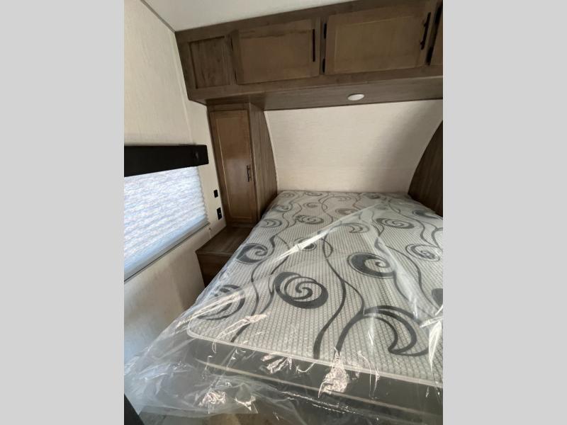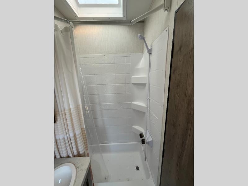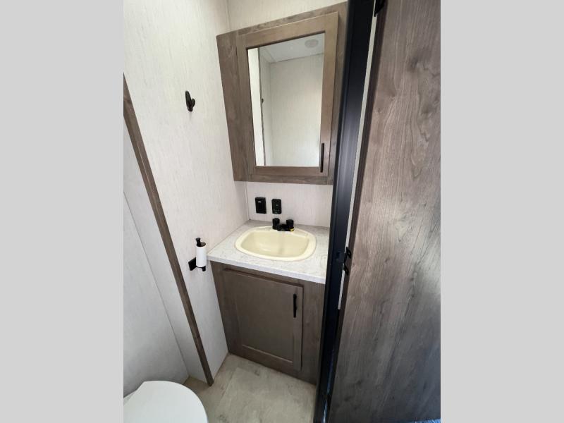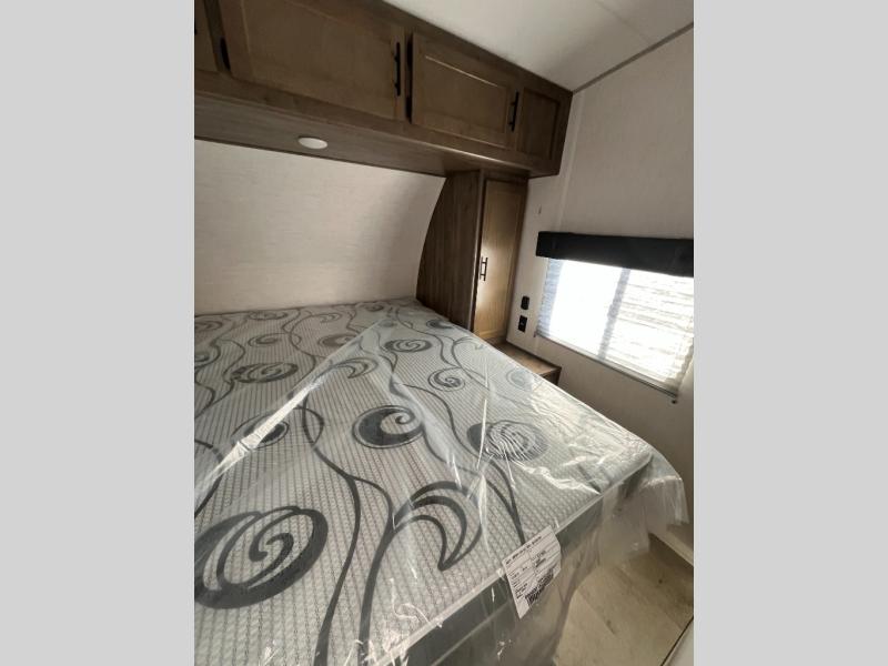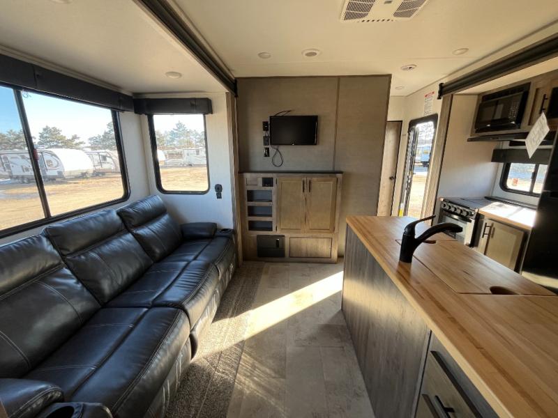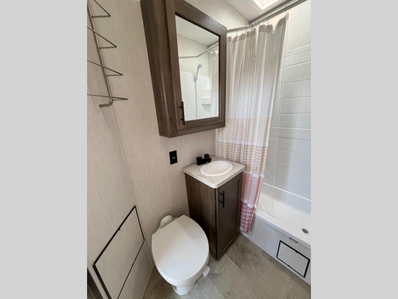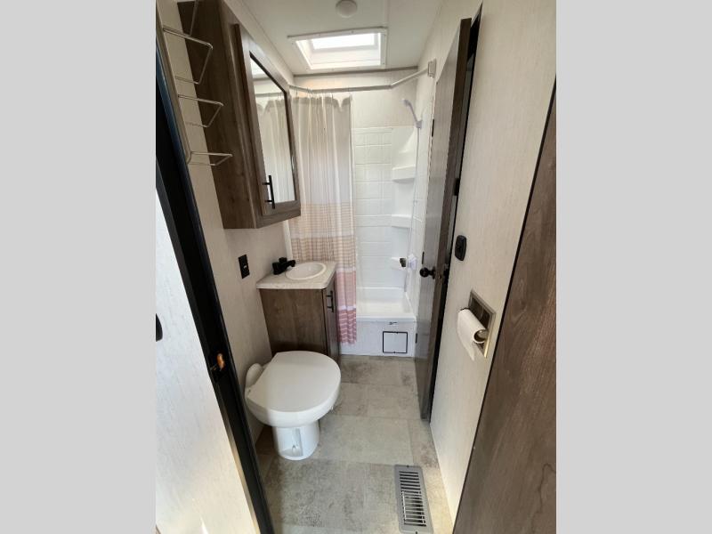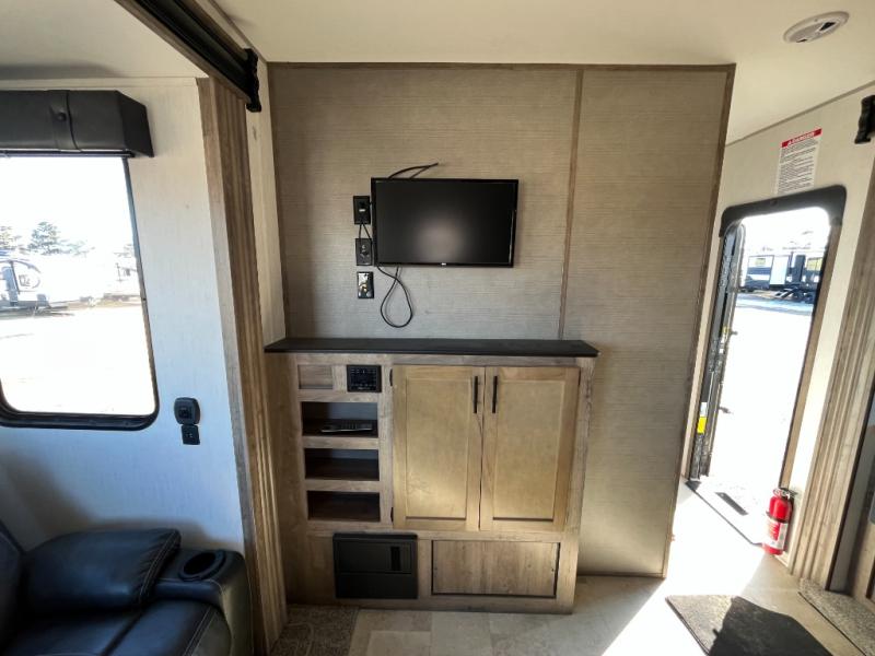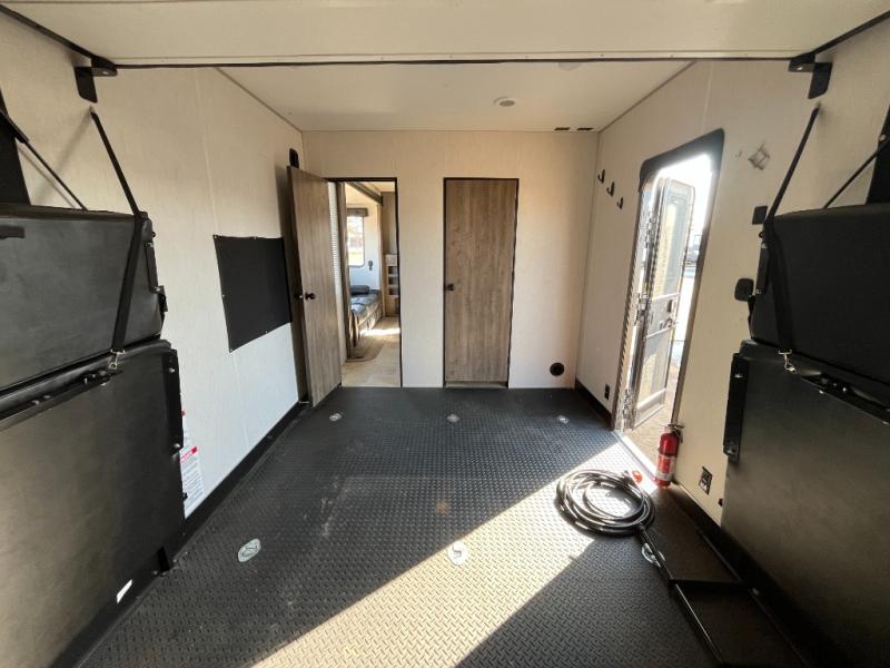 The 12' 6" separate garage in this toy hauler means you don't have to worry about gas and oil in your main living quarters. You can sleep four in the garage with the two roll-over sofas and the quick set queen bed system, plus there is a half bath here for convenience. Head to the main living area where you'll find dual opposing slides for added space, a large pantry to store snacks galore, and a sofa with a table where you can enjoy your coffee at each morning. The full bath has its own private entrance into the front bedroom where you'll enjoy the Rogue king bed and dual wardrobes to keep your clothes wrinkle-free!