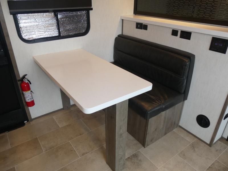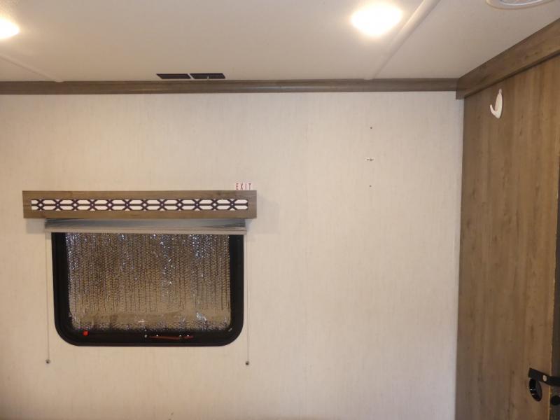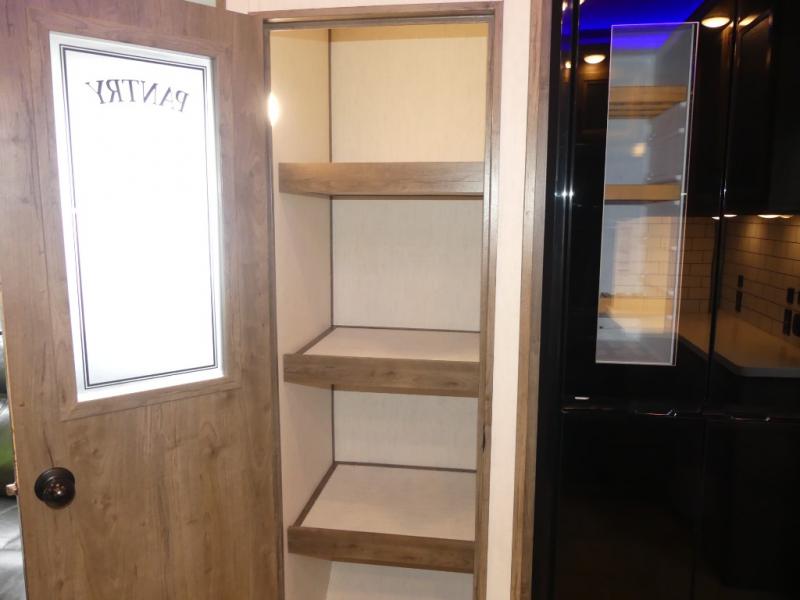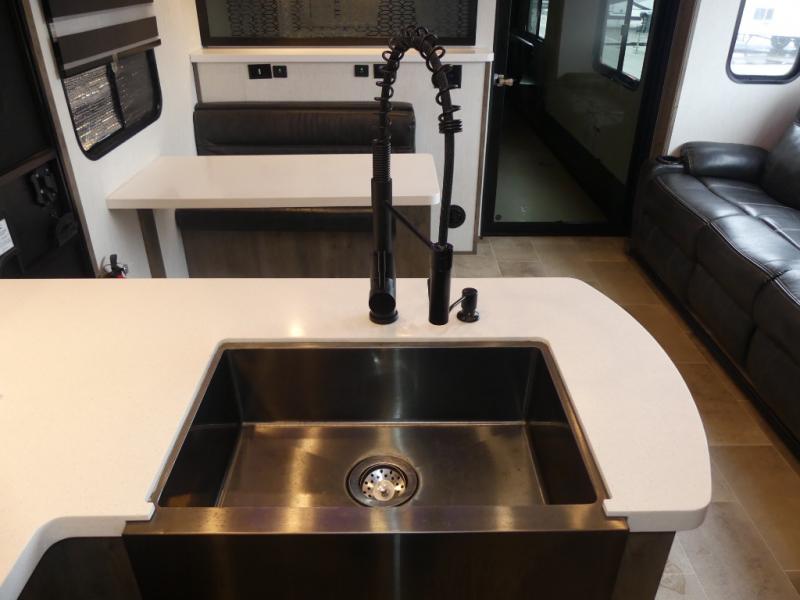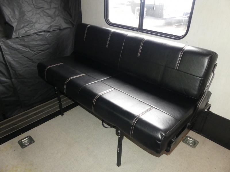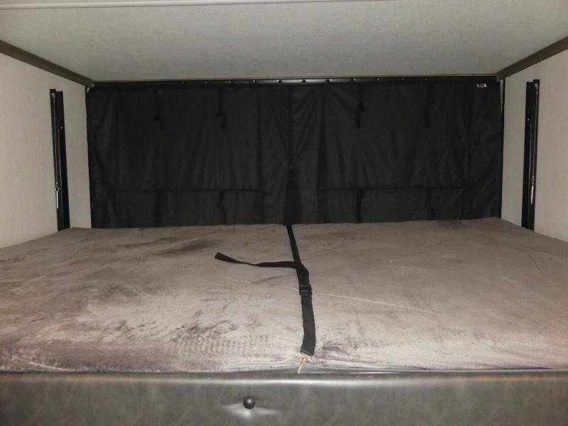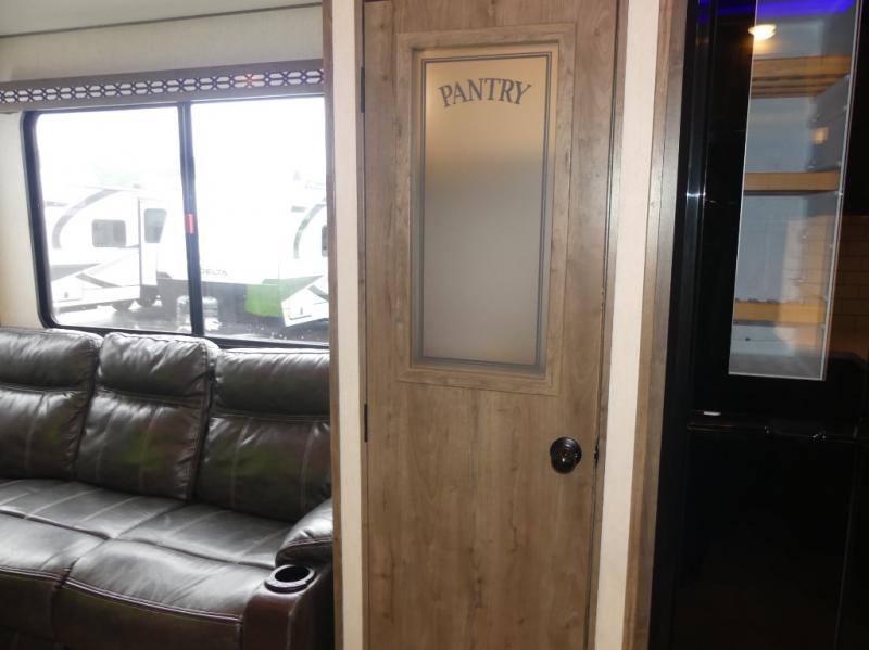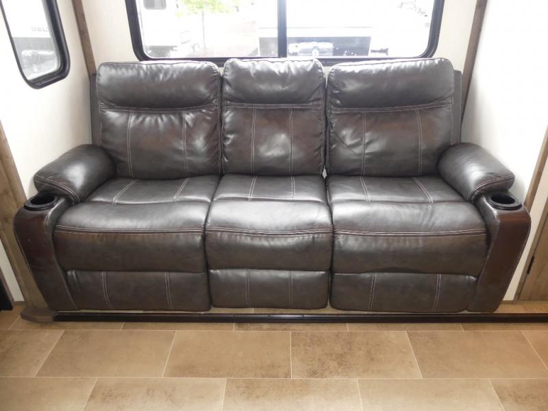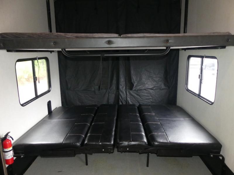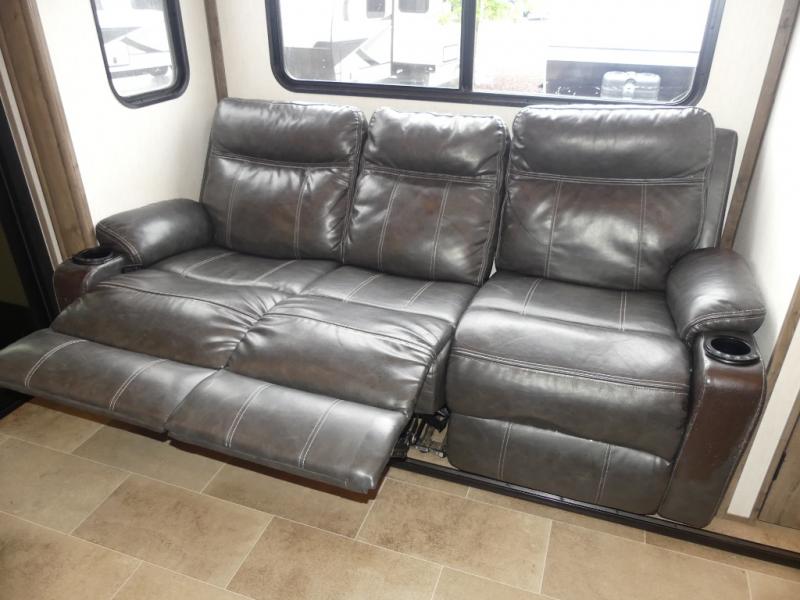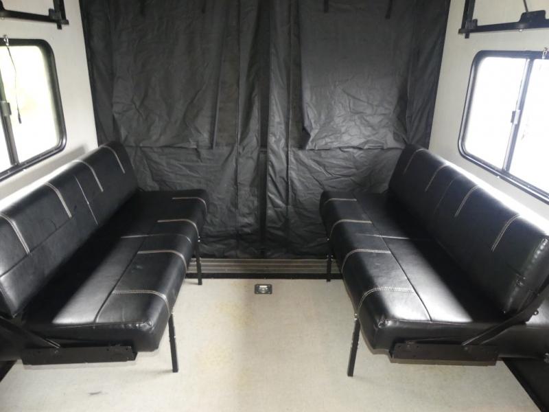 The whole gang can join in on the fun with this fifth wheel toy hauler! Everyone will have a comfortable place to sleep between the king bed in the front private bedroom, the raised queen bed above the flip-up sofas with table in between, and the loft, plus you can even use the sofa in the living area. The large kitchen pantry is big enough to hold your favorite snacks and the dinette with bench is another place to enjoy your meals comfortably. A few other conveniences you will appreciate include dual entry doors, a dual entry bathroom, two 15' power awnings, and 14' 6" of cargo space!