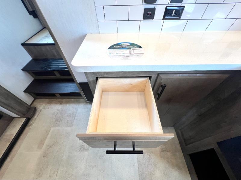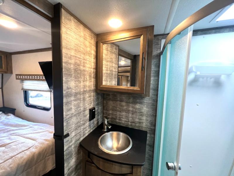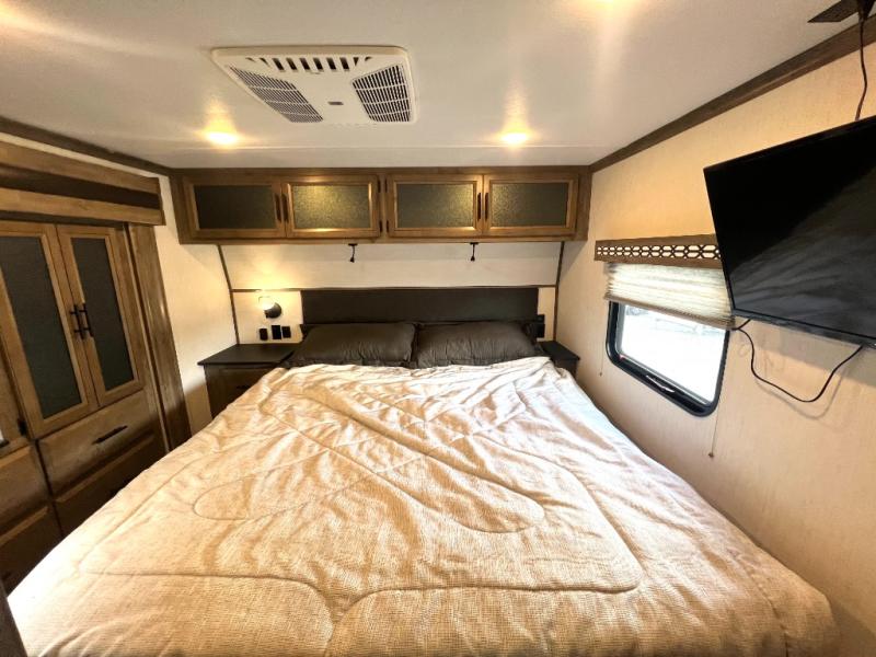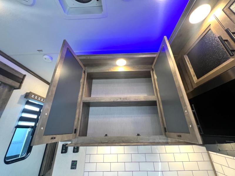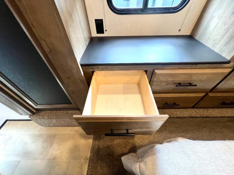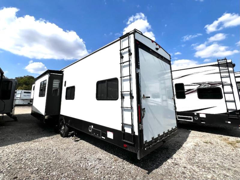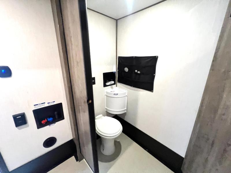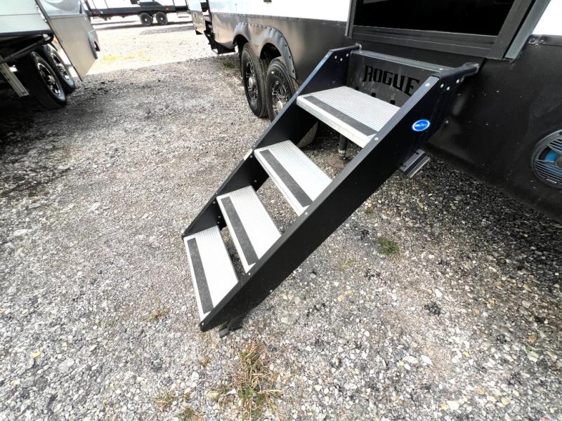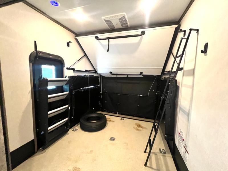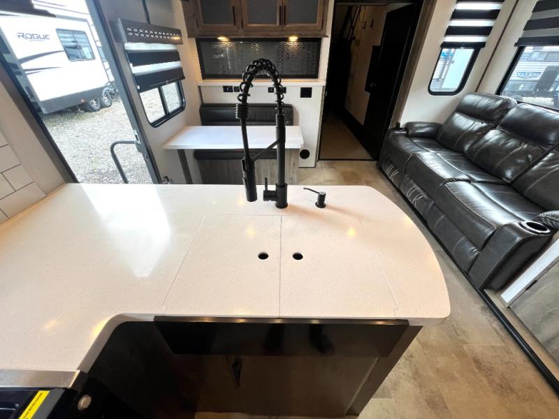 Every one of these Forest River Vengeance Rogue Armored fifth wheel toy haulers come with the features you want most at an affordable price tag! The DUR-A-POXY cargo floor has 5,000 lb. tie downs to ensure your toys will arrive safely without damaging the flooring, plus the 8' ramp door makes it easy to load them. A 15,000 BTU air conditioner will keep you cool even on the hottest summer days. An enclosed and heated underbelly keeps your unit's vitals protected and a central docking station makes life a little easier. The Rogue Armored package comes with a six point leveling system, a comfort plus adjustable powered king bed system, and a ramp door patio system. You can be sure to find one that fits your needs!