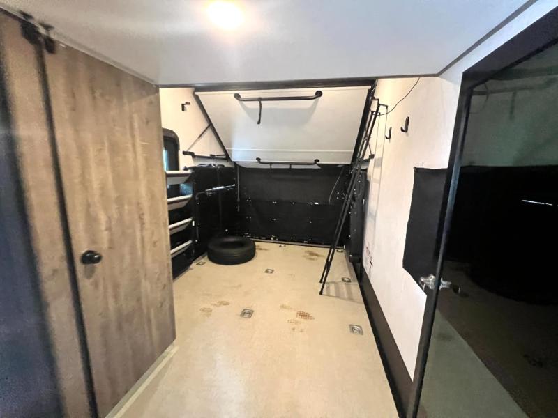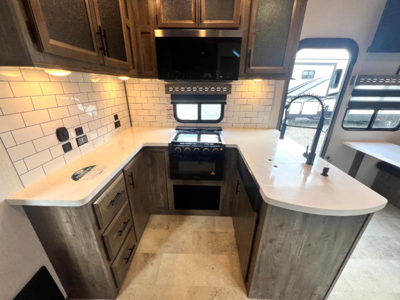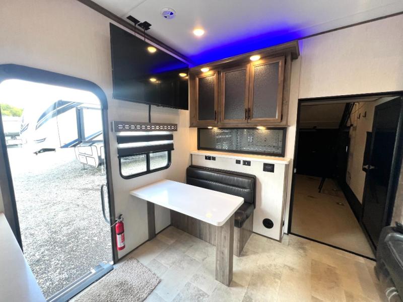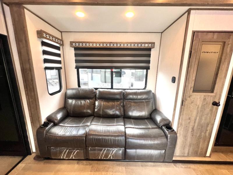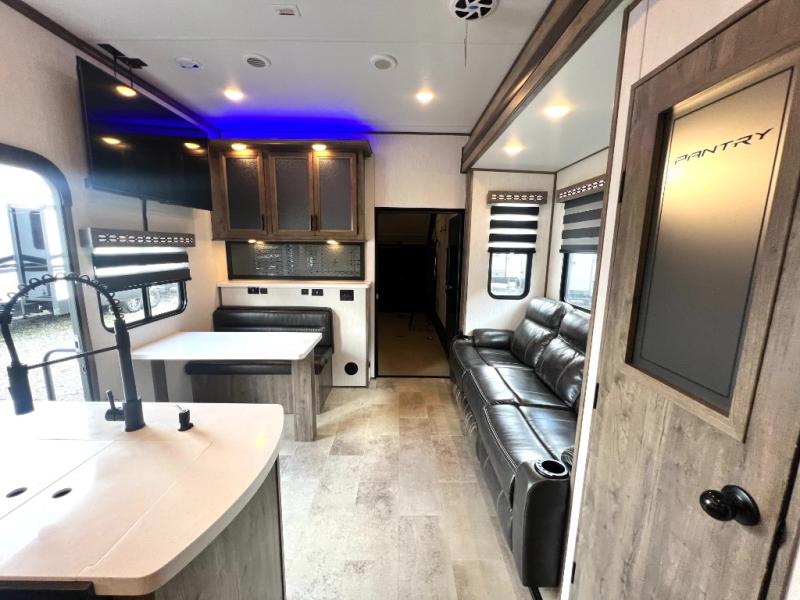 The whole gang can join in on the fun with this fifth wheel toy hauler! Everyone will have a comfortable place to sleep between the king bed in the front private bedroom, the raised queen bed above the flip-up sofas with table in between, and the loft, plus you can even use the sofa in the living area. The large kitchen pantry is big enough to hold your favorite snacks and the dinette with bench is another place to enjoy your meals comfortably. A few other conveniences you will appreciate include dual entry doors, a dual entry bathroom, two 15' power awnings, and 14' 6" of cargo space!