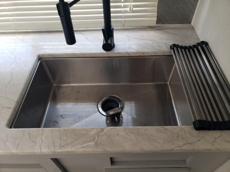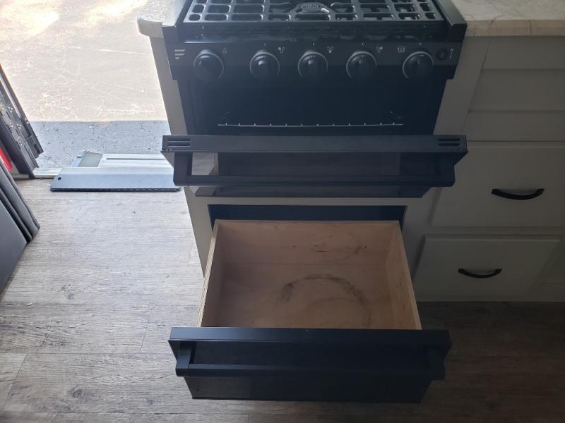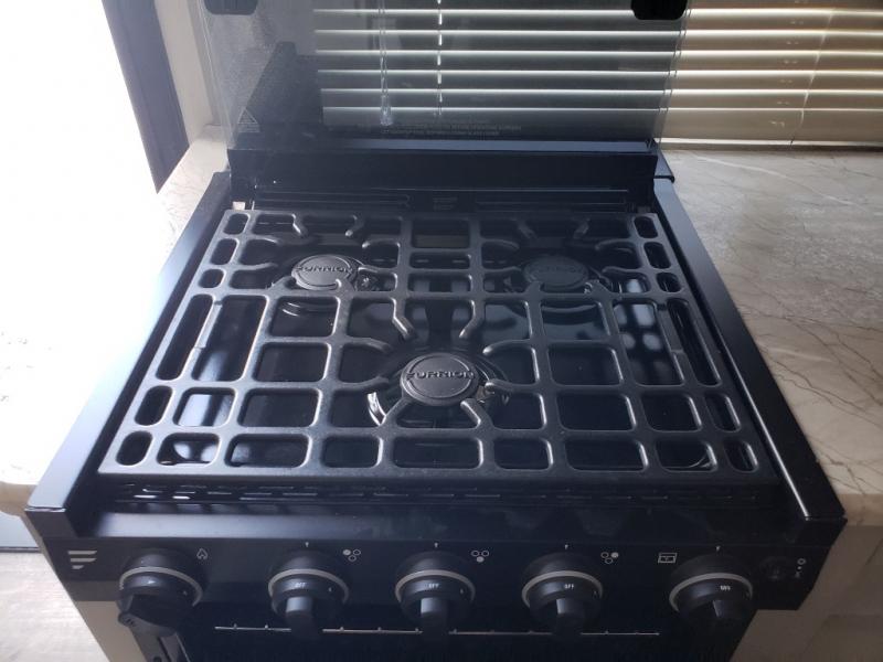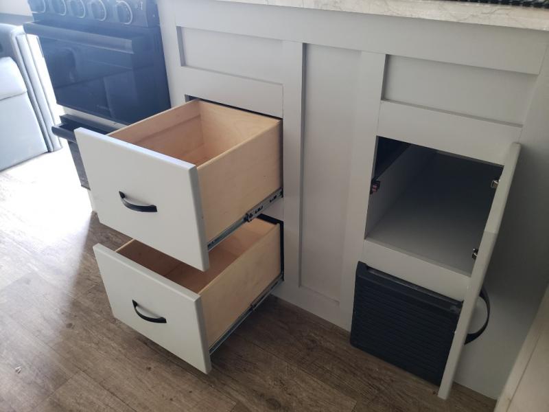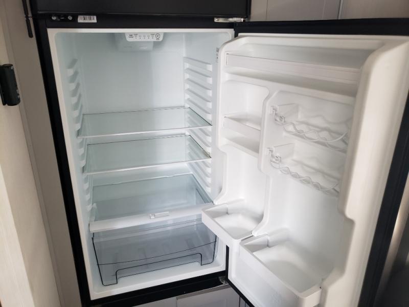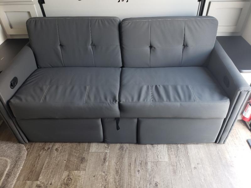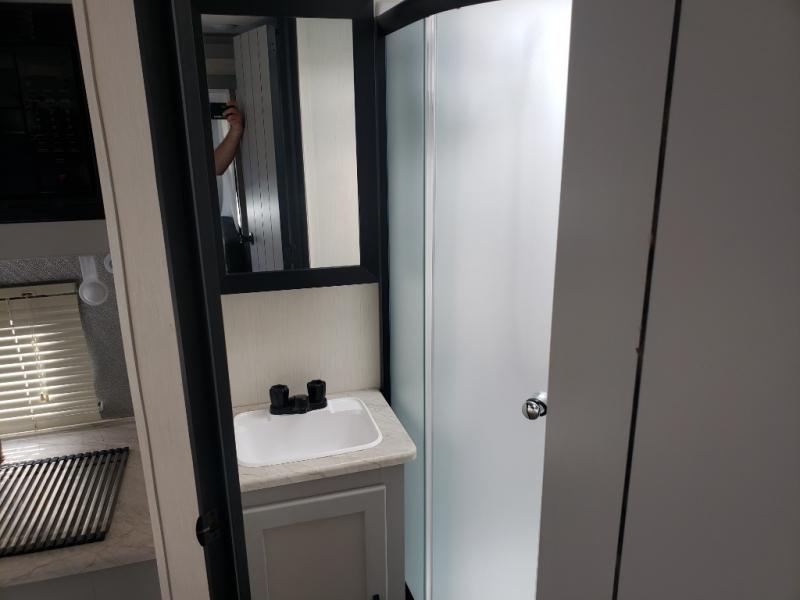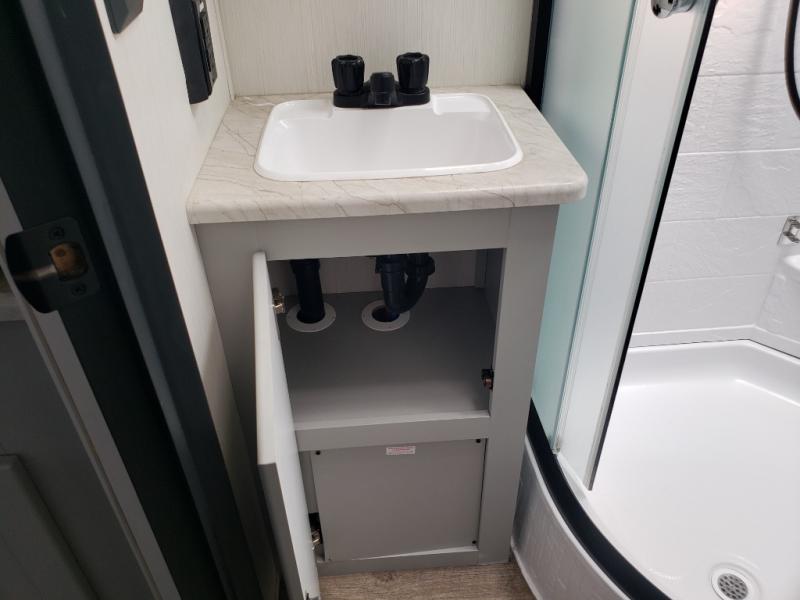 Step inside and you’re greeted with a bright, modern interior featuring panoramic windows, a spacious rear bath, and an open living area that maximizes every inch. The residential-inspired kitchen includes solid-surface countertops, premium cabinetry, a large stainless-steel sink, and plenty of storage for extended trips. The full bathroom offers a generous shower, ample counter space, and room to move around comfortably, making it one of the standout features of this floorplan.