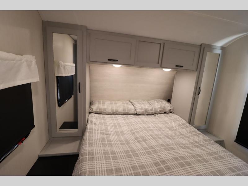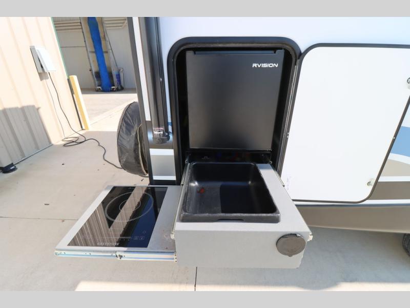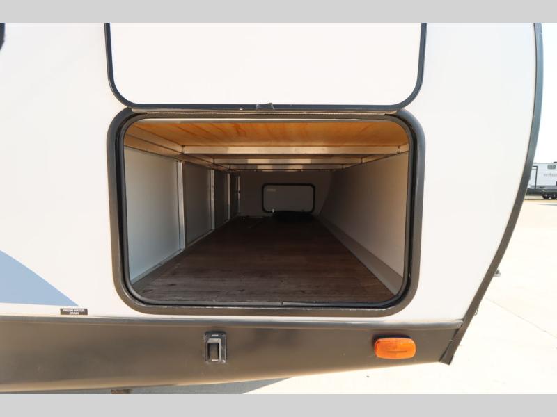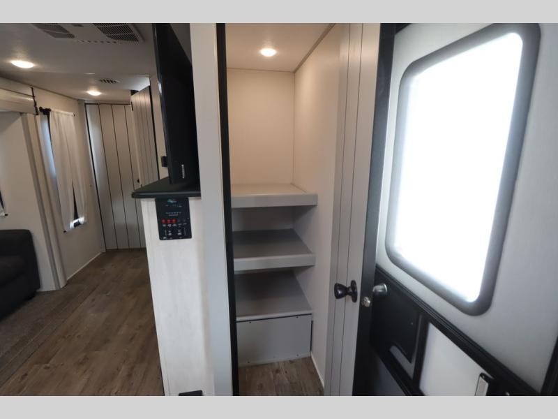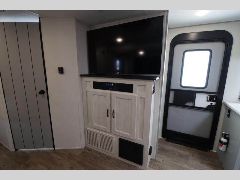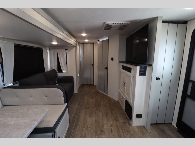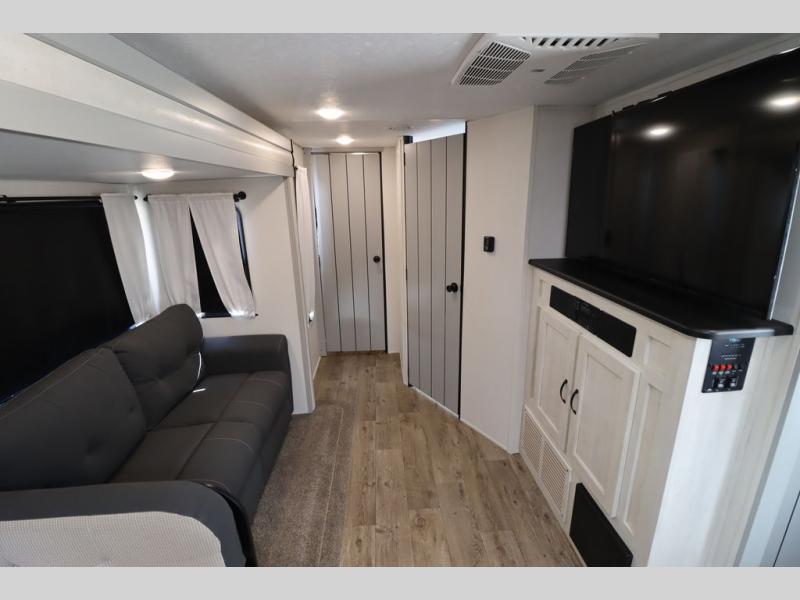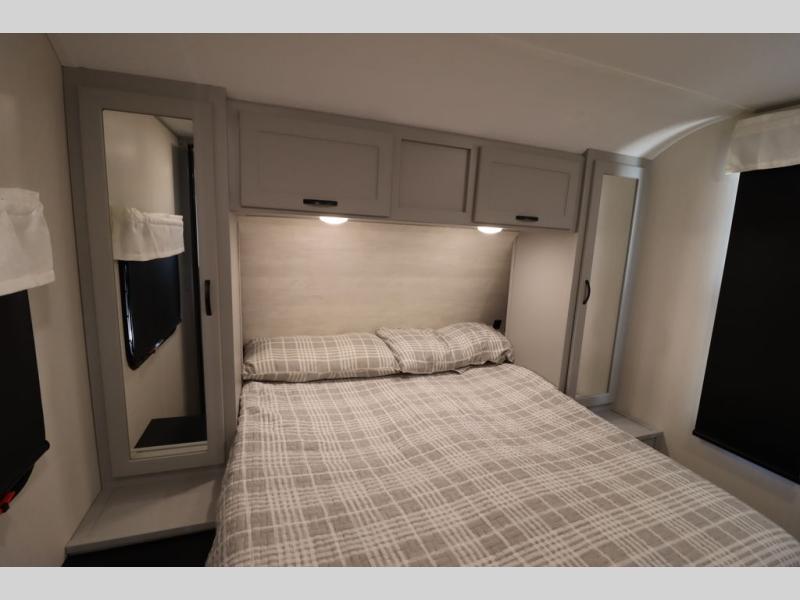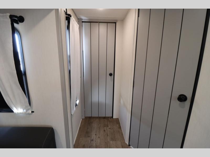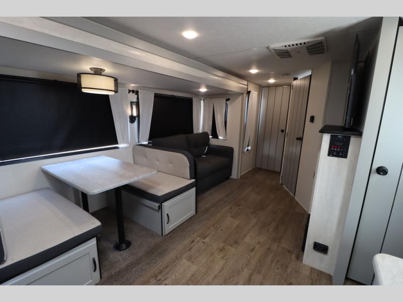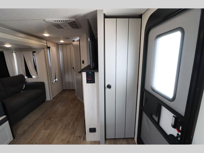 Your family will enjoy every camping trip in this cozy travel trailer. Whether you're cooking on the outside kitchen or indoors in the rear kitchen, you will have all the appliances needed for yummy meals each day. The large slide out with the booth dinette and sofa provide comfortable seating space during the day, and this area can become the kids' sleeping space at night. You and your spouse can take the front private bedroom with a queen bed and dual wardrobes for your clothes. And the full bath is conveniently located in the middle of the trailer for easy access each day. This model also includes tons of storage space for all your belongings, including an exterior large pass-through storage, and an interior walk-in pantry with shelves to store dry goods and snacks!