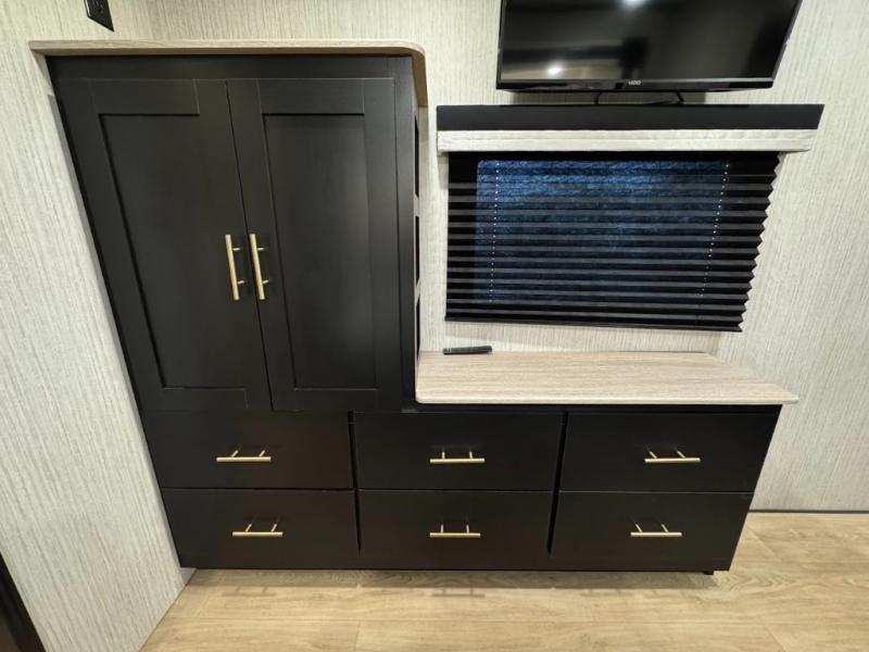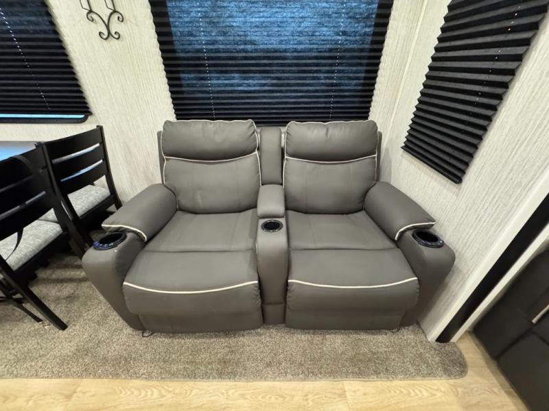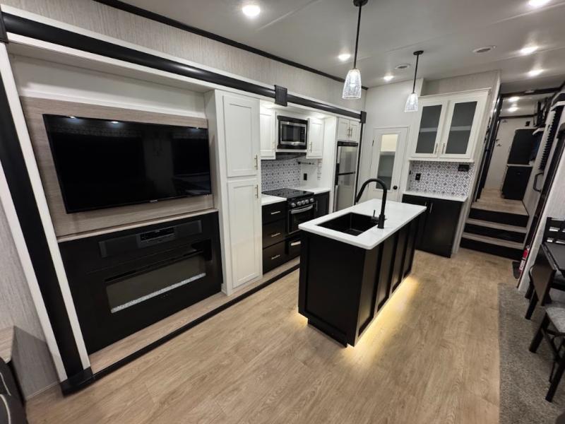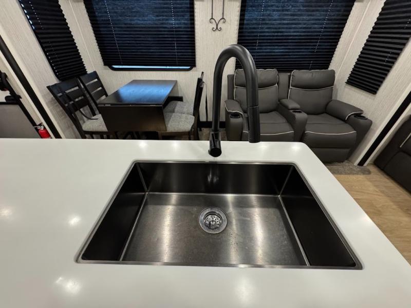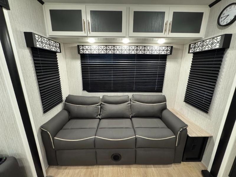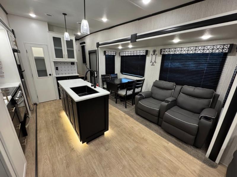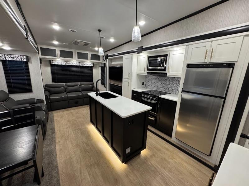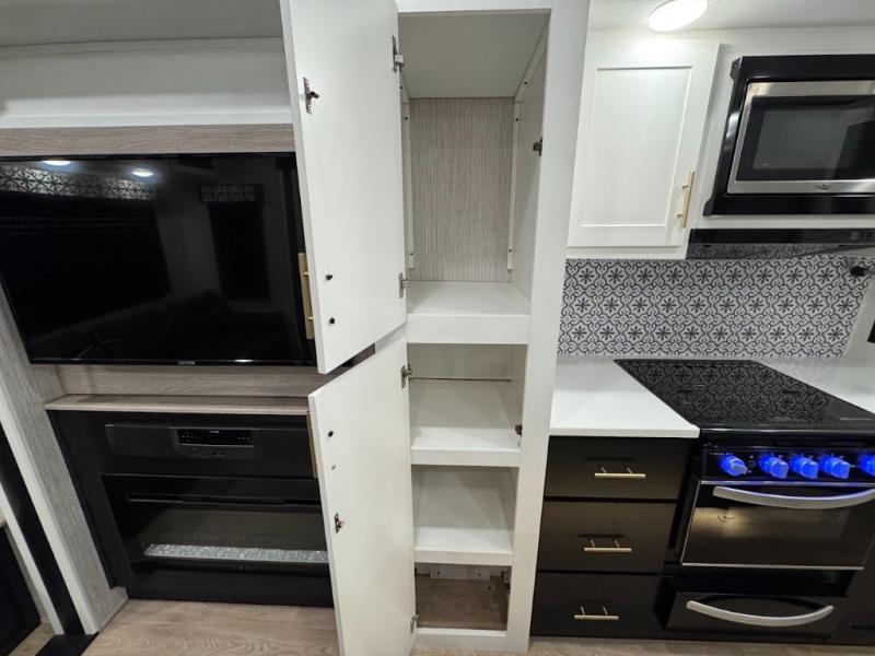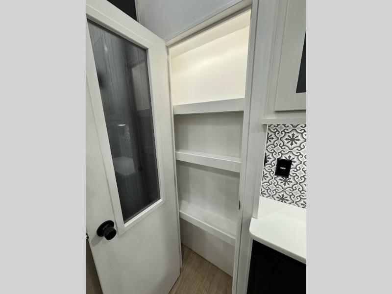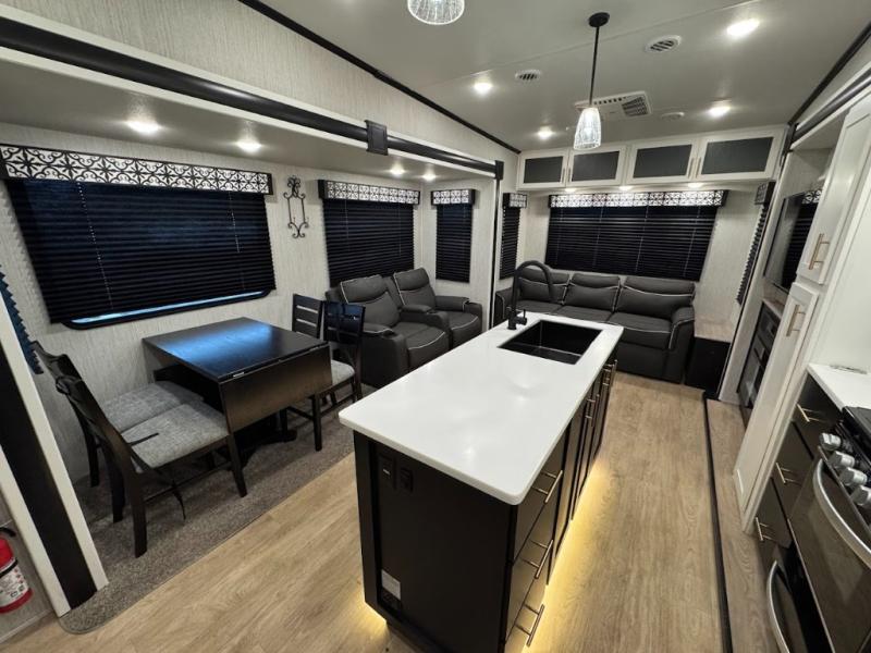 Experience the camping lifestyle in complete comfort with this fifth wheel in tow! Once you step foot inside you will be met with a spacious living space, residential features, and comfortable furniture arrangements. There are many convenient features such as a walk-in pantry, a large kitchen island, pus tons of overhead space for your dishes and kitchen knickknacks. After a day outdoors, head to the rear living area to relax on the 80" hide-a-bed sofa or the 60" theater seating. When it's time to call it a night, the front private bedroom will be your own oasis away from it all. Here, you'll find a slide out king bed, plus a large wardrobe that includes convenient shoe storage and a space to add an optional washer and dryer!