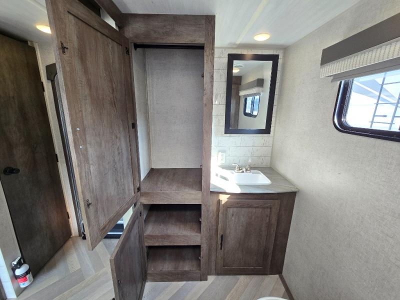 As you escape to the beautiful countryside or embark across the country to visit family, you'll find that the modern amenities found in this Wildwood travel trailer will deliver the ultimate enjoyment all along the way! Relax on the 8' chaise lounge that includes a table in front so that you can enjoy your morning coffee. When you are ready to face the day ahead, you can grab a towel from the linen closet in the rear bathroom and rinse off in the walk-in shower before heading out for a day full of adventure. This model also includes a walk-in pantry for all the goodies!