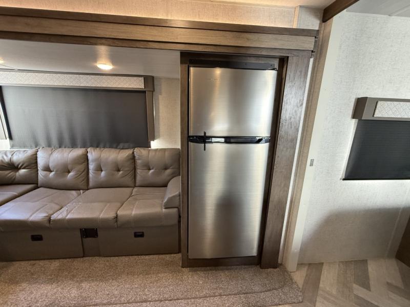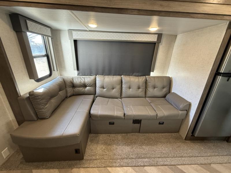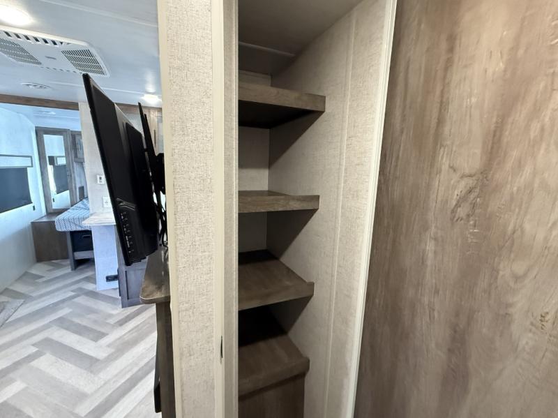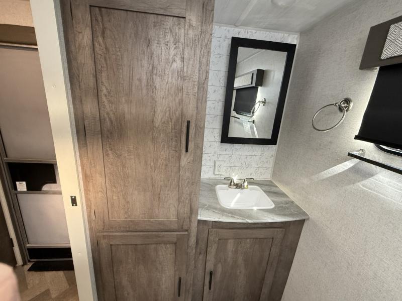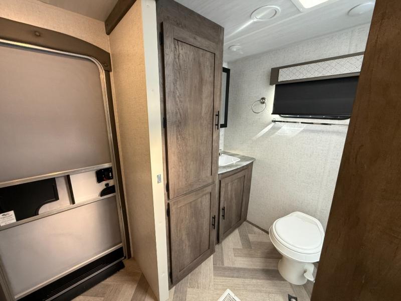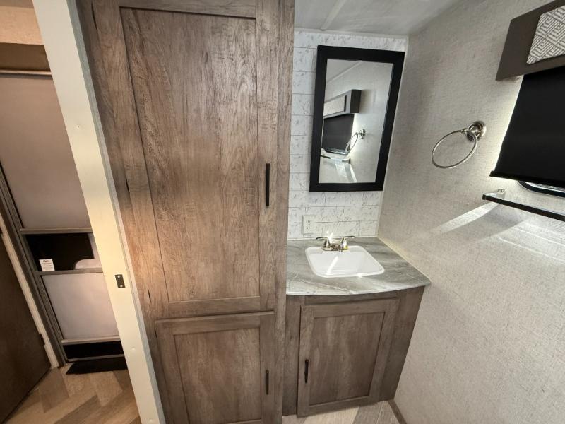 As you escape to the beautiful countryside or embark across the country to visit family, you'll find that the modern amenities found in this Wildwood travel trailer will deliver the ultimate enjoyment all along the way! Relax on the 8' chaise lounge that includes a table in front so that you can enjoy your morning coffee. When you are ready to face the day ahead, you can grab a towel from the linen closet in the rear bathroom and rinse off in the walk-in shower before heading out for a day full of adventure. This model also includes a walk-in pantry for all the goodies!