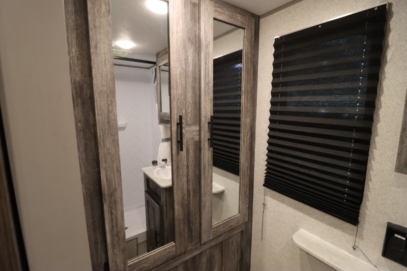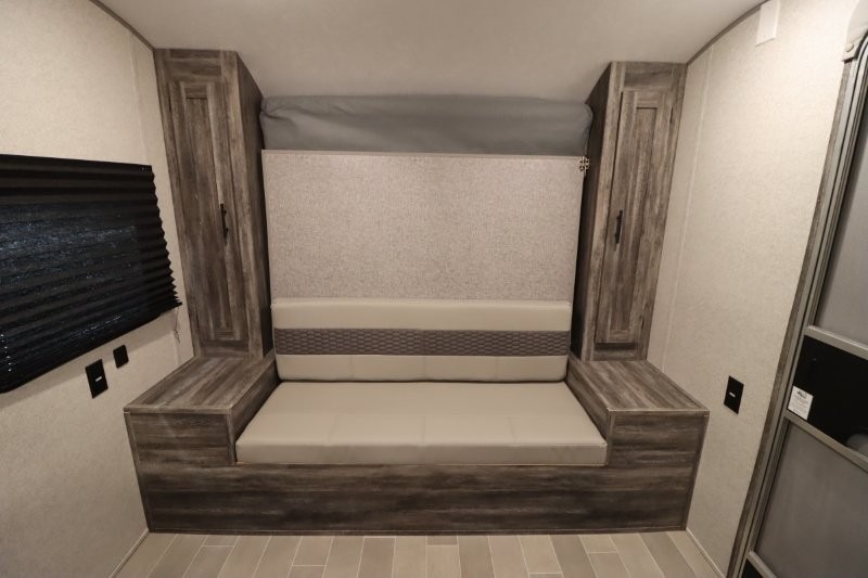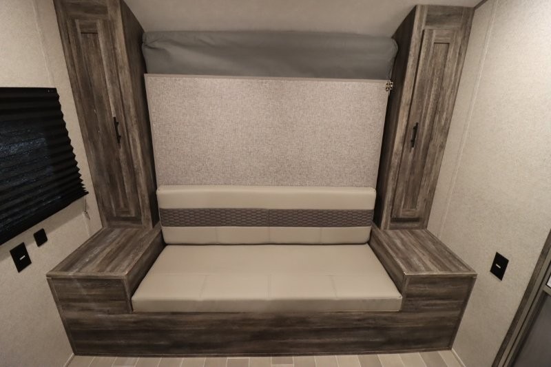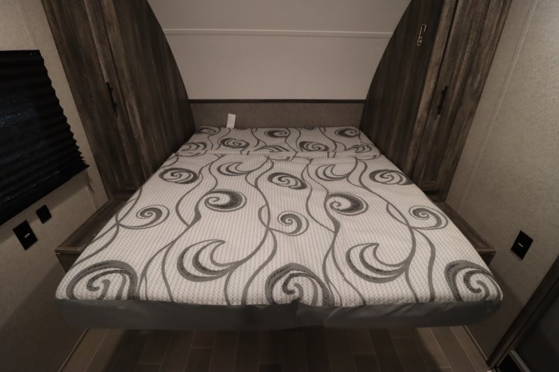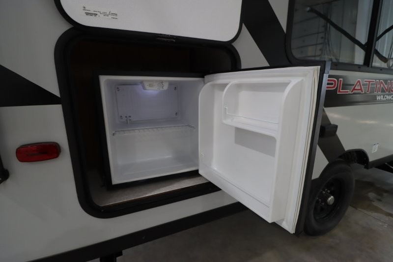 Let all of your adventures be full of fun and excitement with this Wildwood FSX Platinum Edition travel trailer! Keep lots of gear stored away in the exterior pass-through storage compartment so that you can keep the interior free from clutter. The bathroom linen closet will hold onto your towels so that they are readily available when you shower, and the 11-cubic foot refrigerator will keep your perishable items cold throughout your trip so that they are ready to be used for meals. You'll enjoy the functionality of the Murphy bed up front because it can fold away to reveal a sofa with end tables that you can use to lounge on during the day.