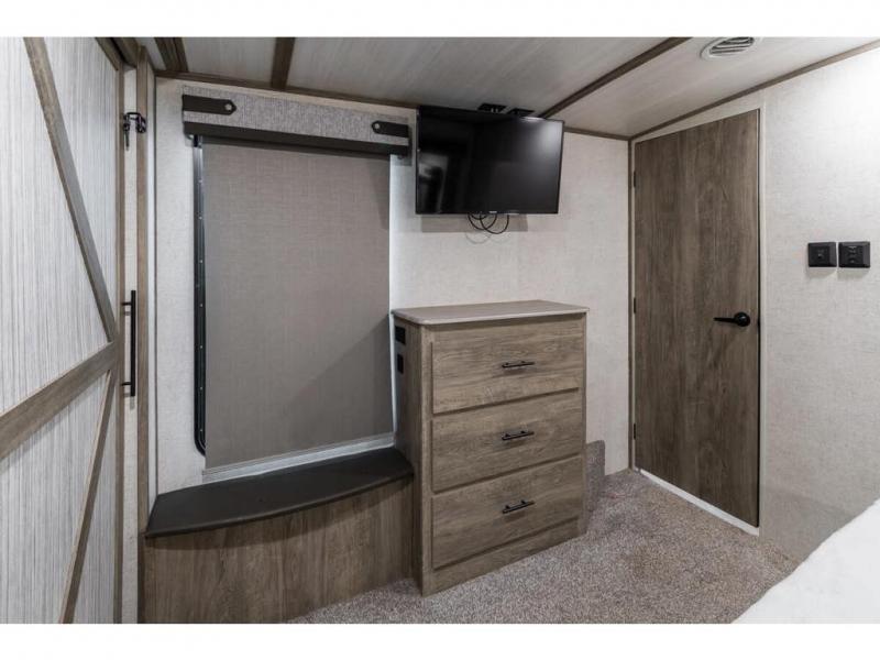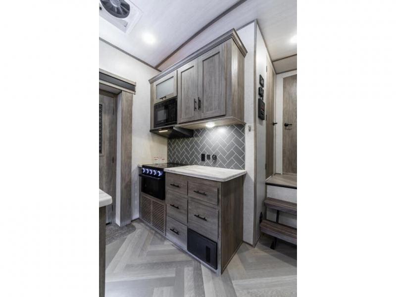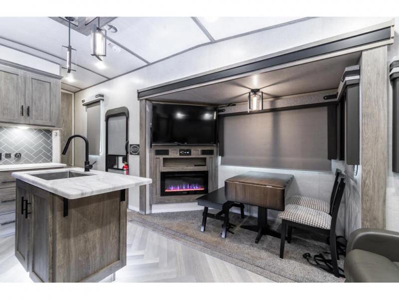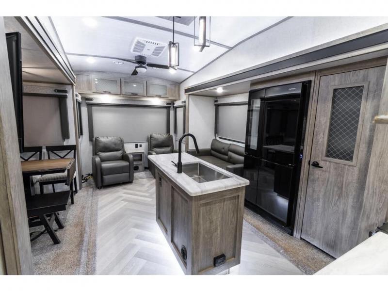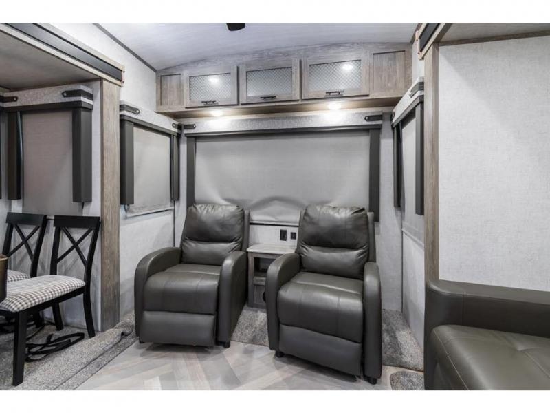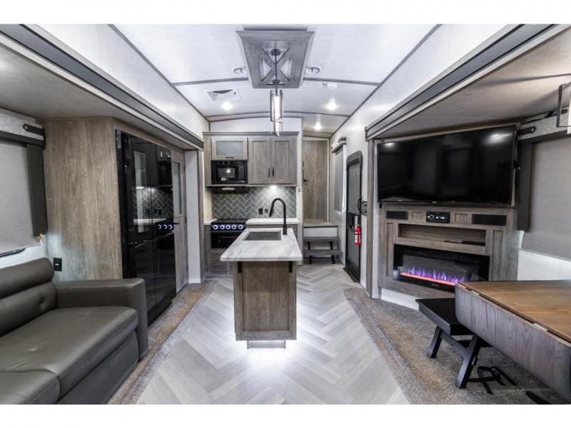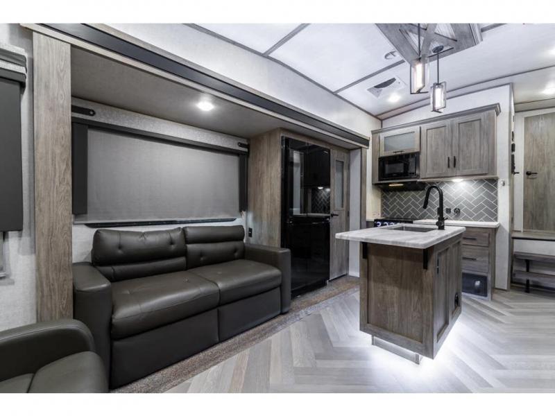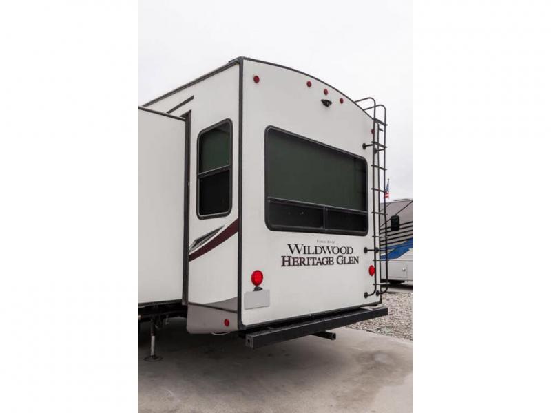If you are looking for plenty of space, great views, and a place to call home, you have found it with this Wildwood Heritage Glen fifth wheel! The living area is separate from the kitchen and includes dual opposing tri-fold sofas with panoramic windows, a reclining sofa with cupholders, and a 50" LED TV with fireplace and storage along the front wall. The separate kitchen also offers lots of space with dual slides, a kitchen island, a free-standing dinette, and a hutch. You will find the loft stairs beside the full bathroom with a walk-in shower, and the master bedroom has an RV king bed slide for endless nights of rest ad rejuvenation.