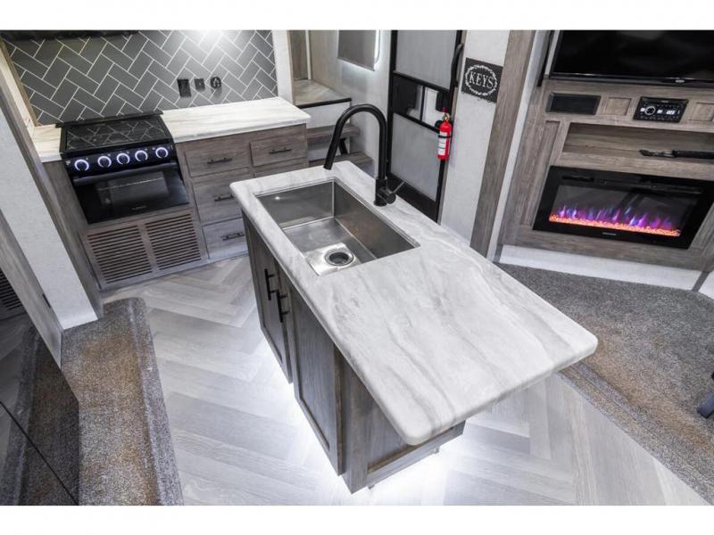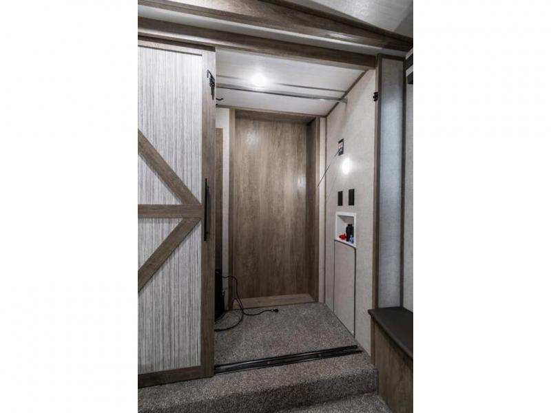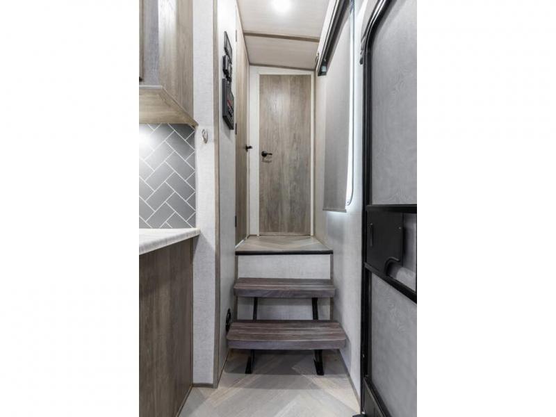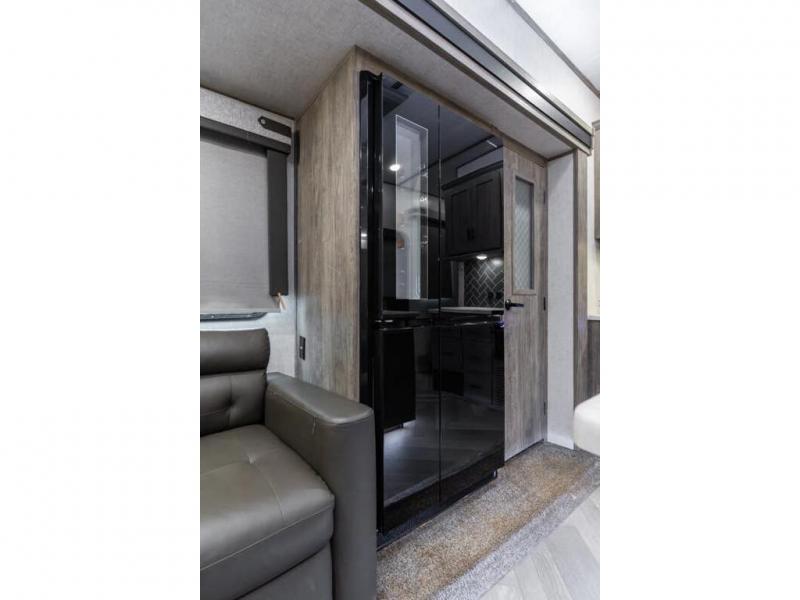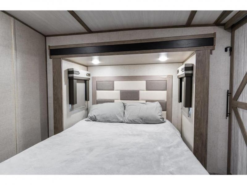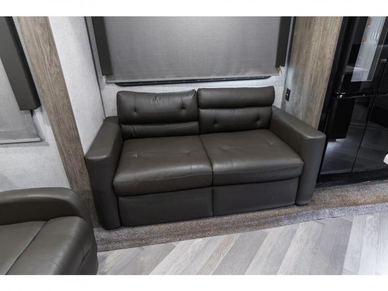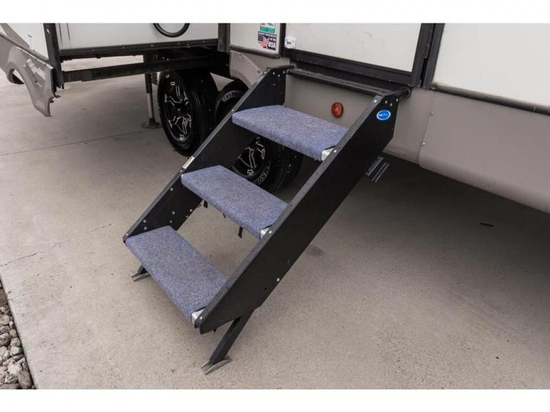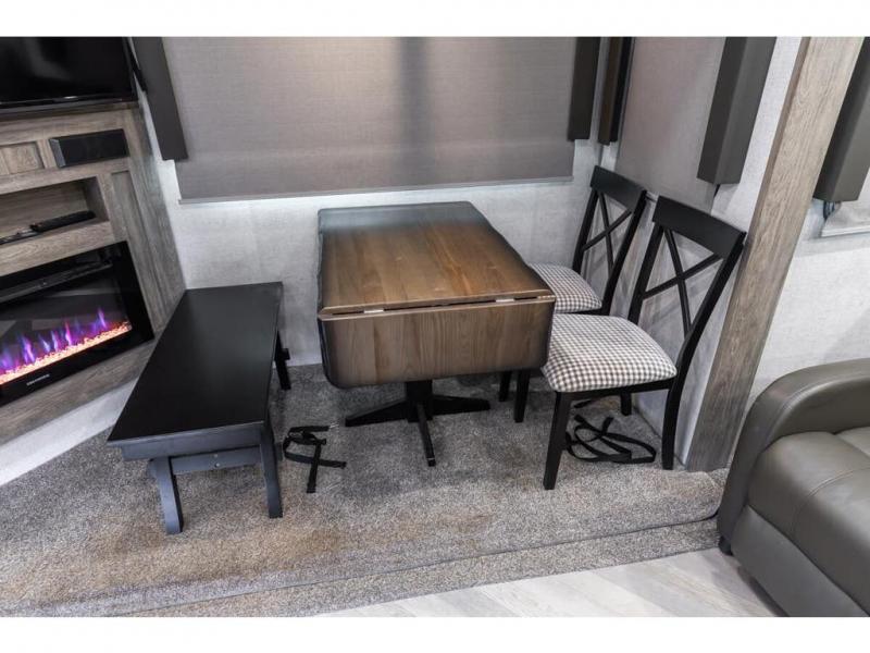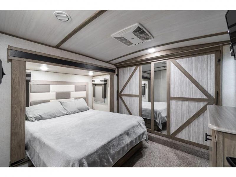 If you are looking for plenty of space, great views, and a place to call home, you have found it with this Wildwood Heritage Glen fifth wheel! The living area is separate from the kitchen and includes dual opposing tri-fold sofas with panoramic windows, a reclining sofa with cupholders, and a 50" LED TV with fireplace and storage along the front wall. The separate kitchen also offers lots of space with dual slides, a kitchen island, a free-standing dinette, and a hutch. You will find the loft stairs beside the full bathroom with a walk-in shower, and the master bedroom has an RV king bed slide for endless nights of rest ad rejuvenation.