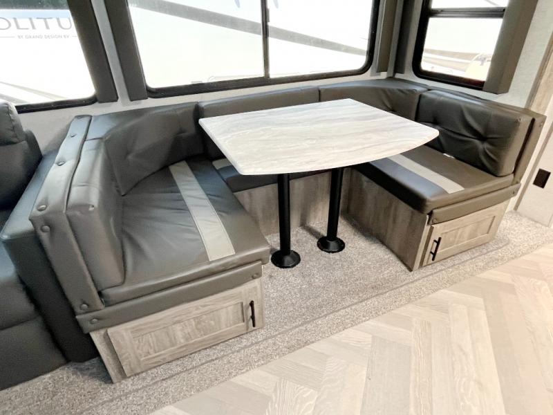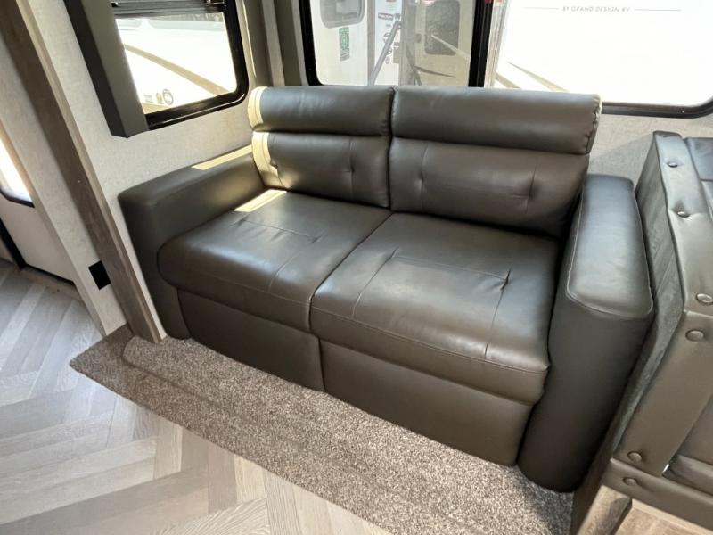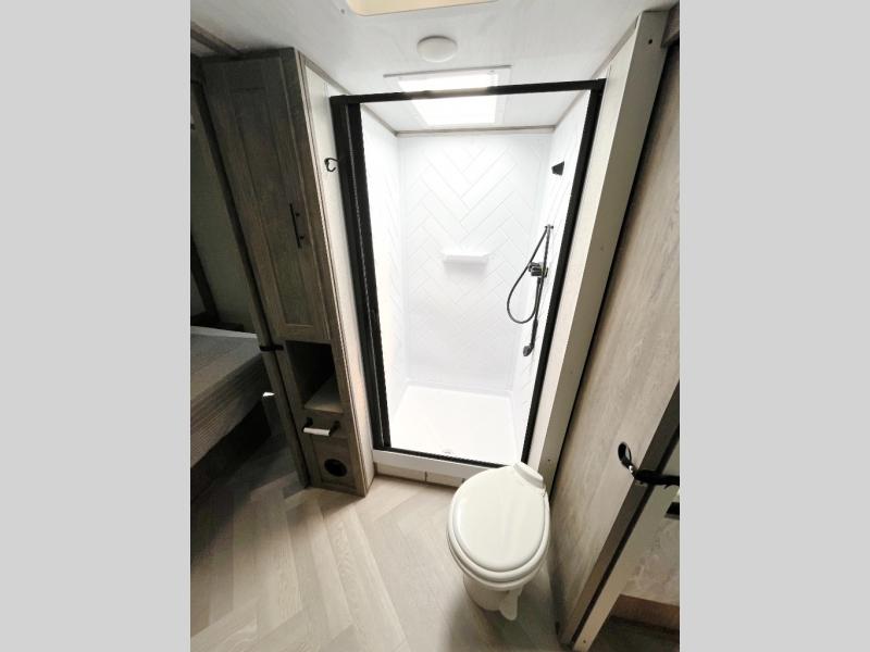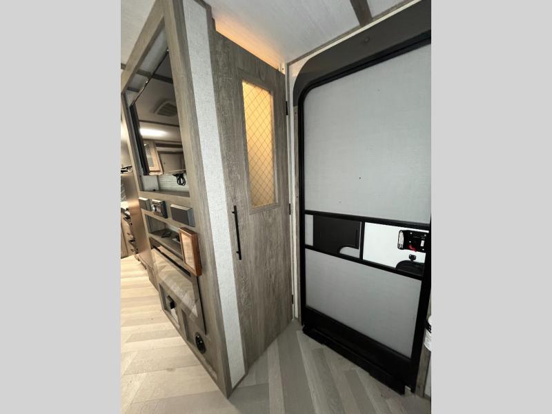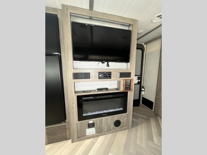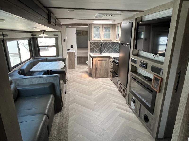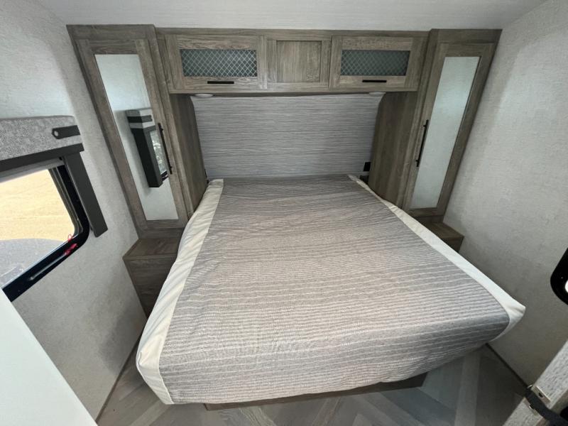 Load up your gear easily with the bike-sized cargo door with access to the bunkhouse, and the exterior Texas-sized pass-through compartment will allow you to stow away the larger gear such as outdoor games, camping chairs and fishing poles. The cook will appreciate all the appliances in the L-shaped kitchen plus the countertop extension, the residential refrigerator and the pantry/closet. Everyone can play games and dine at the family-sized U-shaped dinette or while sitting on the tri-fold sofa, or maybe outside under the awning with LED lights. You will also enjoy the two upper bunks and the 60" x 74" Versa queen convertible bed/sofa with sleeping for four in the bunkhouse, privacy in the master bedroom which includes cabinets and wardrobes, plus the large panoramic windows to enjoy the outdoors while relaxing indoors.