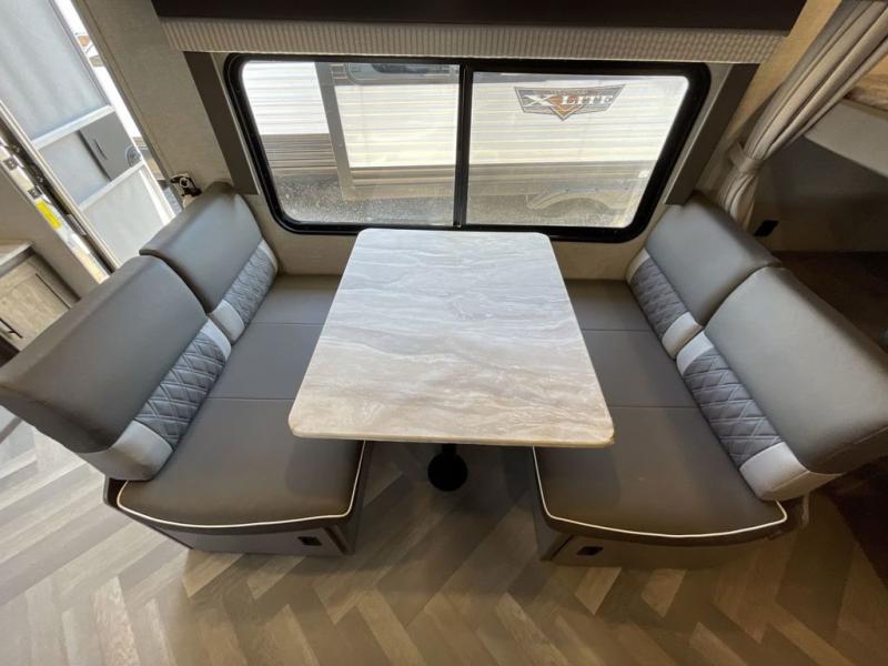If you love to take trips to the great outdoors, you should take them in this Wildwood X-Lite travel trailer! This trailer is the perfect complement to your weekend away because it has a set of double-size bunks for your kids, yet it is still lightweight. The bathroom has a walk-in shower with a skylight to help you see with natural lighting, and the vanity is located just outside of the bathroom door so that someone else can use the sink at the same time that another camper is showering. The kitchen is filled with excellent amenities, like seamless countertops, a microwave, an 11-cubic foot refrigerator, and a three-burner cooktop, and you can use the booth dinette to sit down and eat any meal that you've prepared in the kitchen. You might even like to add the optional outside kitchen for more choices when cooking.