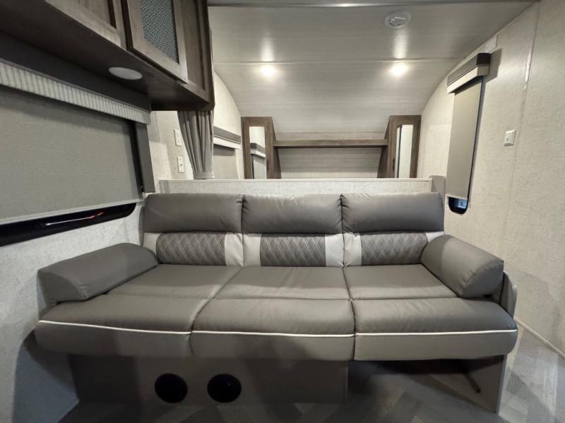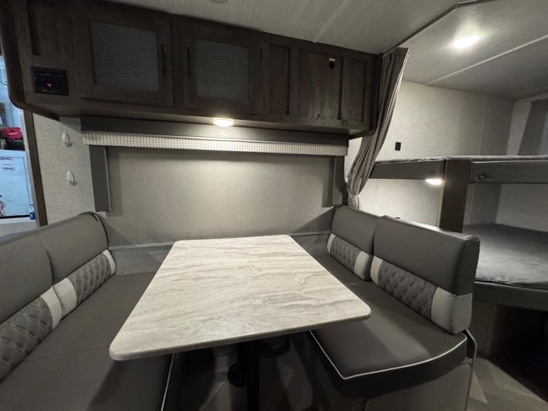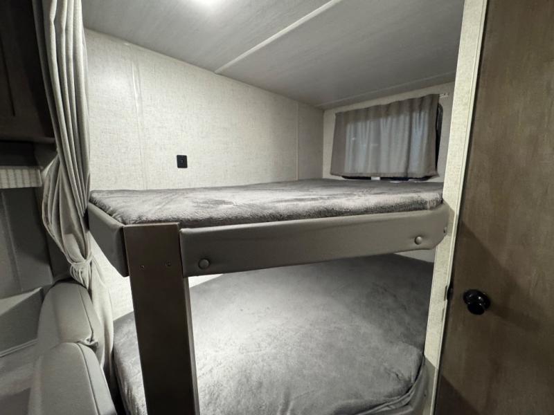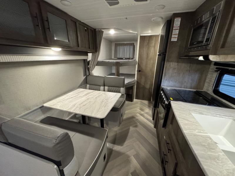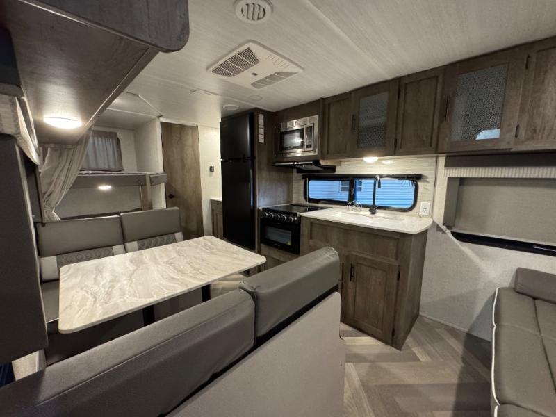 This Wildwood X-Lite travel trailer is packed with features! There is a walk-around bed up at the front that can be sectioned off from the rest of the trailer with a privacy curtain, and the double-size bunks in the back of this trailer will provide you with a compact sleeping space for your little ones. The booth dinette is going to be a great place to sit down together and have a meal when the bugs are too bad outside to sit at the picnic table, and there is also a sofa for relaxation while inside. You will also appreciate the look and function of the seamless countertops in the kitchen, and the 11-cubic foot refrigerator will easily keep your perishable items fresh. You might even like to add the optional outside kitchen for more choices when cooking for the family.