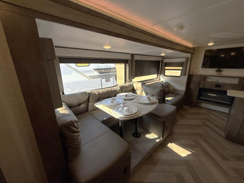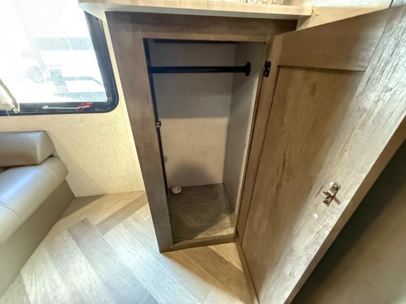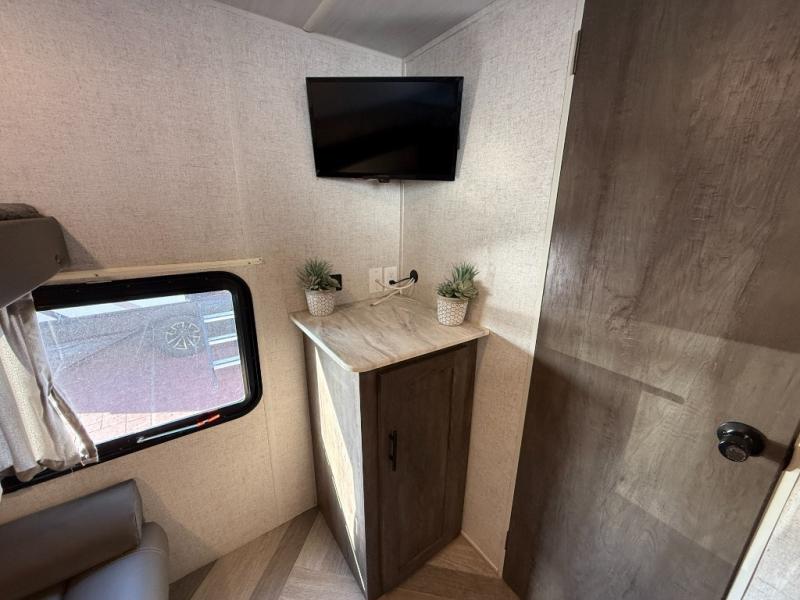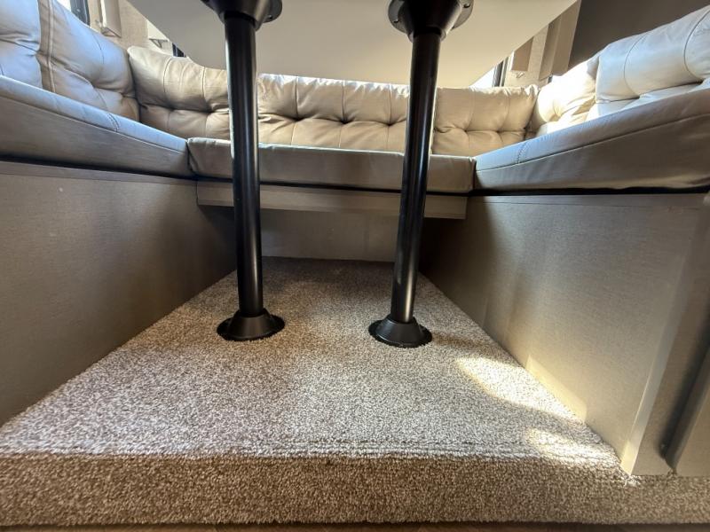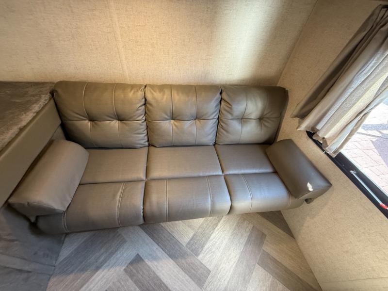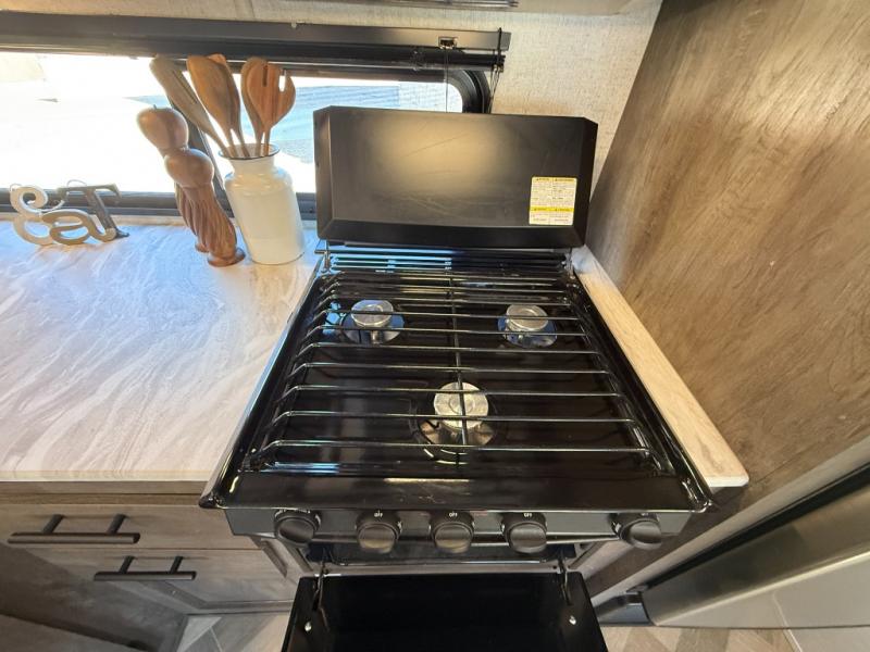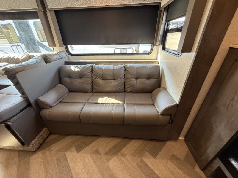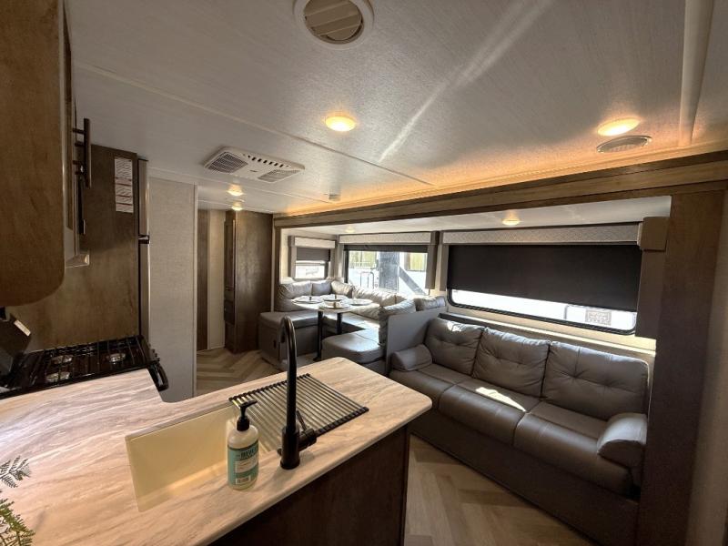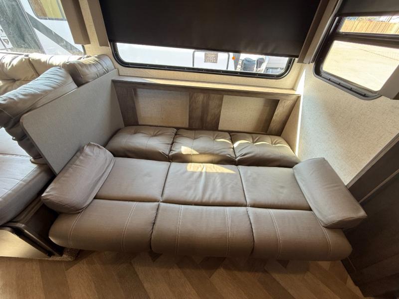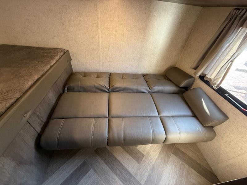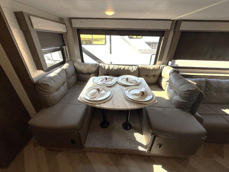 If you like to travel with a large crew, choose this Wildwood X-Lite travel trailer! This trailer has two private sleeping spaces with a private bedroom up front and a private bunkhouse in the back. Not only does the bunkhouse have three bunk beds, but it also has a closet for storage and a jiffy sofa for lounging. In the main living area, there is a large slide that holds the U-shaped dinette and sofa. These pieces of furniture are a part of the Versa Lounge, and you can customize them to function as you need them to. The panoramic windows surround the dinette and sofa so that you can take in the scenic views while you relax. You can even add an optional outdoor kitchen to this trailer to make it more convenient.