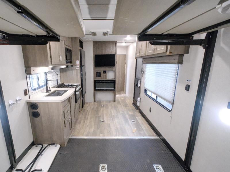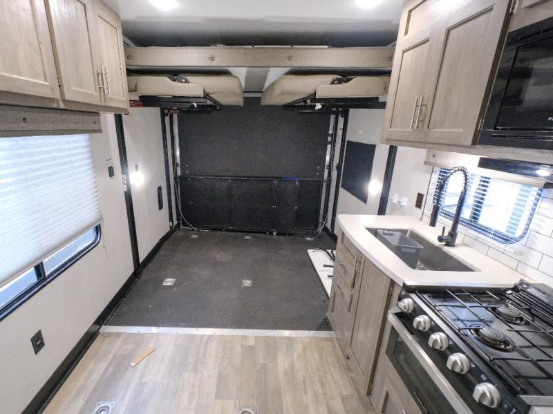 You will love how easy it is to access the dual entry bathroom from the front private bedroom in this toy hauler! The kitchen has a three burner cooktop so you can enjoy home cooked meals while camping and a 10 cu. ft. black stainless steel refrigerator to keep your beverages nice and cold!