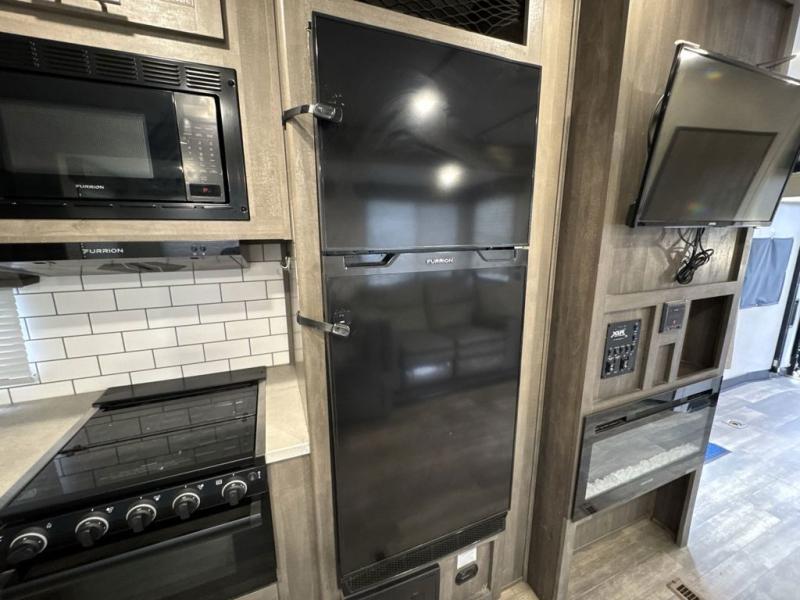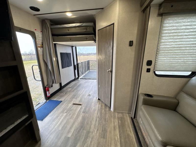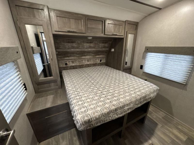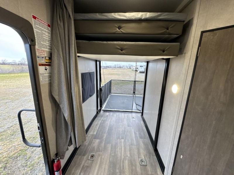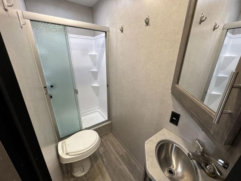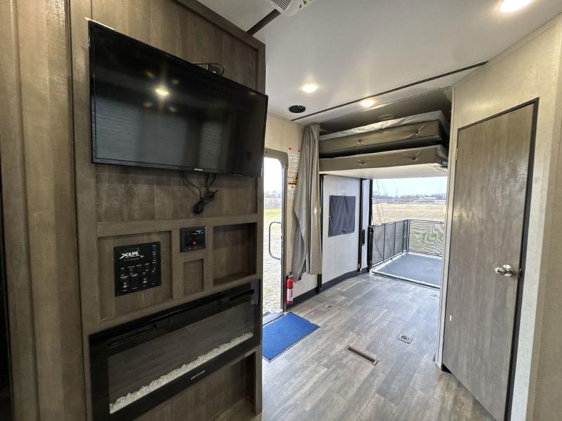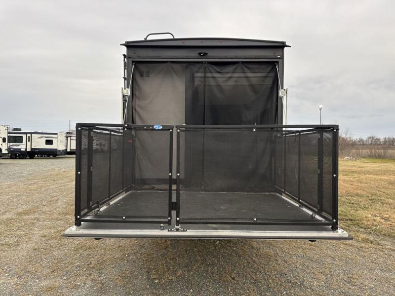 There is 6' 11" of cargo space for your off-road toy in this toy hauler! Next to the cargo space is the full rear corner bathroom that has a shower for you to rinse the mud out of your hair each night. The living area has a sofa across from a fireplace for a relaxing evening and a 84" U-shaped dinette to play a few card games after eating a delicious meal prepared with the three burner cooktop. The front private bedroom has a queen bed for you to enjoy a good night's rest and wardrobes on either side of it to keep your clothes out of the way!
