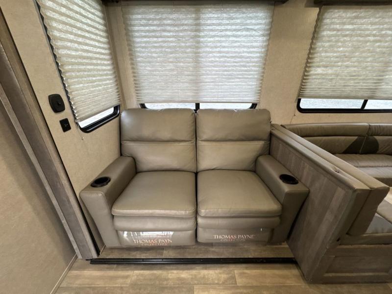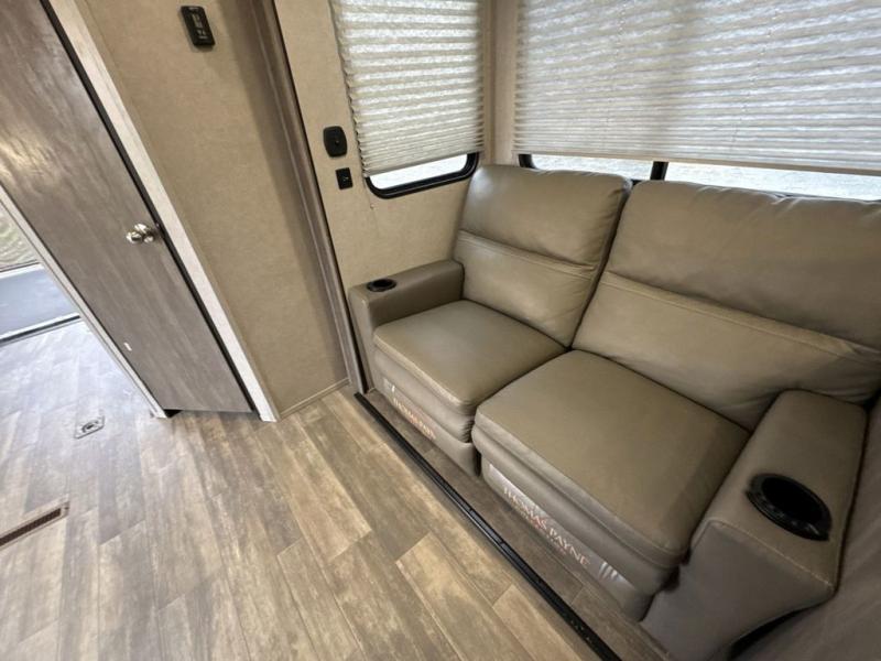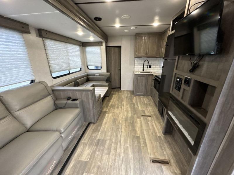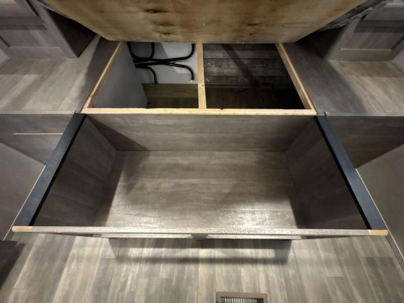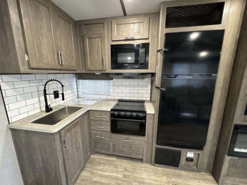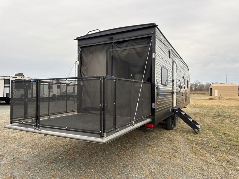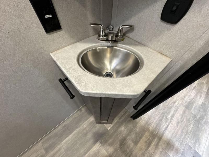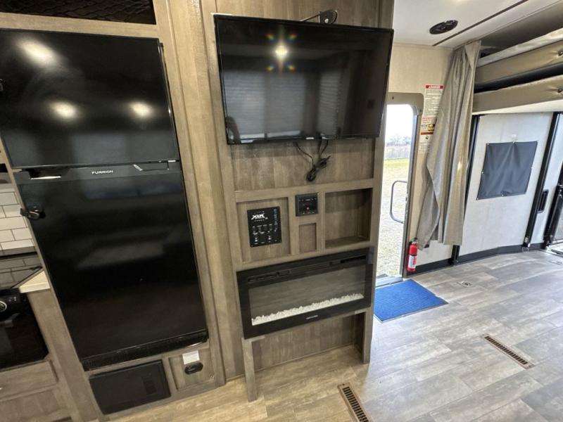 There is 6' 11" of cargo space for your off-road toy in this toy hauler! Next to the cargo space is the full rear corner bathroom that has a shower for you to rinse the mud out of your hair each night. The living area has a sofa across from a fireplace for a relaxing evening and a 84" U-shaped dinette to play a few card games after eating a delicious meal prepared with the three burner cooktop. The front private bedroom has a queen bed for you to enjoy a good night's rest and wardrobes on either side of it to keep your clothes out of the way!