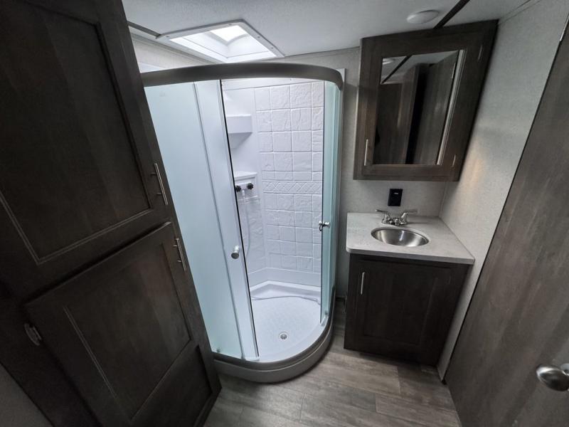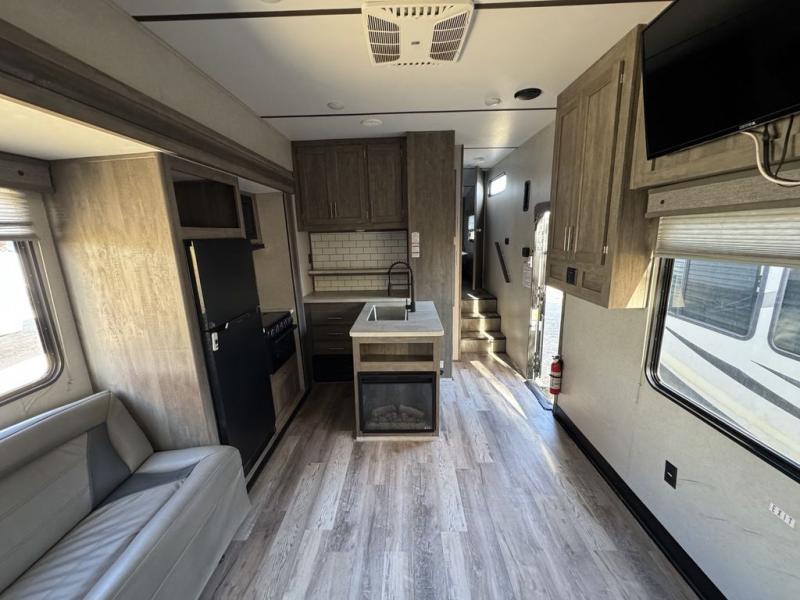 Pack your bags and load up this toy hauler with your off-road toys into the 14' of cargo space provided! Once you have arrived at your destination, you can put down the optional electric bed and max clearance dinette and the optional Euro chairs if you chose to add them. The sofa doubles as a seating space while you enjoy the fireplace and as a sleeping space for another guest. The front private bedroom has a king bed for you to enjoy a good night's rest, as well as a wardrobe slide, and an entrance into the dual entry bathroom which has a radius shower for you to end your nights feeling squeaky clean!