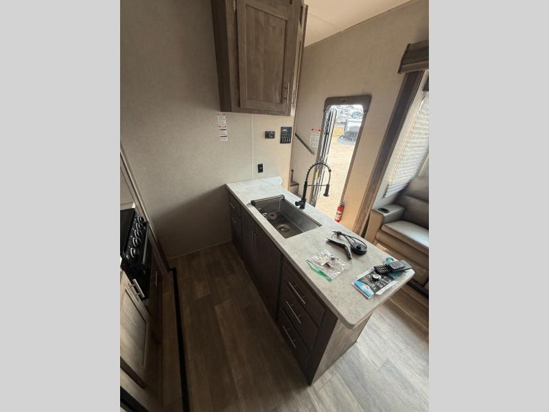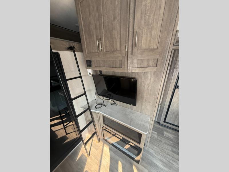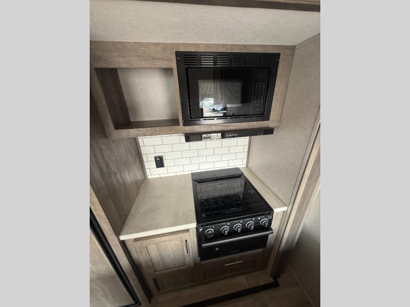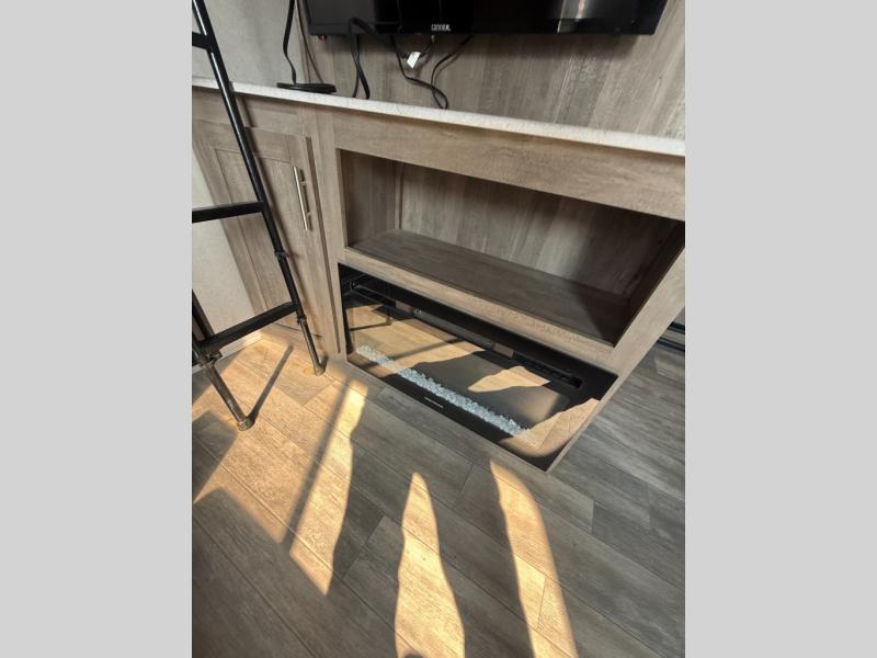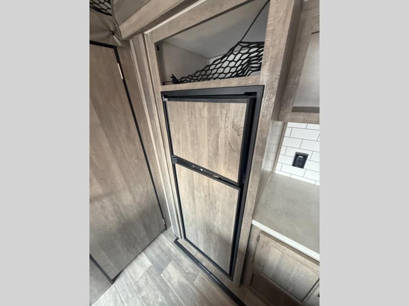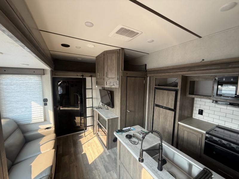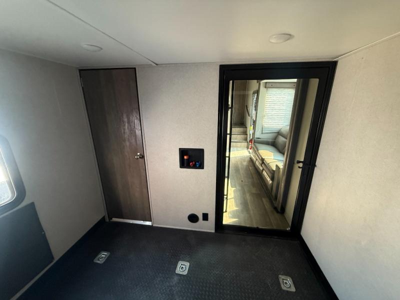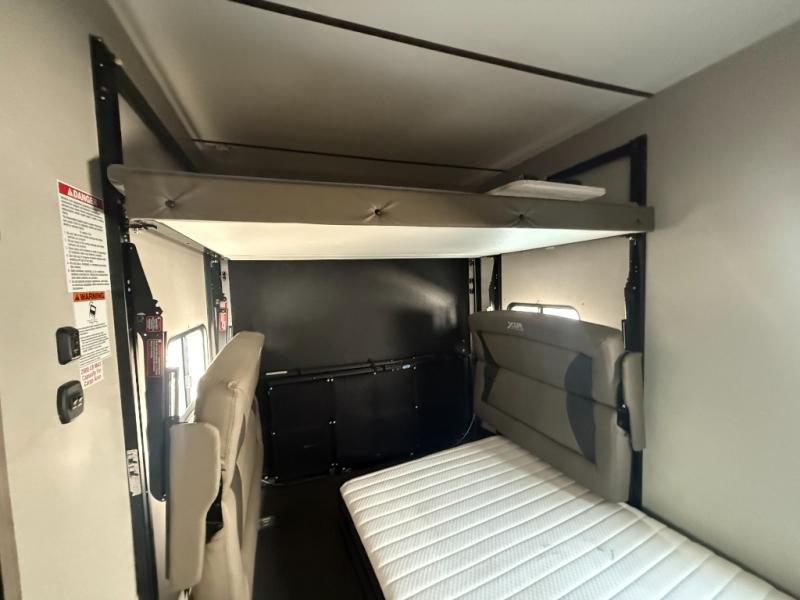 The whole gang can go action camping with you in this toy hauler if you add the optional electric bed and max clearance dinette to the enclosed 13' garage! There is also a loft in the garage, a 84" U-shaped dinette slide to enjoy your meals at and transform into an extra sleeping space, and a king bed inside the front private bedroom. The kitchen has a three burner cooktop, a microwave, and a 10 cu. ft. black stainless steel refrigerator to prepare your best home cooked meals. The dual entry doors make for a smooth flow of traffic in and out of the unit, and the bath and a half makes it easy for everyone to wash up for dinner!