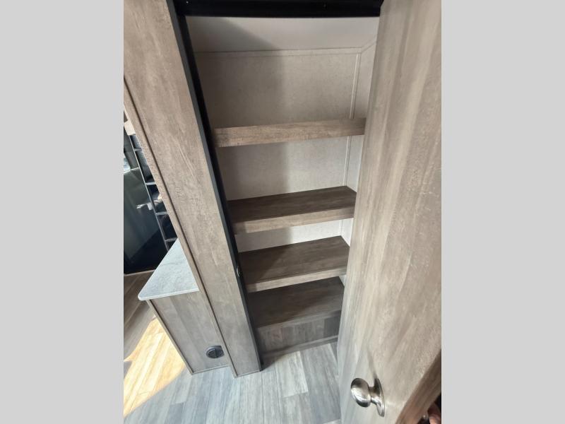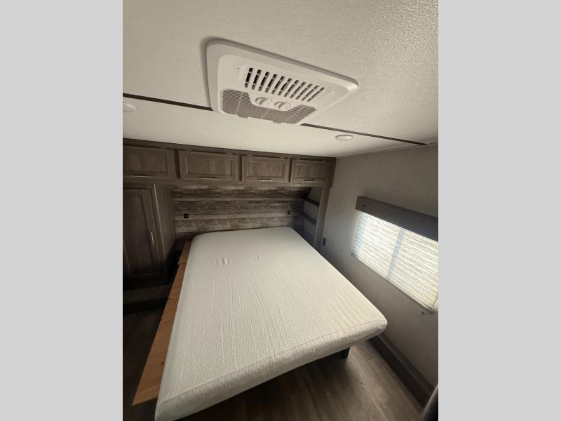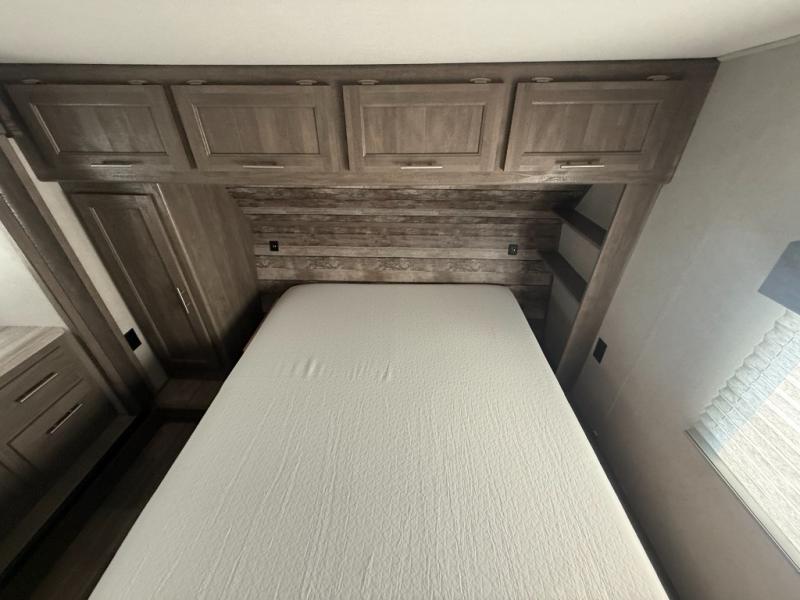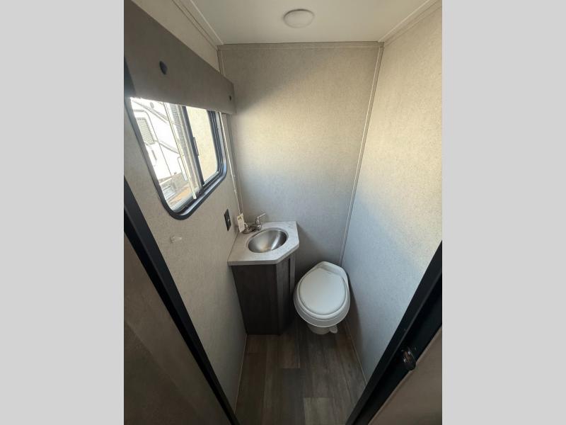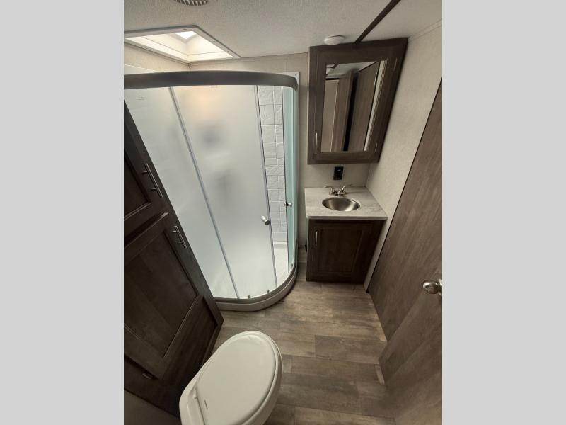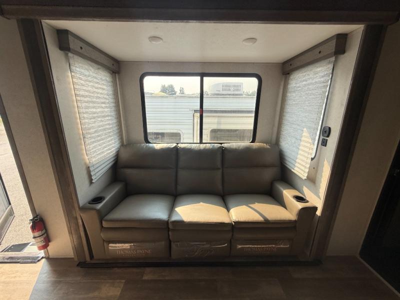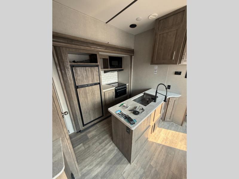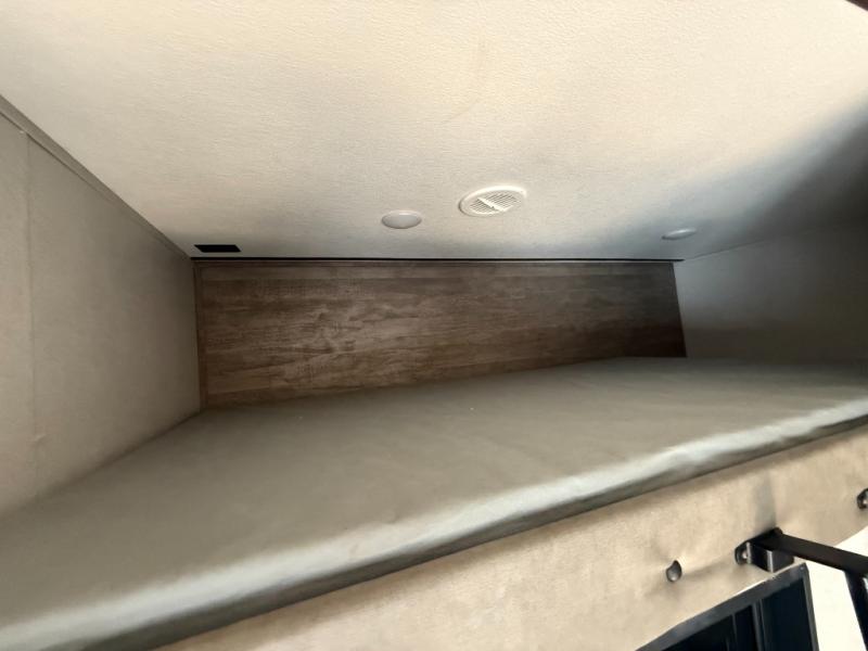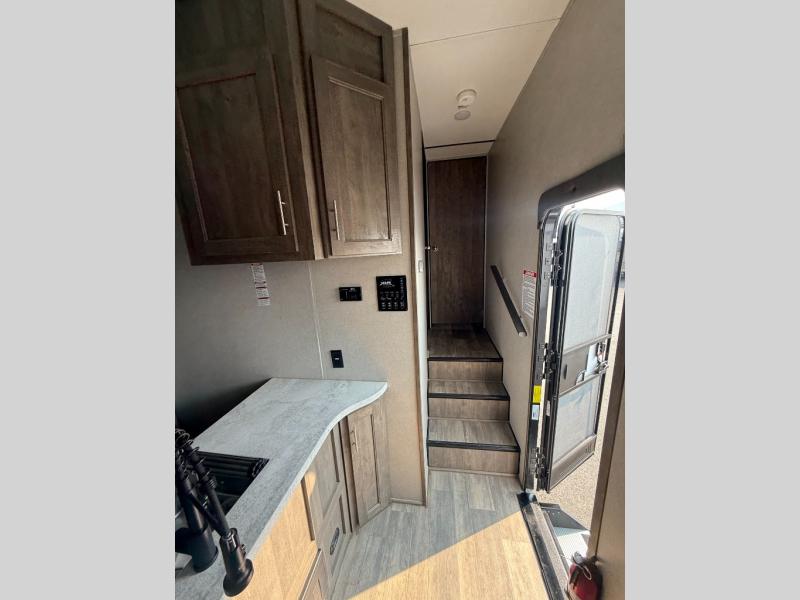 The whole gang can go action camping with you in this toy hauler if you add the optional electric bed and max clearance dinette to the enclosed 13' garage! There is also a loft in the garage, a 84" U-shaped dinette slide to enjoy your meals at and transform into an extra sleeping space, and a king bed inside the front private bedroom. The kitchen has a three burner cooktop, a microwave, and a 10 cu. ft. black stainless steel refrigerator to prepare your best home cooked meals. The dual entry doors make for a smooth flow of traffic in and out of the unit, and the bath and a half makes it easy for everyone to wash up for dinner!