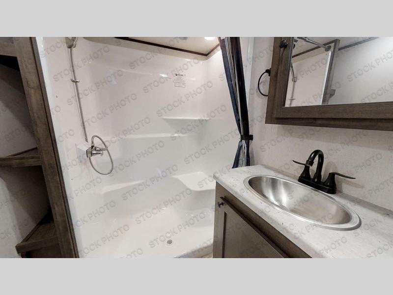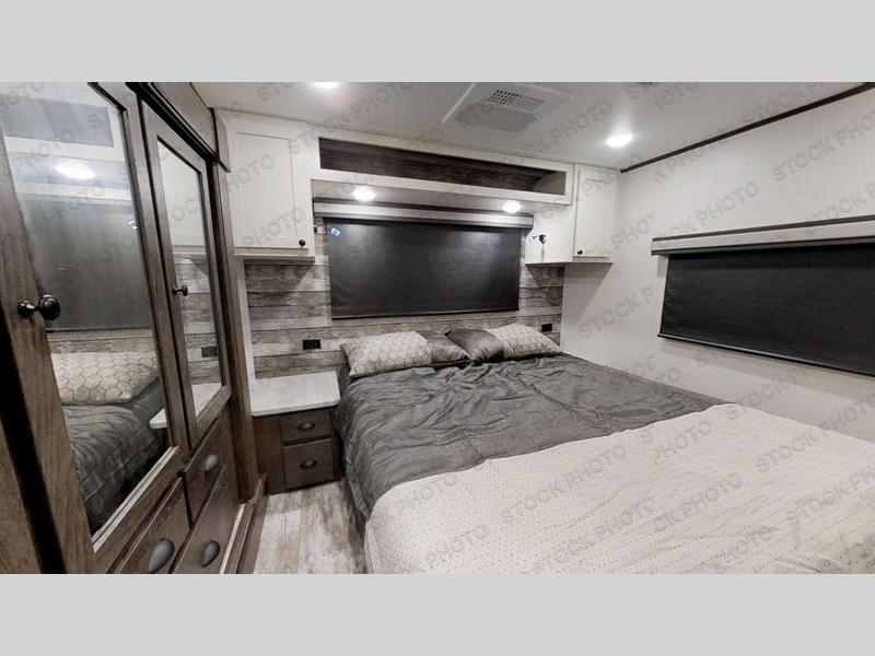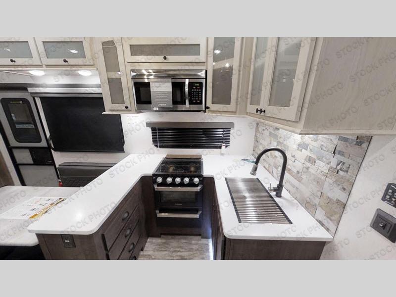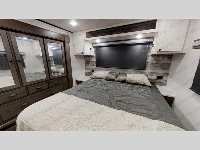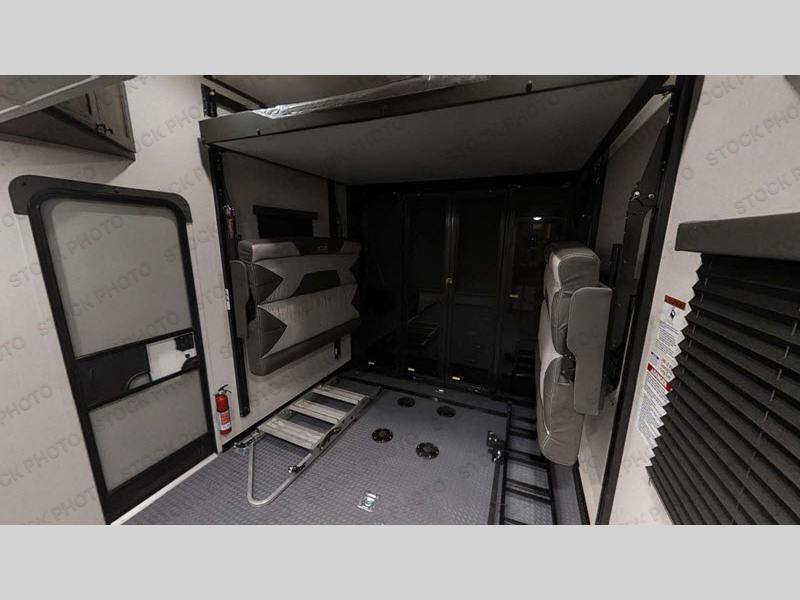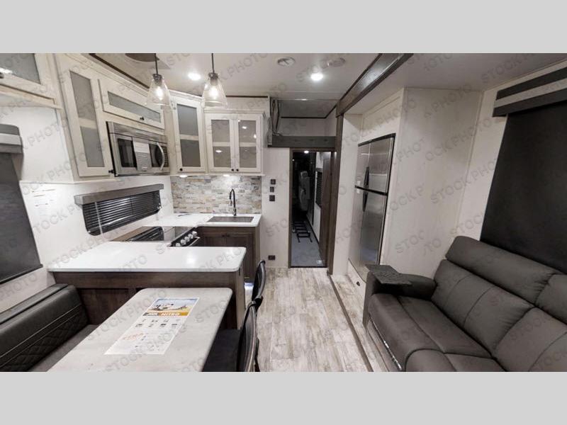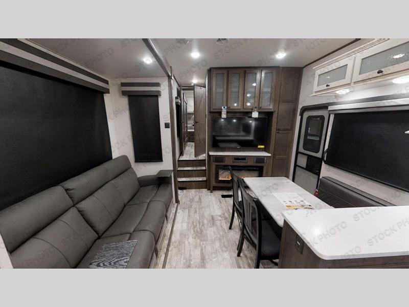 Whether you travel far or near to ride your toys, this fifth wheel offers enough space for nine to sleep at night! So if you travel with your spouse, your whole family or your buddies, you will enjoy the spacious interior including the garage with a side man door for quick access to your cargo and the electric queen bed with sofas and tables below making this a great hang out space after a ride. The main living area is spacious with a slide out sofa and residential refrigerator across from the kitchen amenities. There is a U-shaped counter with all the appliances needed to feed everyone warm meals including a residential microwave, and a dinette with bench seating and two chairs near the electric fireplace and 50" TV. At night, retire to your own front bedroom with a king-size bed and plenty of storage with a full bathroom only a few steps down the hallway.