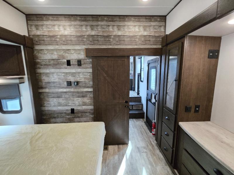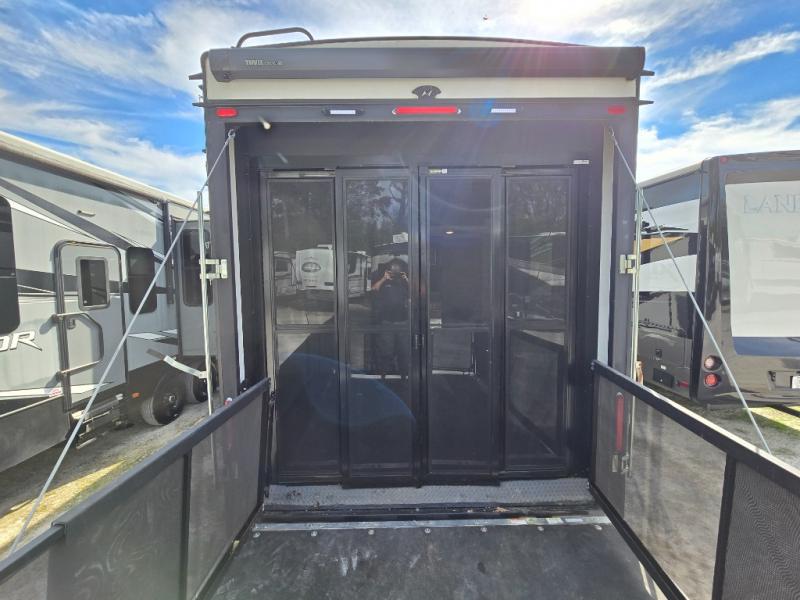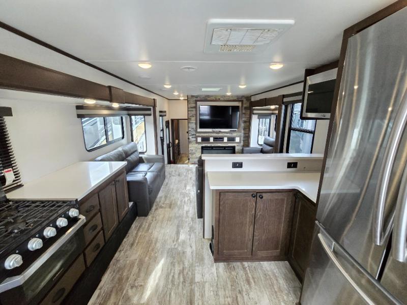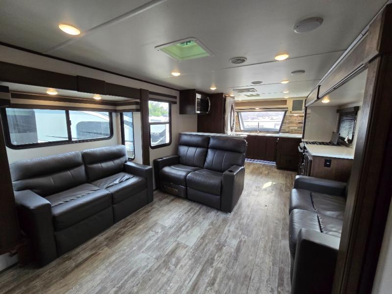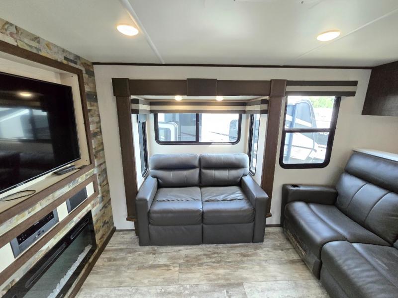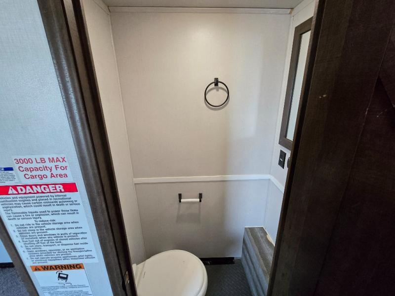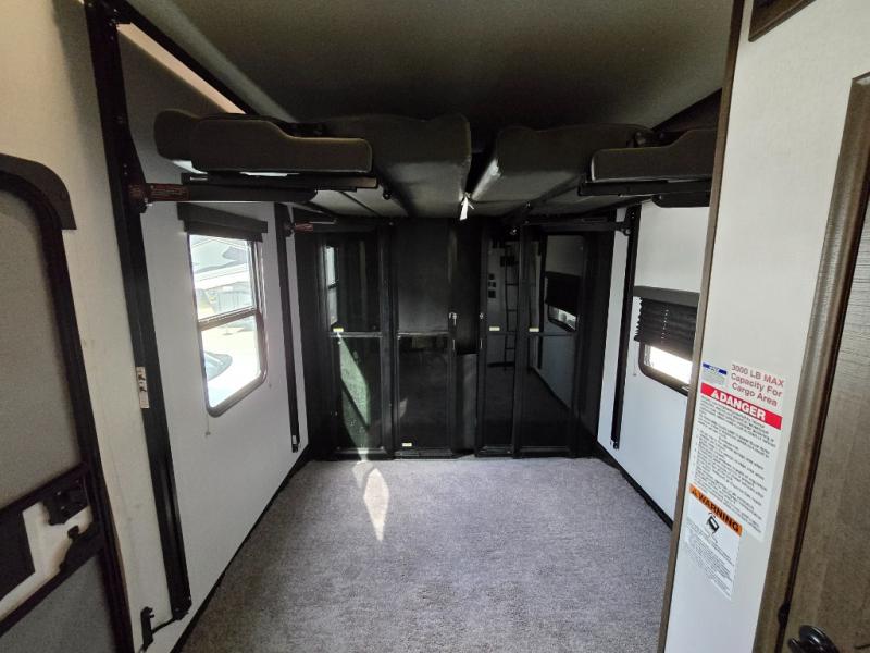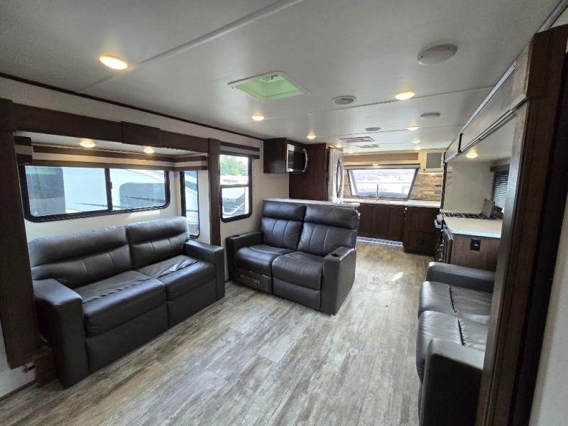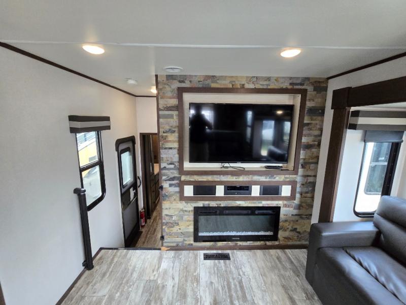 This fifth wheel toy hauler is popular for many reasons from the unique floorplan which offers a separate garage with a half bath, a side man door for easy access to your cargo, an electric queen bed with sofas and tables below plus 11' of cargo space to the walk-through bedroom with dual slides for more floor space, a queen size-bed and a full bathroom in the middle of the fifth wheel. The separate living area offers three sofas to relax on, an electric fireplace and 50" TV for inside entertainment, and the separate kitchen gives the cook lots of counter space, a window with a view, a residential refrigerator and microwave, plus more! You can even watch a game on the exterior TV while enjoying the great outdoors as you wait your turn on your toys or to get cleaned up in the shower with a seat.