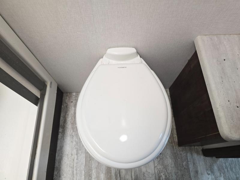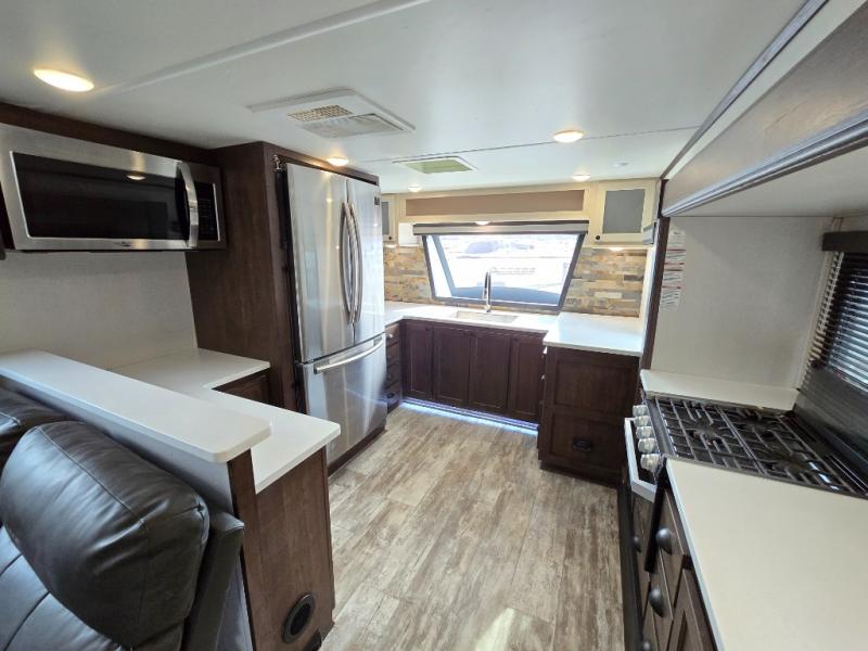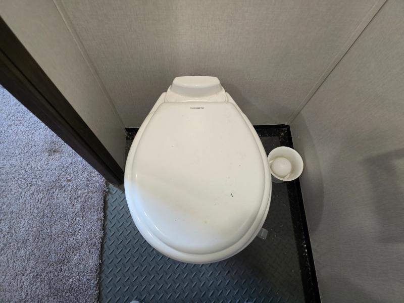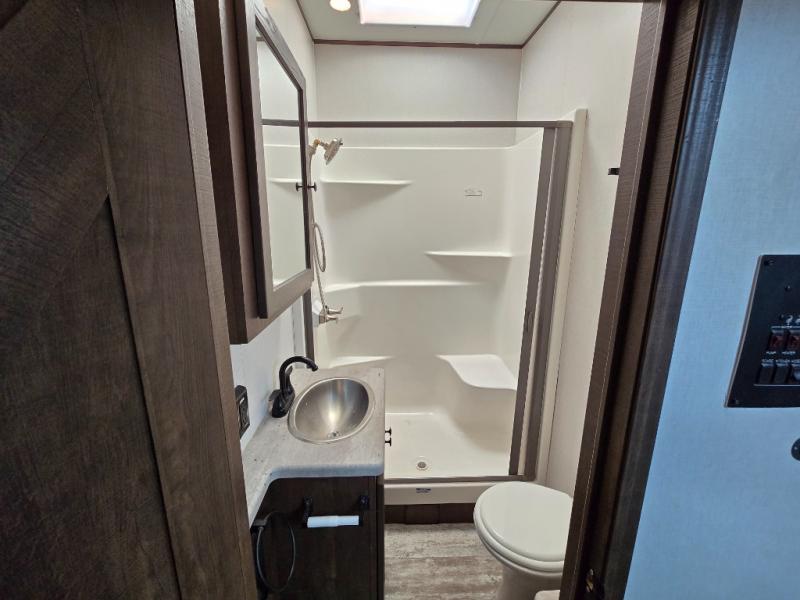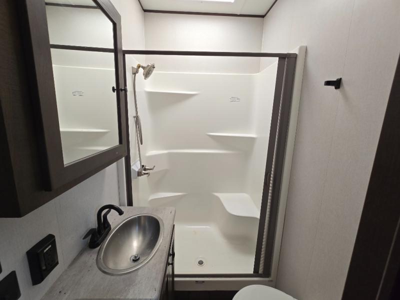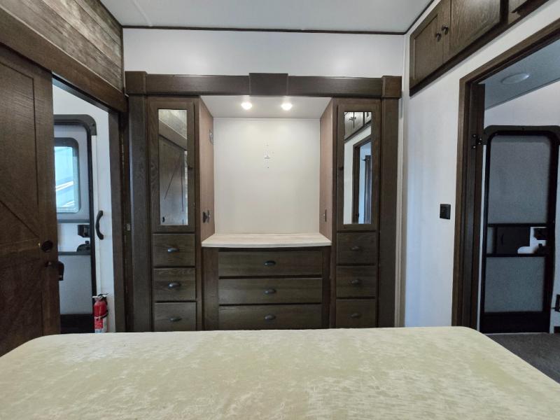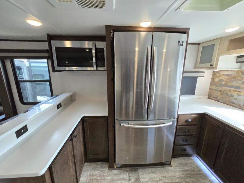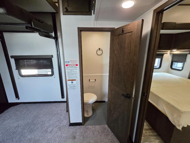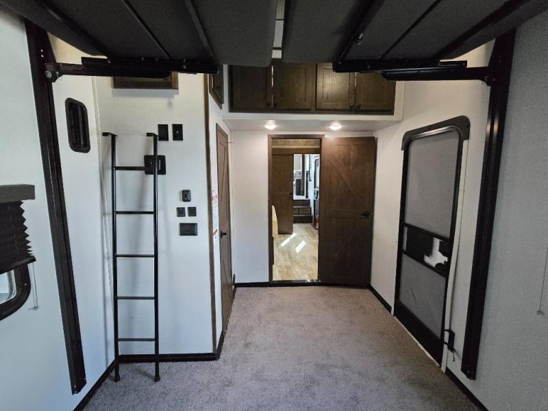 This fifth wheel toy hauler is popular for many reasons from the unique floorplan which offers a separate garage with a half bath, a side man door for easy access to your cargo, an electric queen bed with sofas and tables below plus 11' of cargo space to the walk-through bedroom with dual slides for more floor space, a queen size-bed and a full bathroom in the middle of the fifth wheel. The separate living area offers three sofas to relax on, an electric fireplace and 50" TV for inside entertainment, and the separate kitchen gives the cook lots of counter space, a window with a view, a residential refrigerator and microwave, plus more! You can even watch a game on the exterior TV while enjoying the great outdoors as you wait your turn on your toys or to get cleaned up in the shower with a seat.