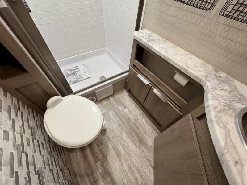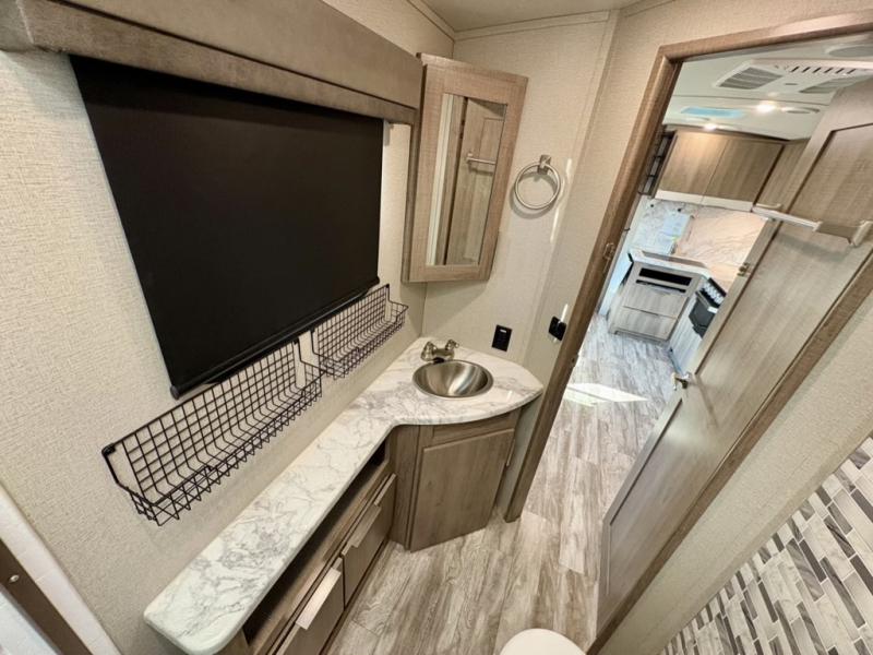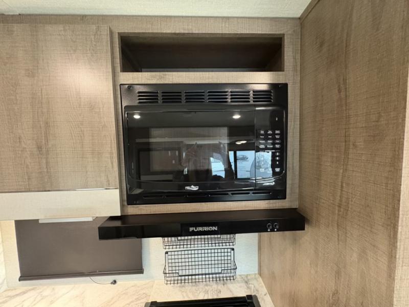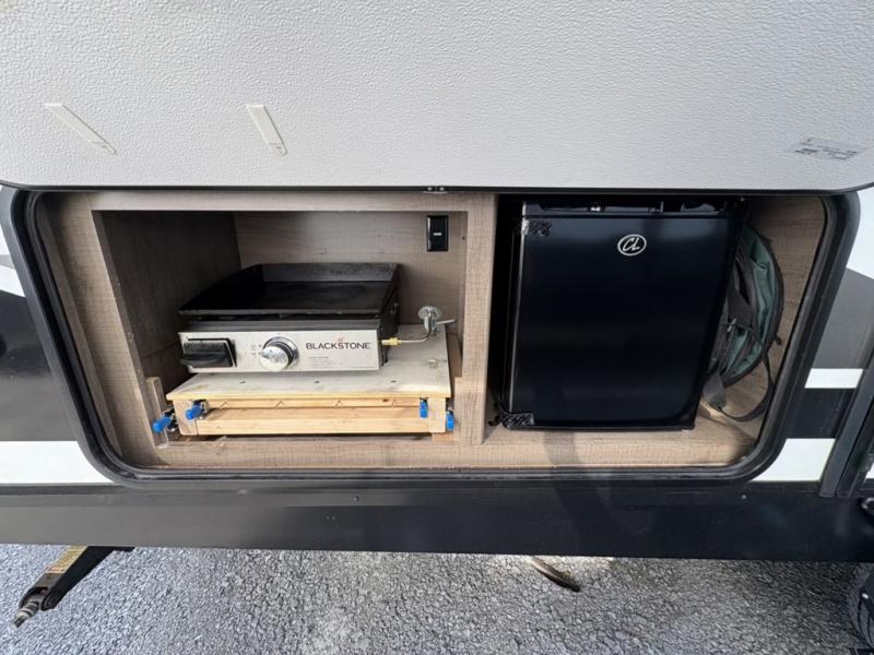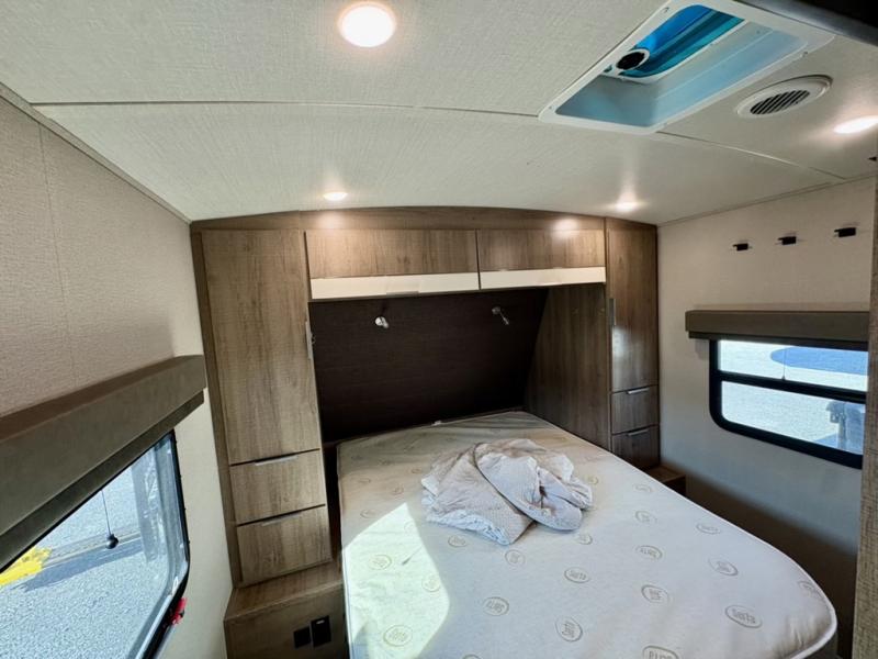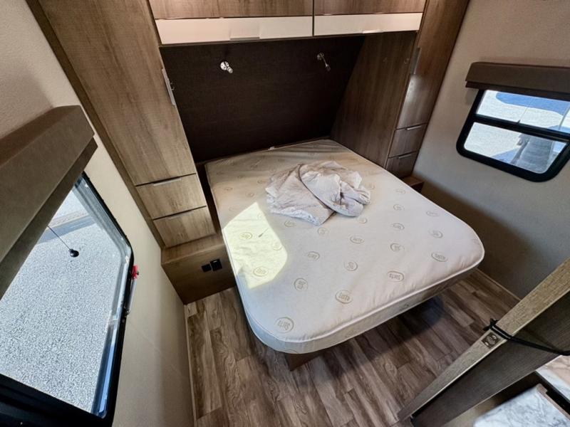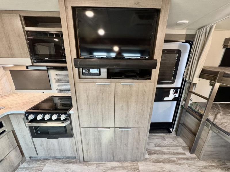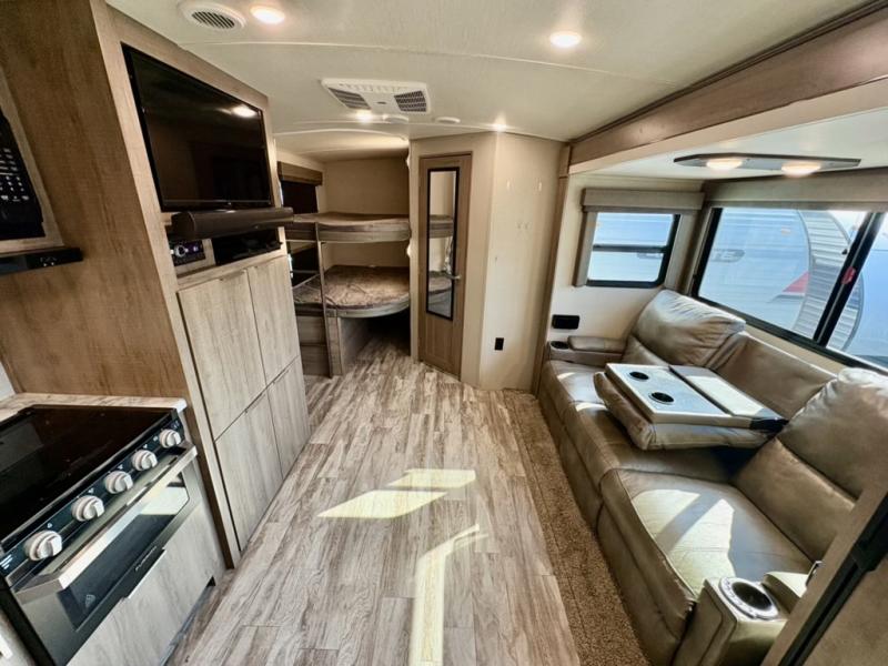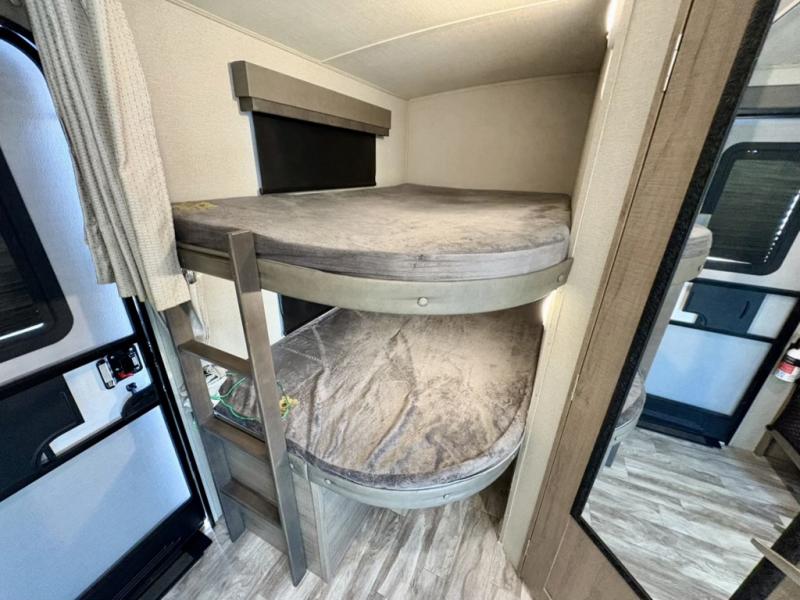 The kids are ready for camping fun in this family friendly trailer! Easily hitch up and head out to the state park, RV resort or your friend's land to enjoy inside comforts and outdoor adventure. The pass-through storage allows you to stow away the larger items like camping chairs, tables and fishing poles while inside you will find plenty of storage in the bathroom linen cabinet, the entry wardrobe/pantry, the dual wardrobes in the master suite and the overhead cabinets throughout. The kids will claim the double size bunks for themselves that also includes a ladder and privacy curtains, plus there is bike storage below. Everyone can take turns getting cleaned up in the full bathroom before dining at the U-shaped dinette or choose the optional theatre dinette in its place. And the L-shaped kitchen offers everything at your fingertips and the LED HDTV is on a mount giving you the perfect viewing position. You might even like to make several meals using the outside kitchen while relaxing under the 21' awning.