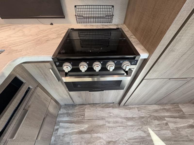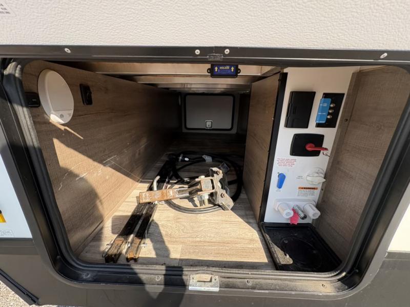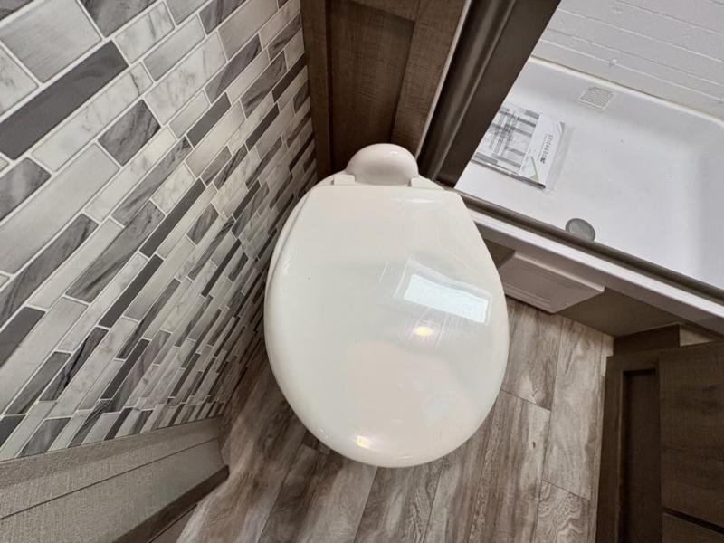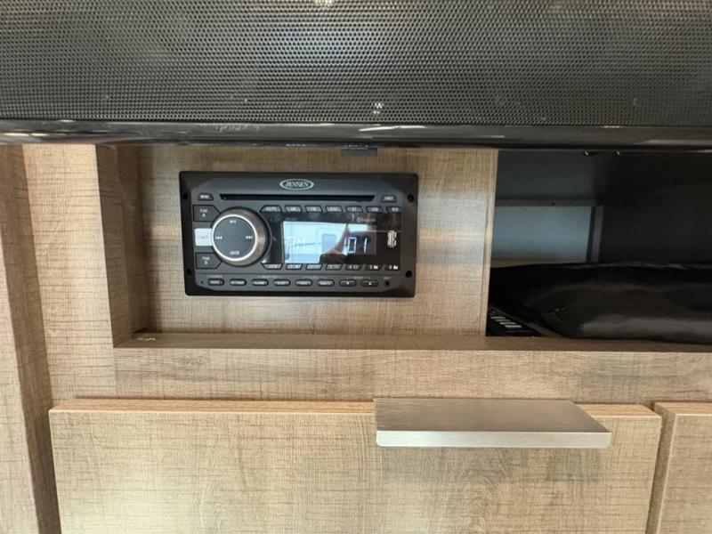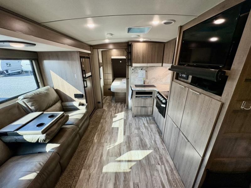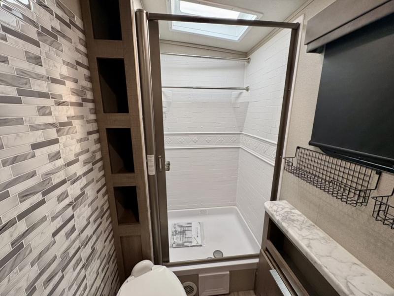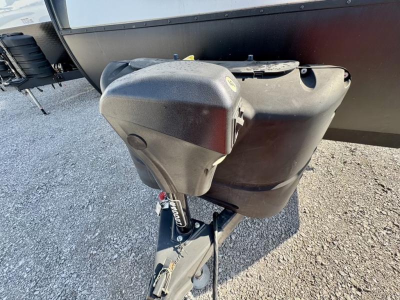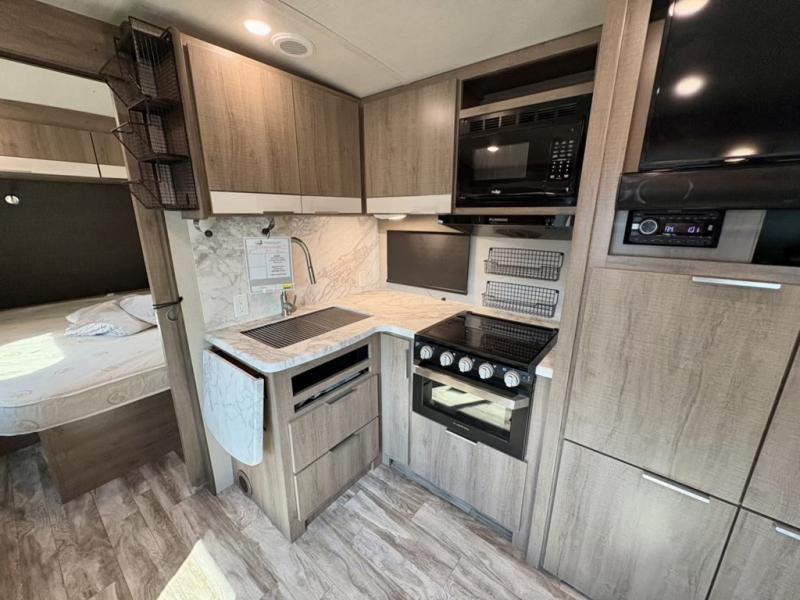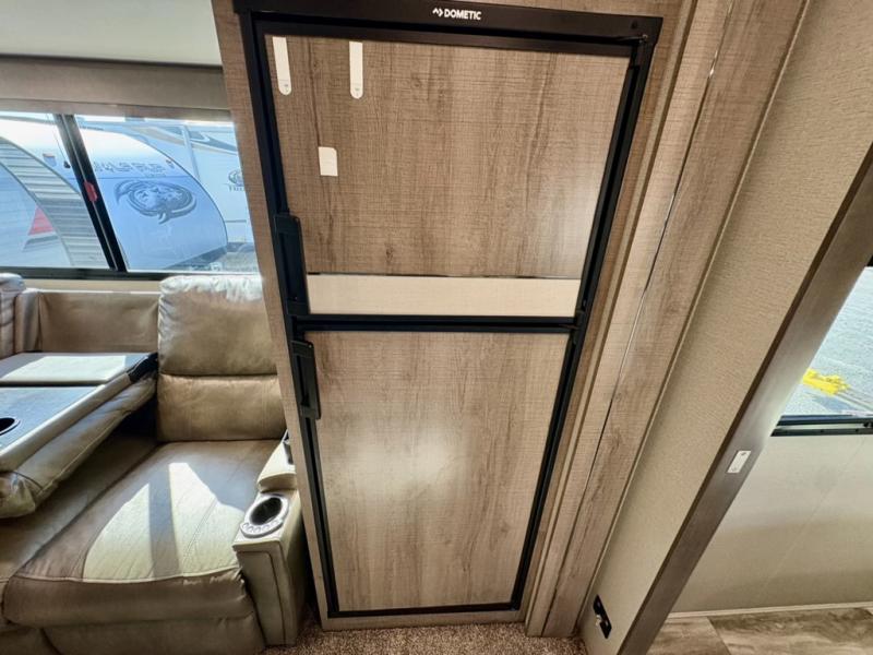 The kids are ready for camping fun in this family friendly trailer! Easily hitch up and head out to the state park, RV resort or your friend's land to enjoy inside comforts and outdoor adventure. The pass-through storage allows you to stow away the larger items like camping chairs, tables and fishing poles while inside you will find plenty of storage in the bathroom linen cabinet, the entry wardrobe/pantry, the dual wardrobes in the master suite and the overhead cabinets throughout. The kids will claim the double size bunks for themselves that also includes a ladder and privacy curtains, plus there is bike storage below. Everyone can take turns getting cleaned up in the full bathroom before dining at the U-shaped dinette or choose the optional theatre dinette in its place. And the L-shaped kitchen offers everything at your fingertips and the LED HDTV is on a mount giving you the perfect viewing position. You might even like to make several meals using the outside kitchen while relaxing under the 21' awning.