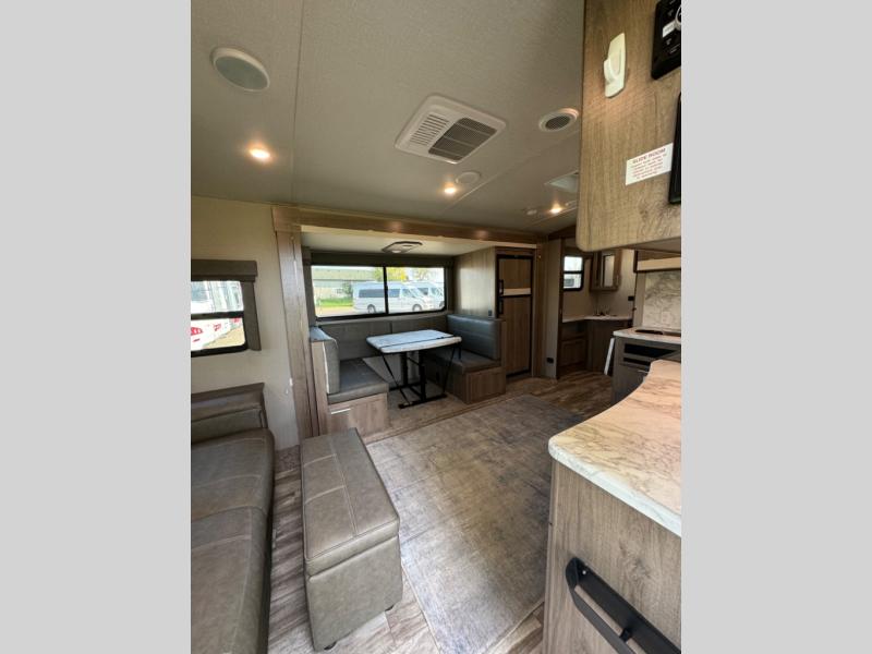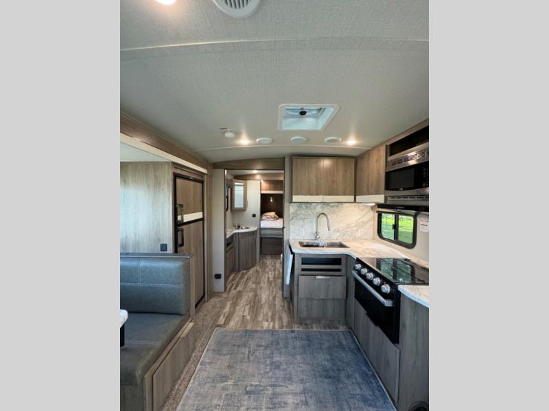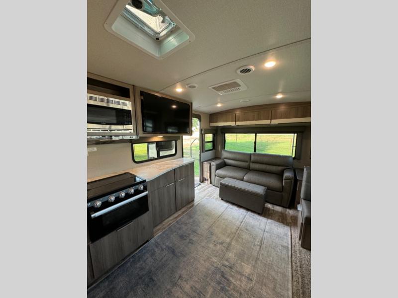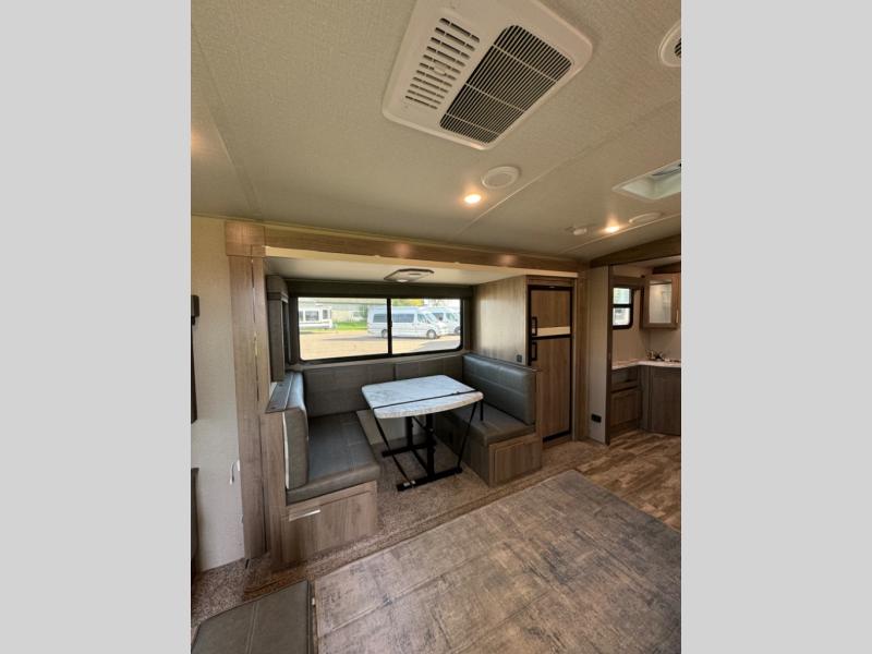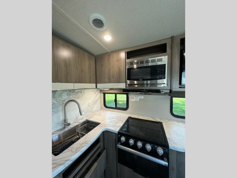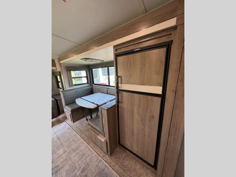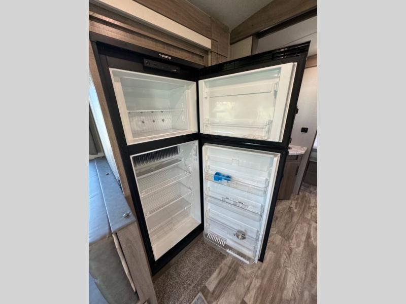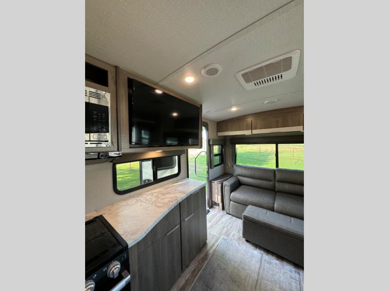 You and your spouse will love this trailer with its master suite in the front which includes the second exterior entry, and a space savings sliding interior door with quick access to the walk-through bathroom. You can dine at the U-shaped dinette with removable ottoman to relax your legs or choose the optional free standing dinette in its place. The rear tri-fold sofa gives you a place to unwind after hiking the trials or making dinner in the L-shaped kitchen which includes a counter extension for extra space to dry dishes or serve food. And the LED TV provides inside entertainment with a pantry behind it to hold all your snacks.