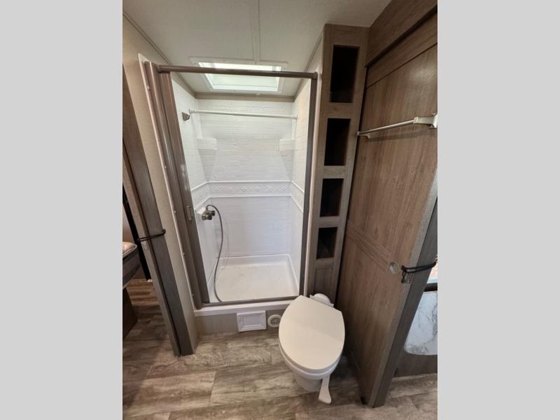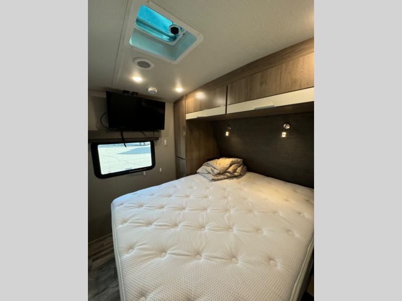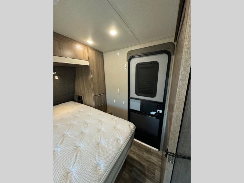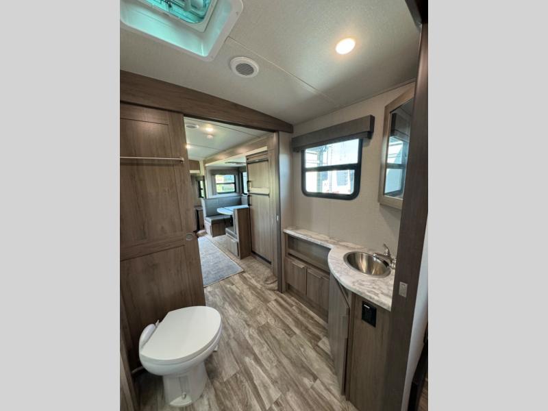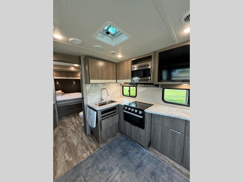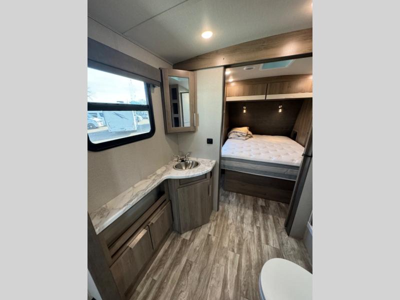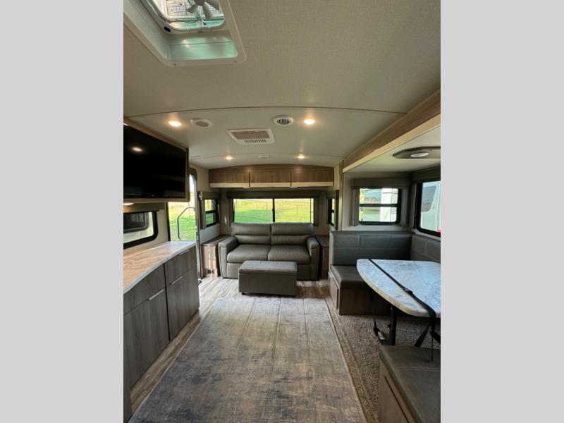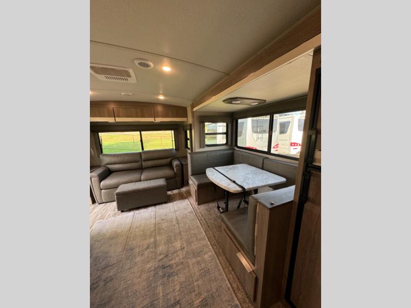 You and your spouse will love this trailer with its master suite in the front which includes the second exterior entry, and a space savings sliding interior door with quick access to the walk-through bathroom. You can dine at the U-shaped dinette with removable ottoman to relax your legs or choose the optional free standing dinette in its place. The rear tri-fold sofa gives you a place to unwind after hiking the trials or making dinner in the L-shaped kitchen which includes a counter extension for extra space to dry dishes or serve food. And the LED TV provides inside entertainment with a pantry behind it to hold all your snacks.