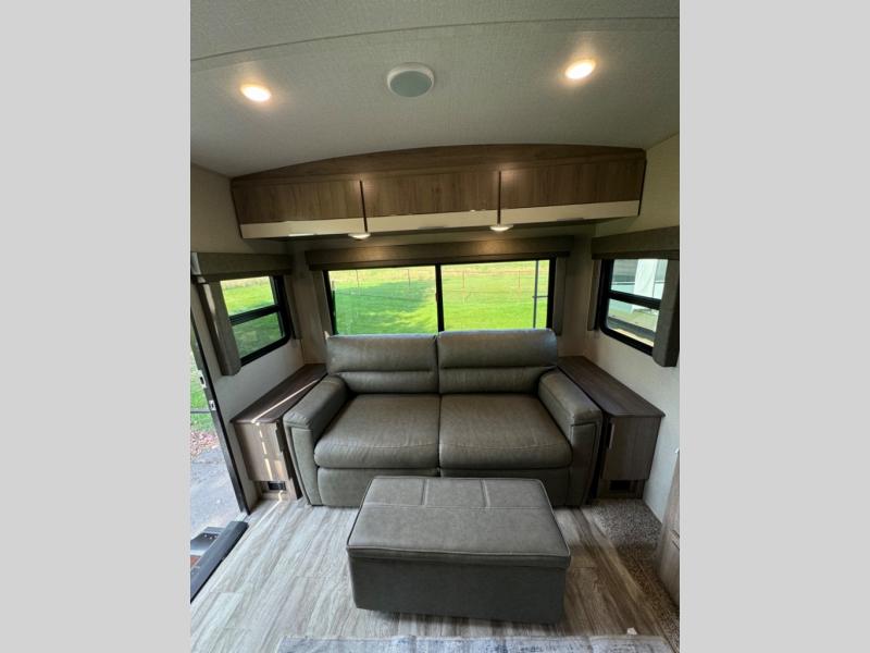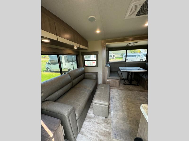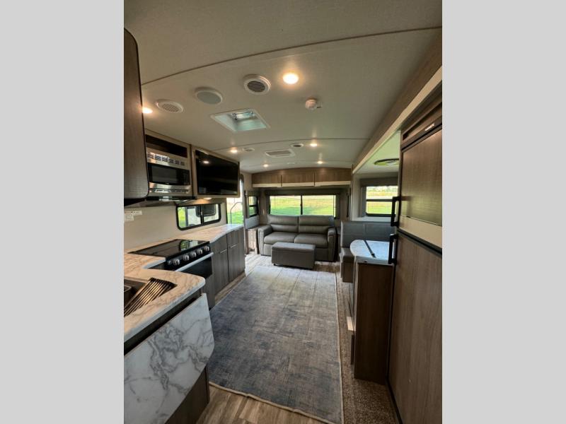 With any Imagine by Grand Design the construction includes a laminated aluminum framed main floor, rear wall, side walls, roof and end walls in the slide rooms and floors, plus a one-piece roof membrane giving you years of lightweight towing to your favorite destinations. Best in class storage is found in the exclusive drop frame unobstructed pass through storage, and the Universal Docking station offers an all-in-one location for utilities and hookups, plus you will find industry leading tank capacities and extended season camping with the mandatory four-season protection package. Inside you will experience residential cabinetry and a pull-down sprayer kitchen faucet, upgraded residential furniture and countertops, plus much more with an 81" radius ceiling for a spacious interior. Choose your favorite Imagine today, and start adventuring in a lightweight and comfortable trailer!