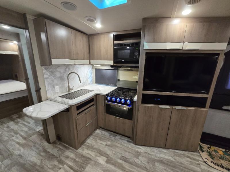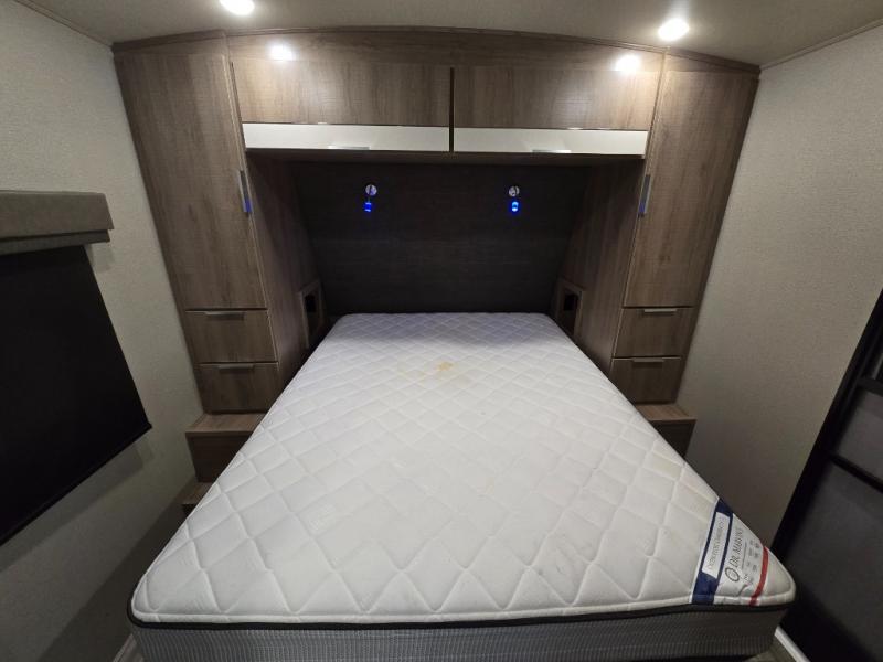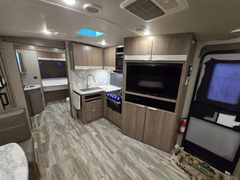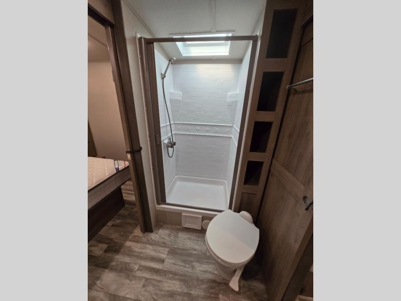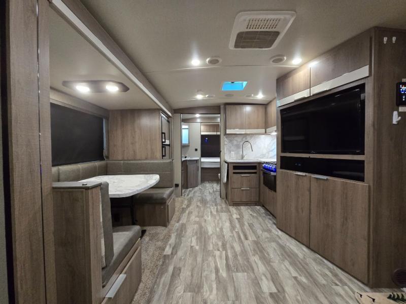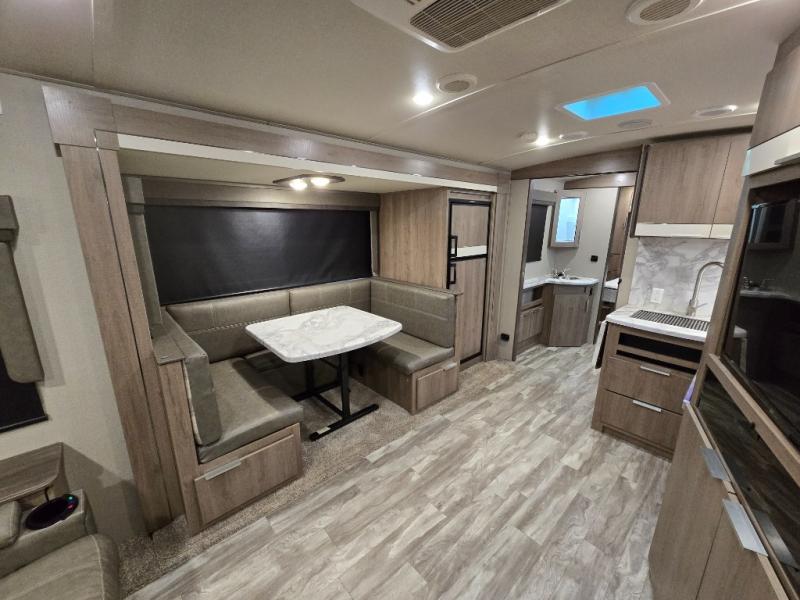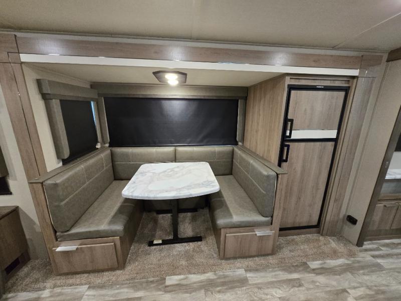 You and your spouse will love this trailer with its master suite in the front which includes the second exterior entry, and a space savings sliding interior door with quick access to the walk-through bathroom. You can dine at the U-shaped dinette with removable ottoman to relax your legs or choose the optional free standing dinette in its place. The rear tri-fold sofa gives you a place to unwind after hiking the trials or making dinner in the L-shaped kitchen which includes a counter extension for extra space to dry dishes or serve food. And the LED TV provides inside entertainment with a pantry behind it to hold all your snacks.