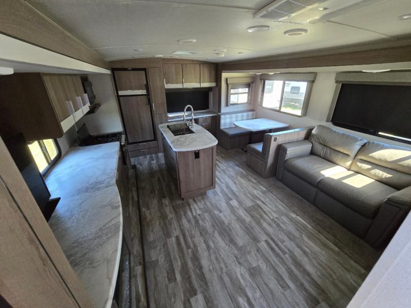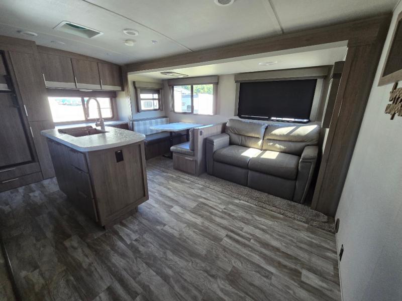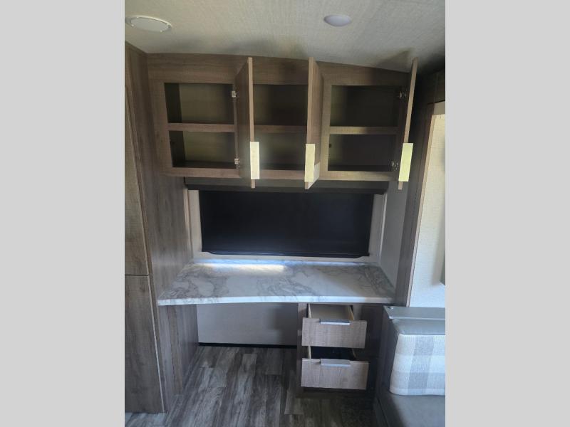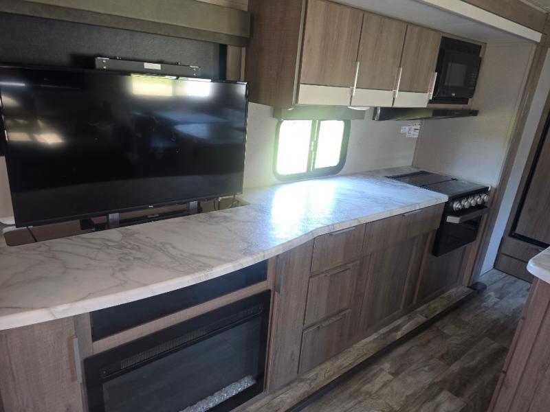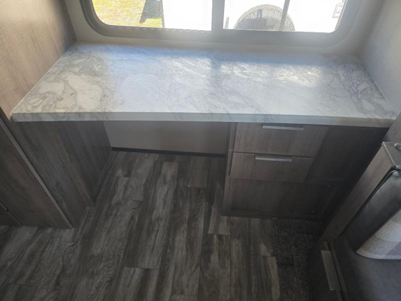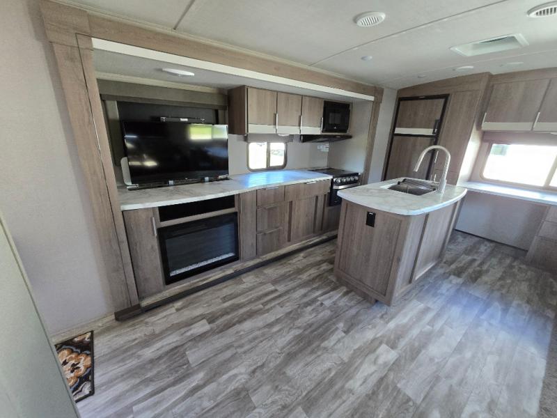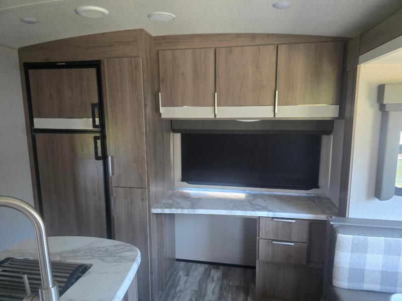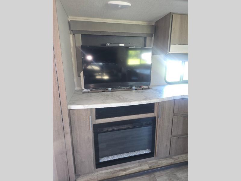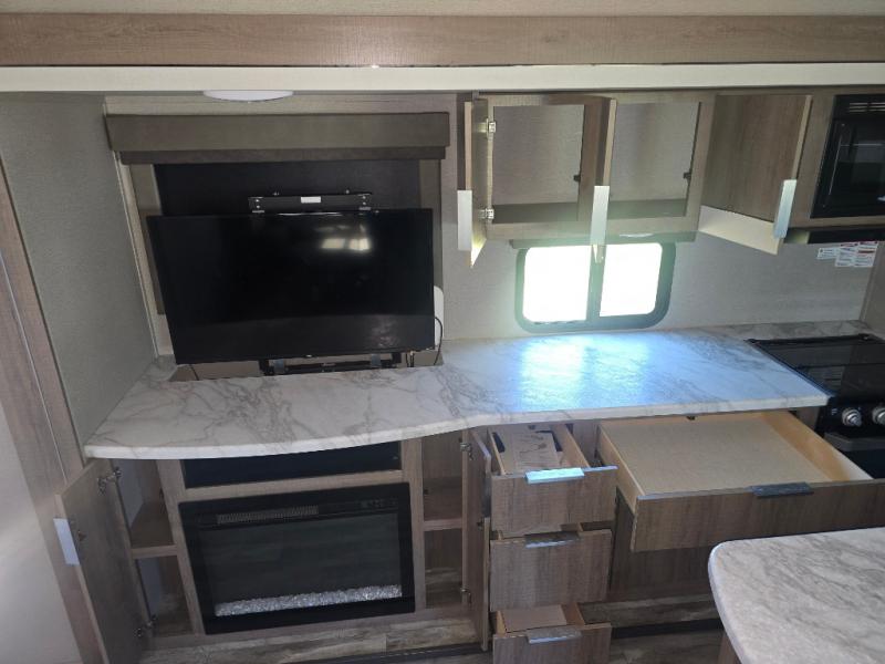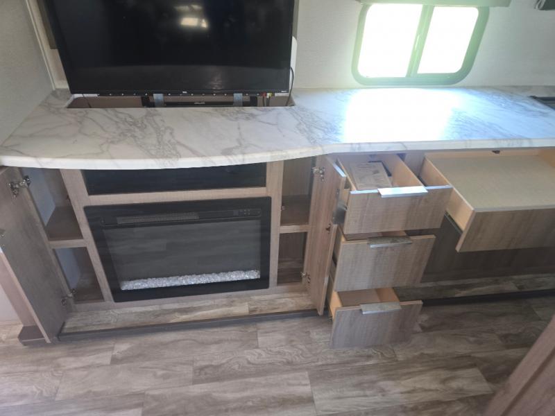 How does a desk with a view sound in your next travel trailer? You can work remotely or check your social media from the desk which is next to the pantry so you can easily grab a snack whenever you like. And your best friend can be eating from the pet dish under the refrigerator. The cook will enjoy having the kitchen island to prepare and serve meals as well as dry dishes next to the sink. They might like to make a few meals on the outside kitchen and store extra drinks in the 1.6 cu. ft. outdoor refrigerator. Everyone else can relax under the 21' power adjustable awning. Inside there are two slides outs in the living and kitchen area offering a spacious place to relax on the tri-fold sofa and booth dinette while watching the telescoping 40" TV with fireplace below before getting cleaned up in the full bathroom. And the master suite with a walk-around queen bed and lots of clothing storage will be calling your name after a fun day exploring outdoors, working, and/or visiting with other RVers.
