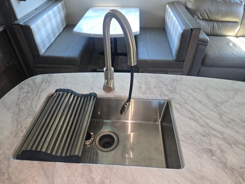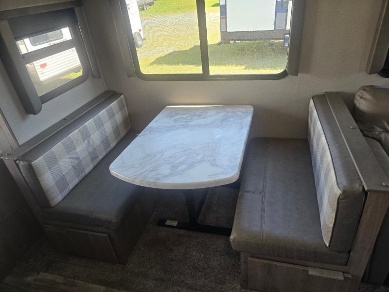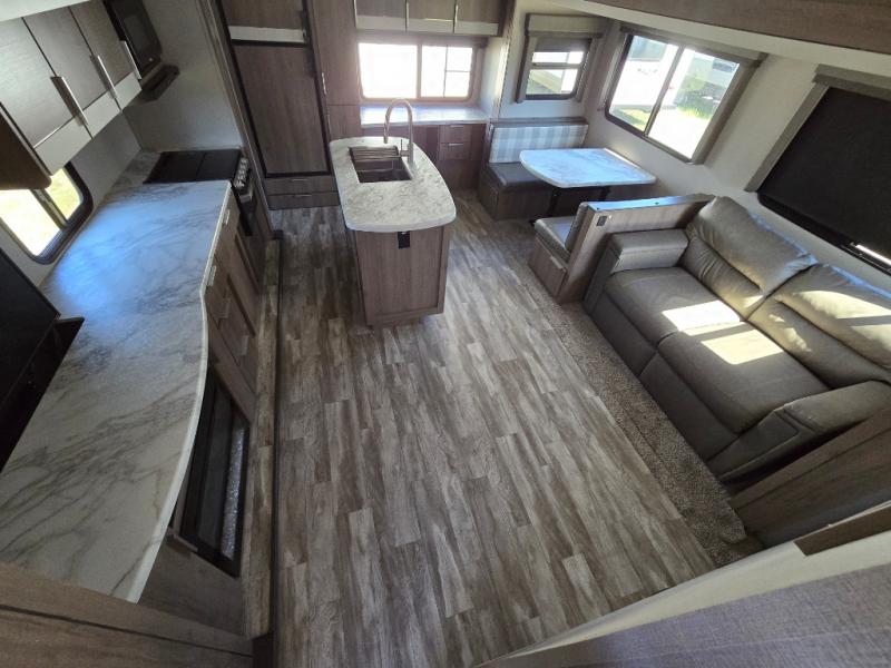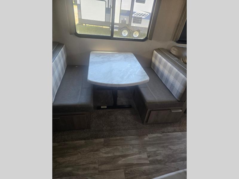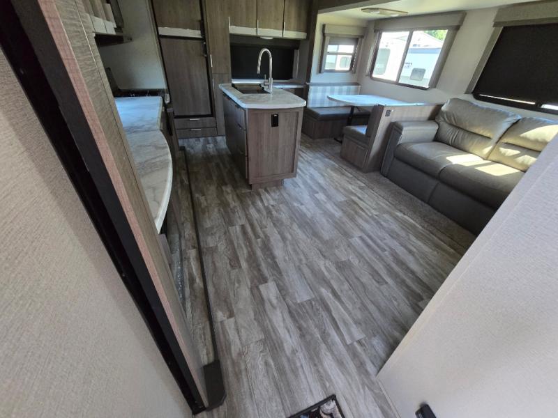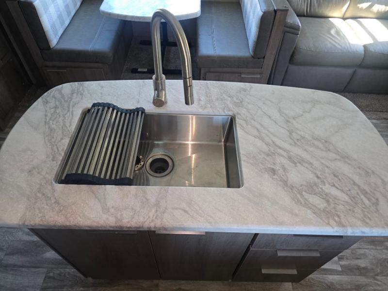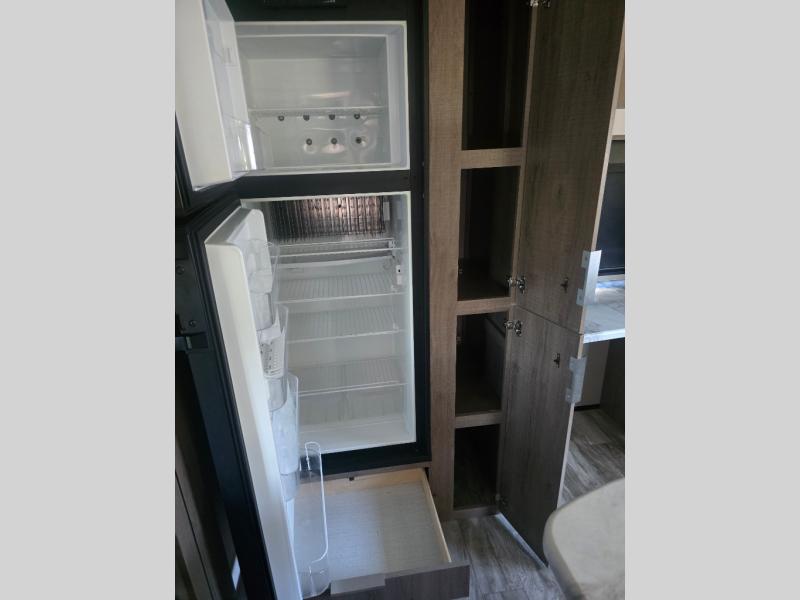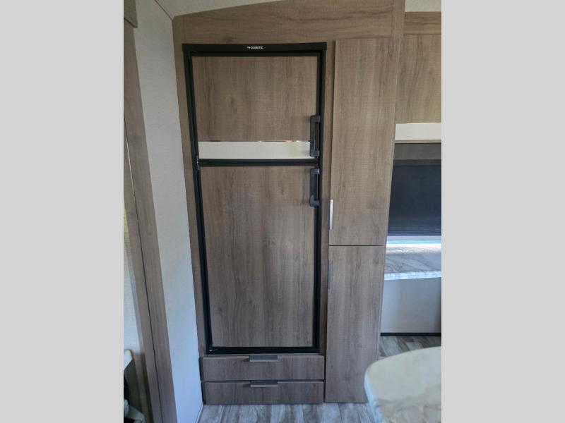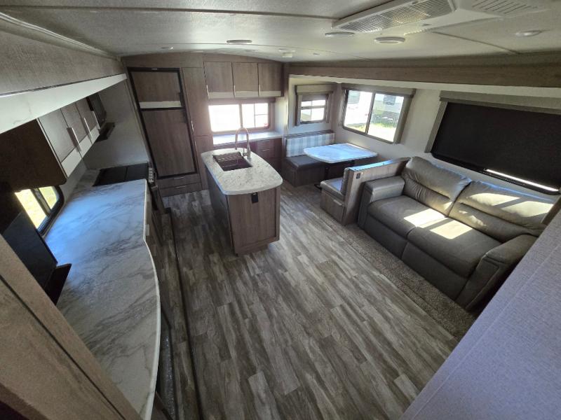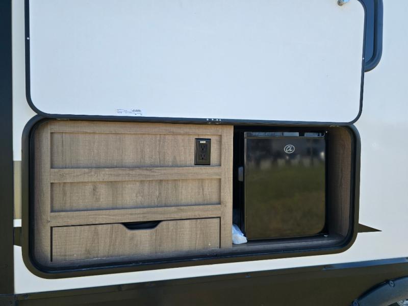 How does a desk with a view sound in your next travel trailer? You can work remotely or check your social media from the desk which is next to the pantry so you can easily grab a snack whenever you like. And your best friend can be eating from the pet dish under the refrigerator. The cook will enjoy having the kitchen island to prepare and serve meals as well as dry dishes next to the sink. They might like to make a few meals on the outside kitchen and store extra drinks in the 1.6 cu. ft. outdoor refrigerator. Everyone else can relax under the 21' power adjustable awning. Inside there are two slides outs in the living and kitchen area offering a spacious place to relax on the tri-fold sofa and booth dinette while watching the telescoping 40" TV with fireplace below before getting cleaned up in the full bathroom. And the master suite with a walk-around queen bed and lots of clothing storage will be calling your name after a fun day exploring outdoors, working, and/or visiting with other RVers.
